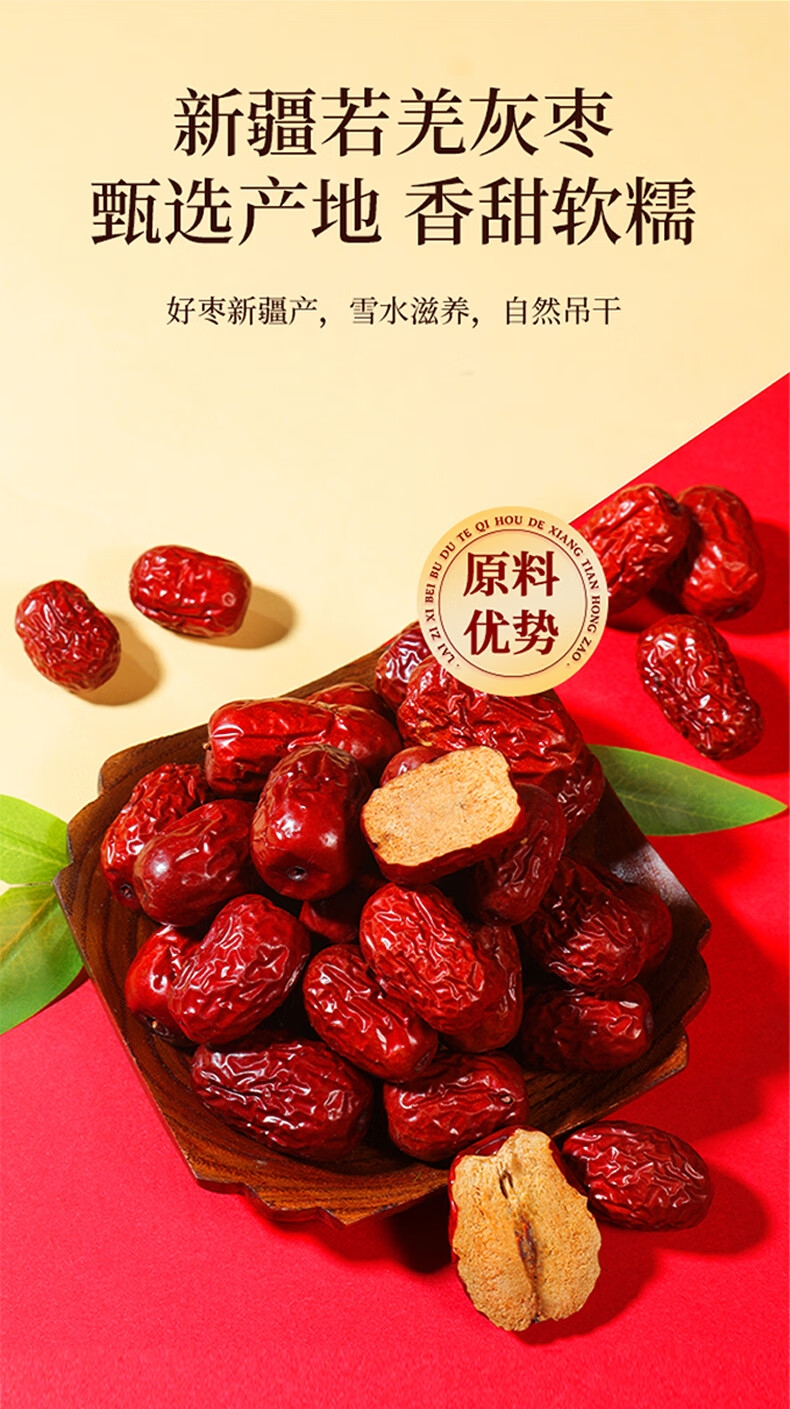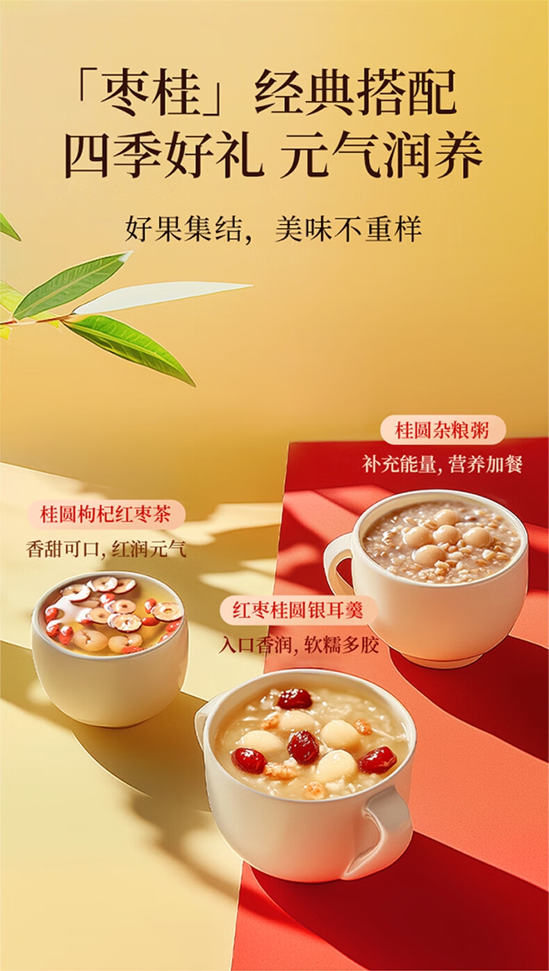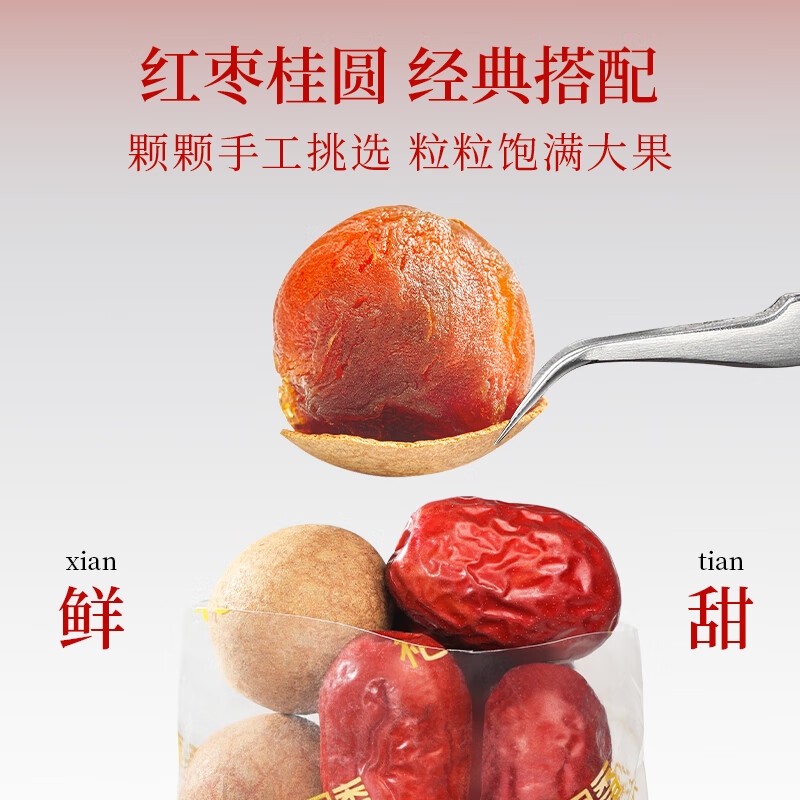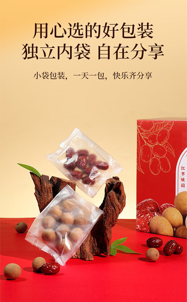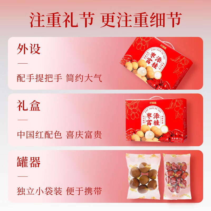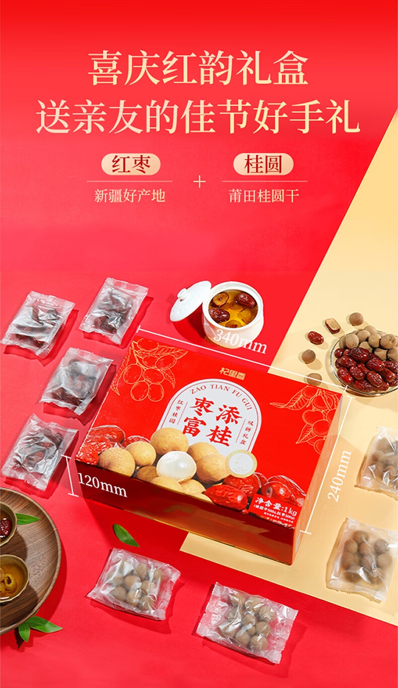 精选新疆若羌灰枣、福建莆田桂圆干,道地食材品质保证;1kg大分量礼盒装,送礼有面,自用实惠;独立小袋装,更耐保存,食用更放心