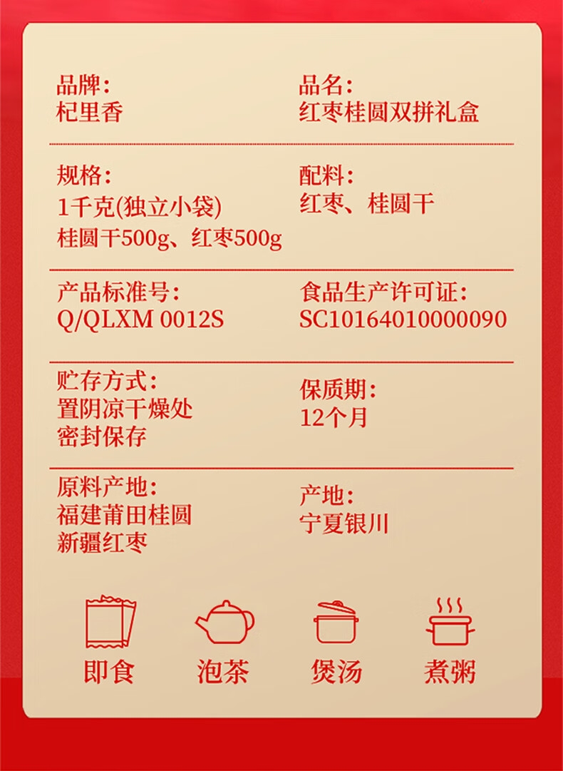 配置清单:红枣500g,桂圆500g,礼盒*1