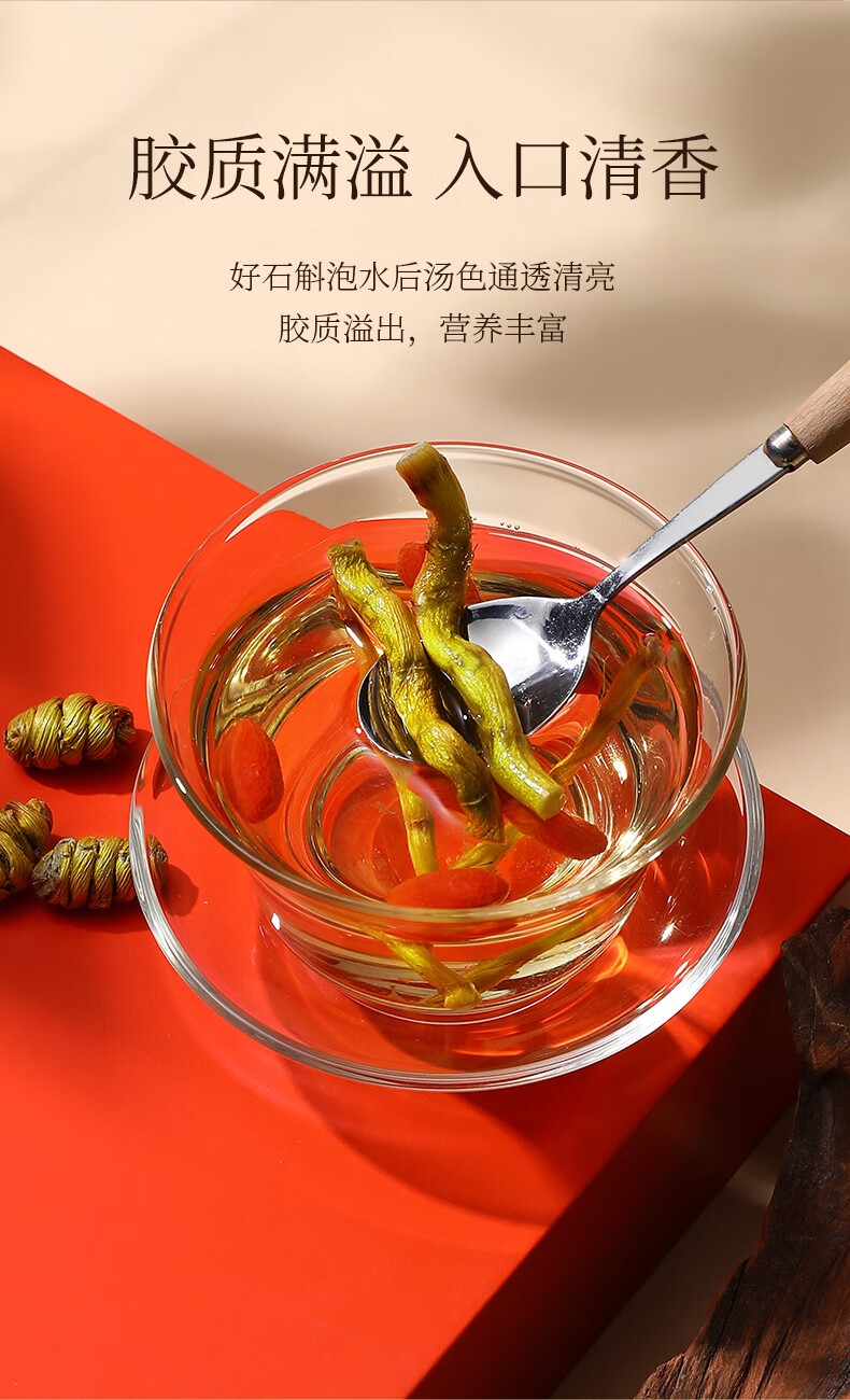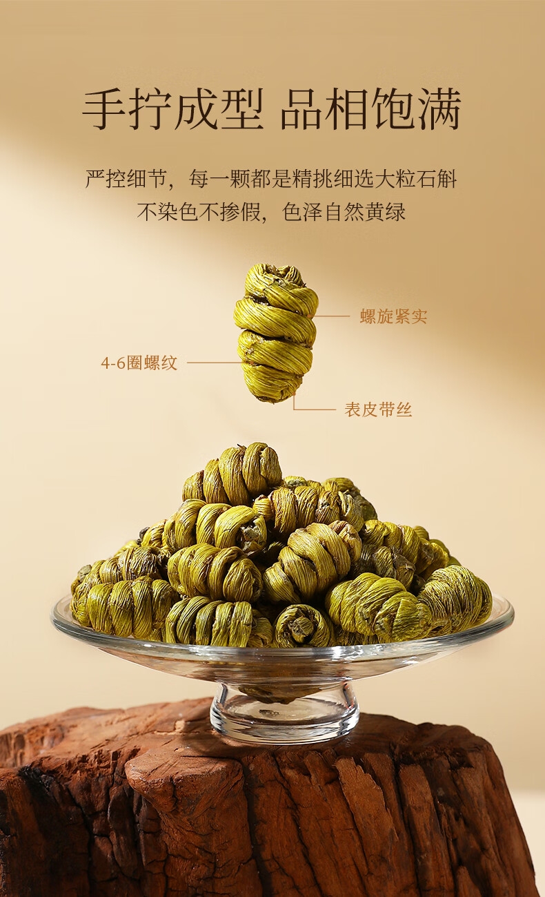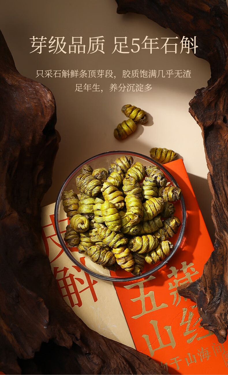 雁荡山产地,5年足龄石斛,仿野生林下种植,品质保证;只选产量更少的顶部嫩芽,鲜嫩多胶,几乎无渣;螺纹整洁紧密,质地饱满,颗粒干净