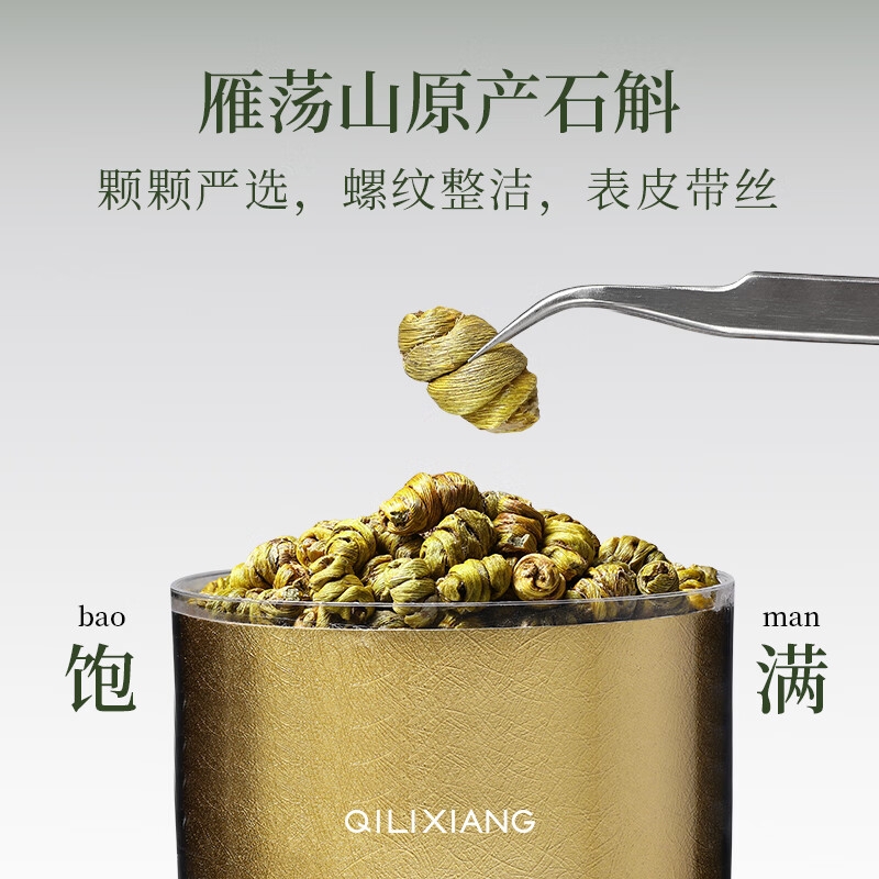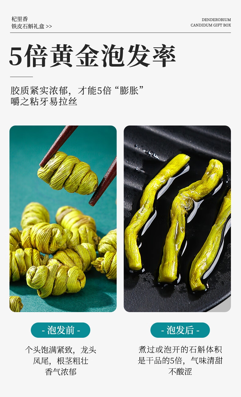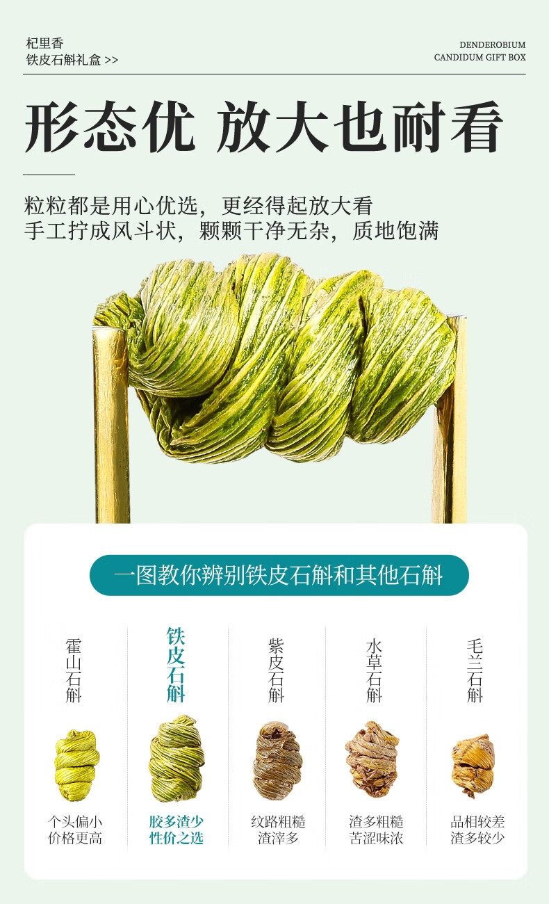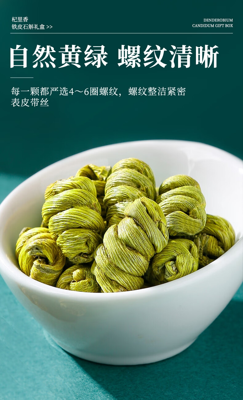 雁荡山产地,5年足龄石斛,仿野生林下种植,品质保证;只选产量更少的顶部嫩芽,鲜嫩多胶,几乎无渣;螺纹整洁紧密,质地饱满,颗粒干净