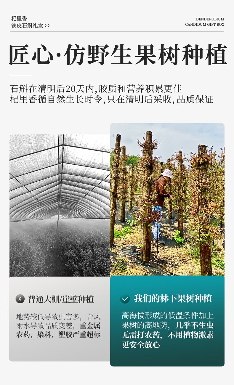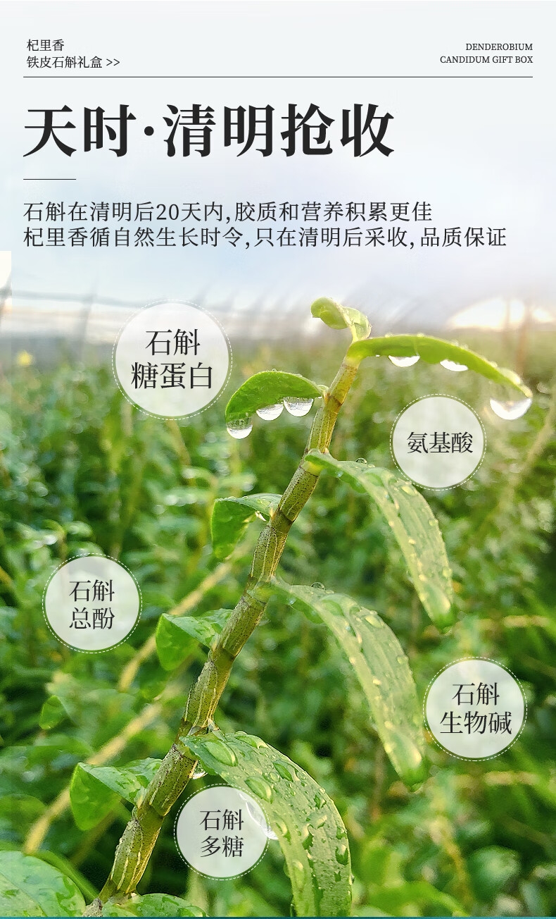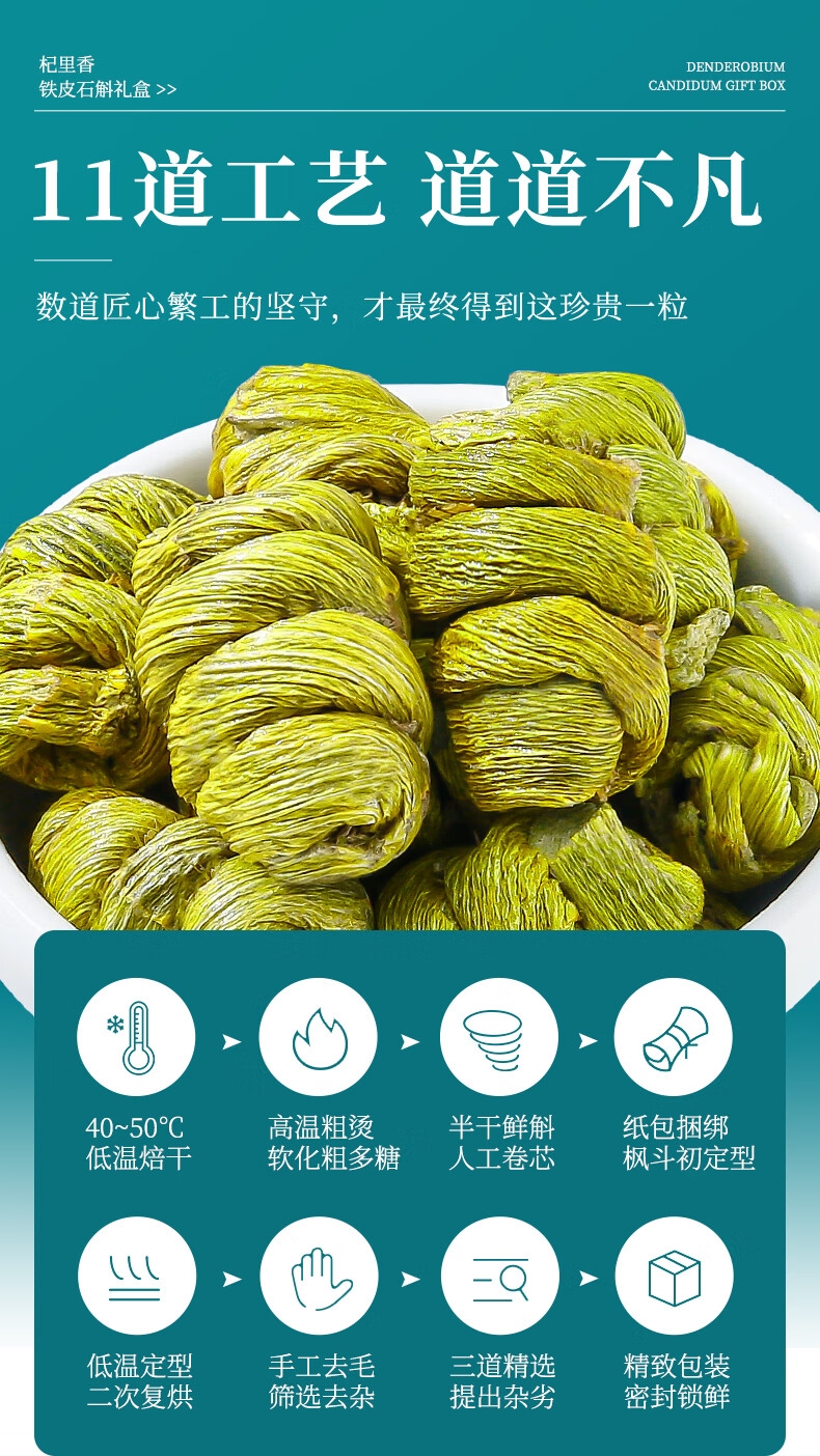 雁荡山产地,5年足龄石斛,仿野生林下种植,品质保证;只选产量更少的顶部嫩芽,鲜嫩多胶,几乎无渣;螺纹整洁紧密,质地饱满,颗粒干净
