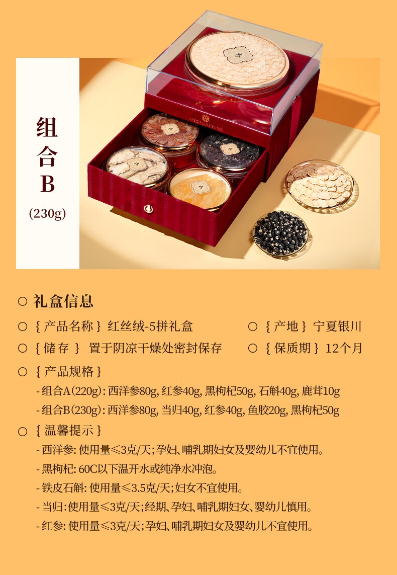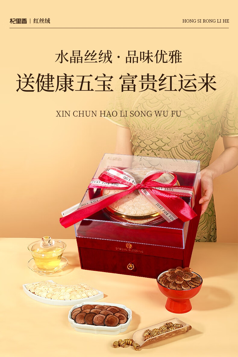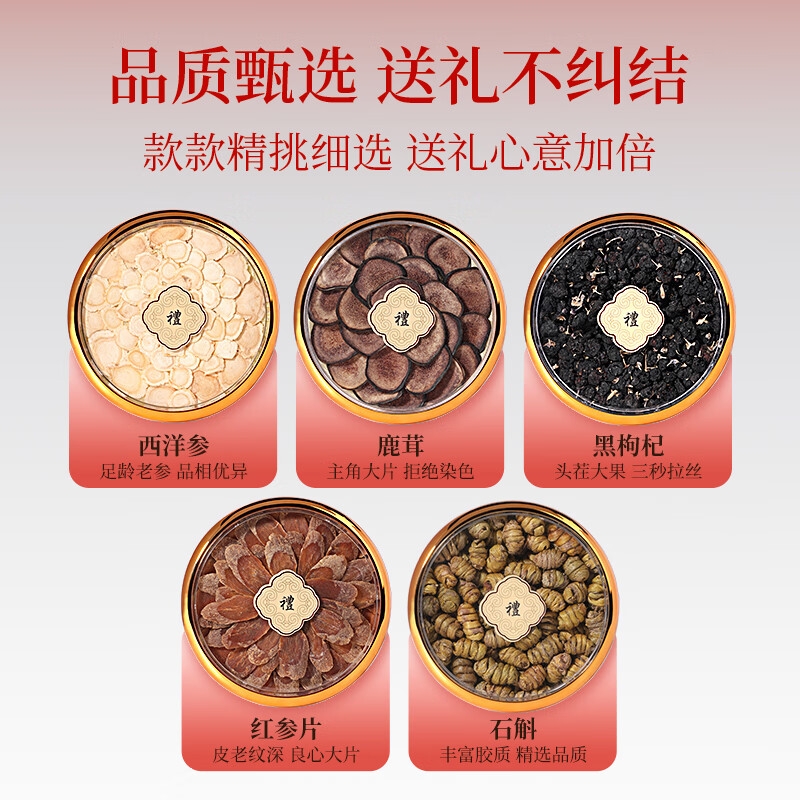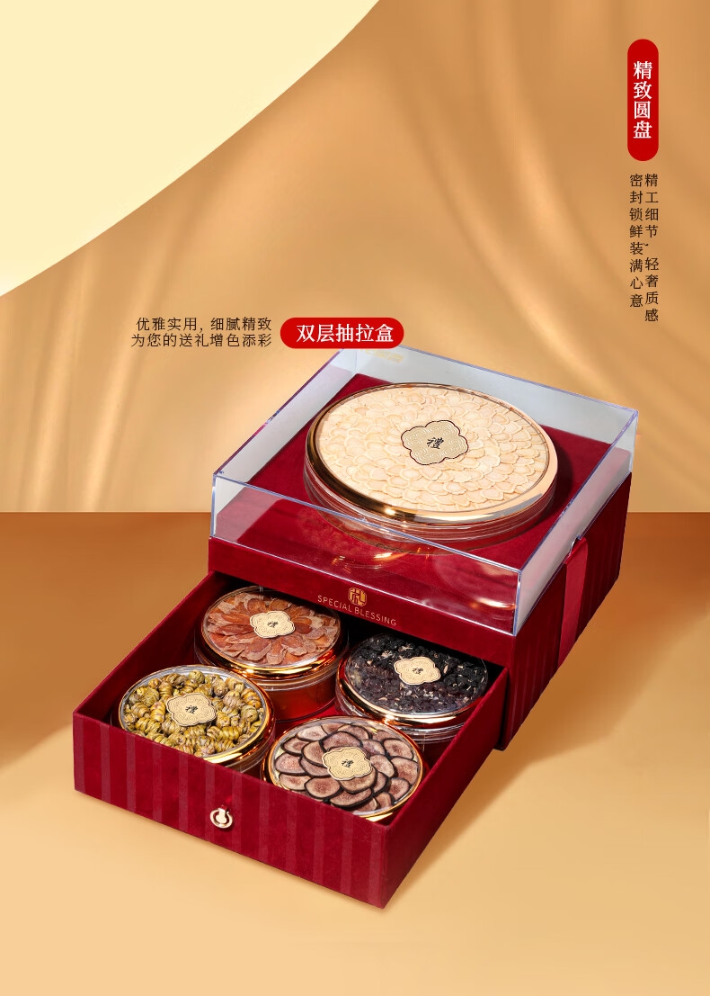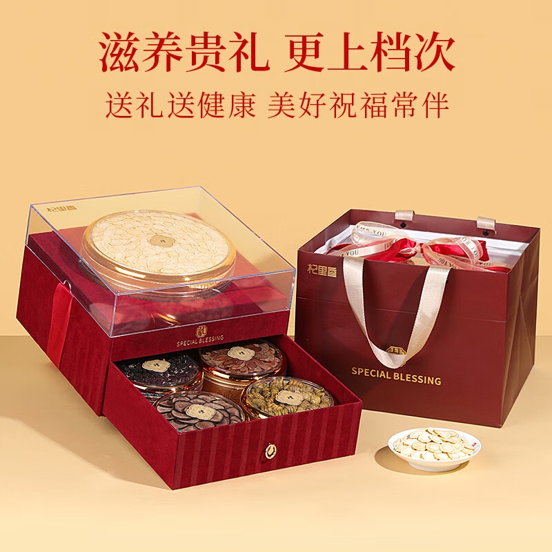 双层红丝绒高端礼盒,大气、上档次,送礼有面儿;严选核心产区道地食材,精心挑选,品质保证;五重滋补,营养更丰富,吃法更多样