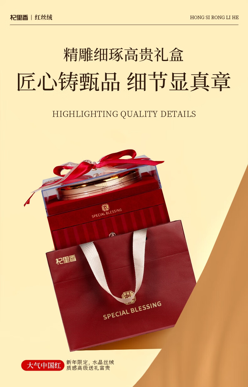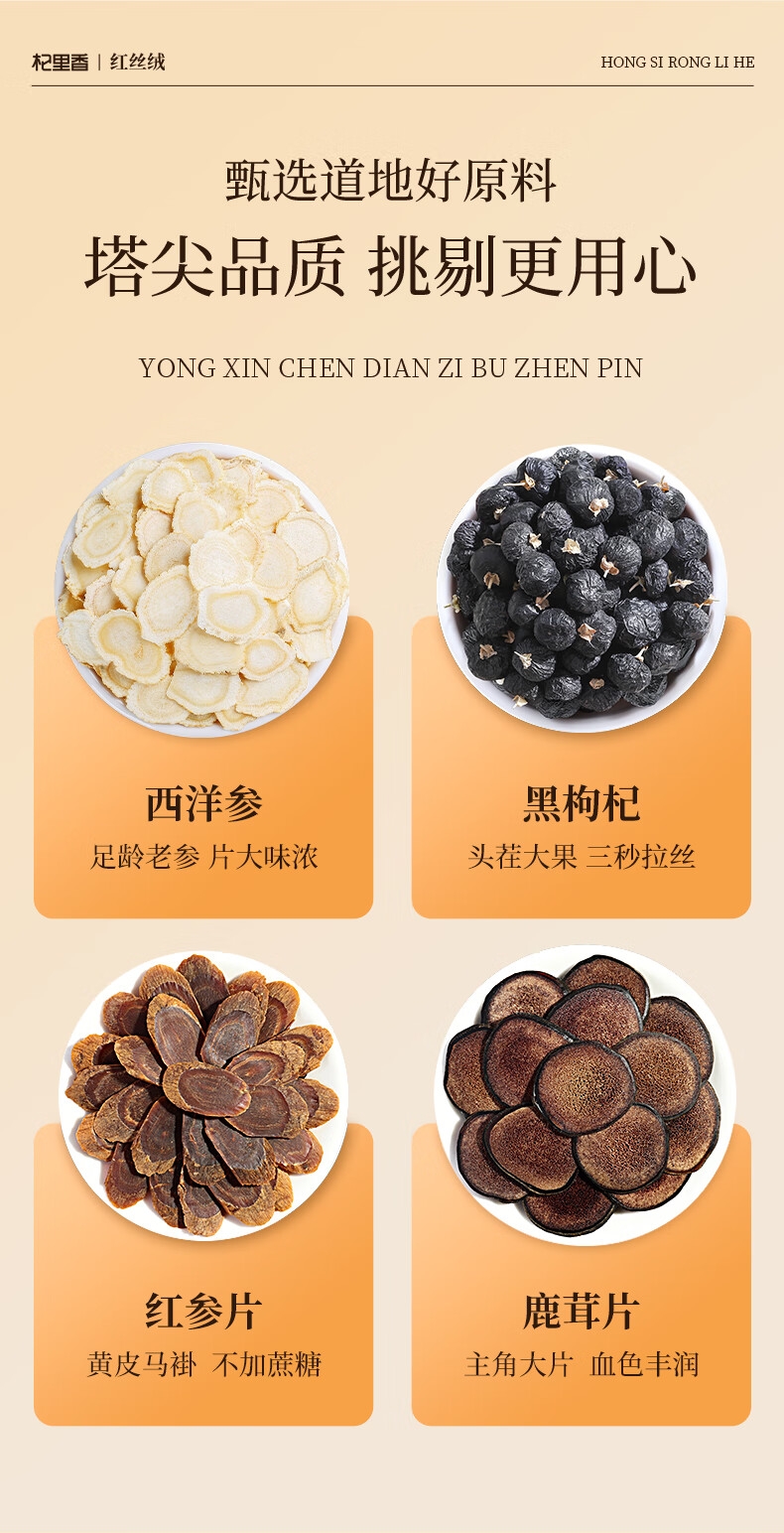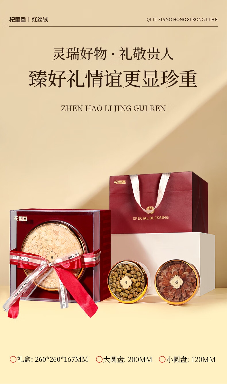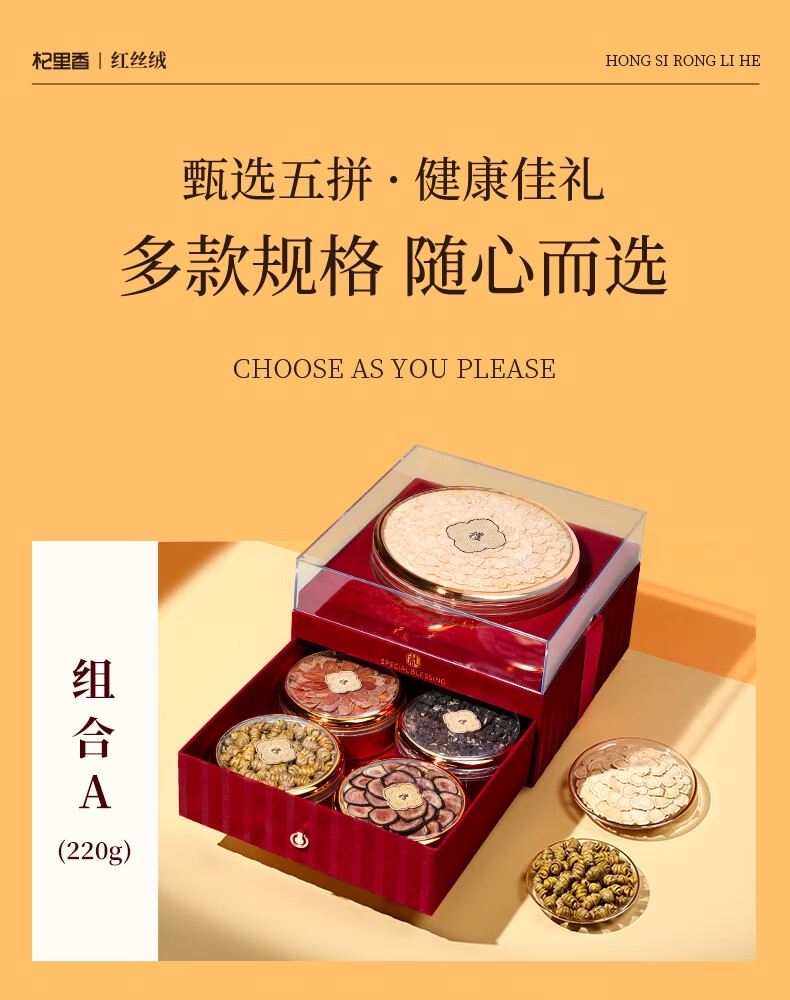 双层红丝绒高端礼盒,大气、上档次,送礼有面儿;严选核心产区道地食材,精心挑选,品质保证;五重滋补,营养更丰富,吃法更多样