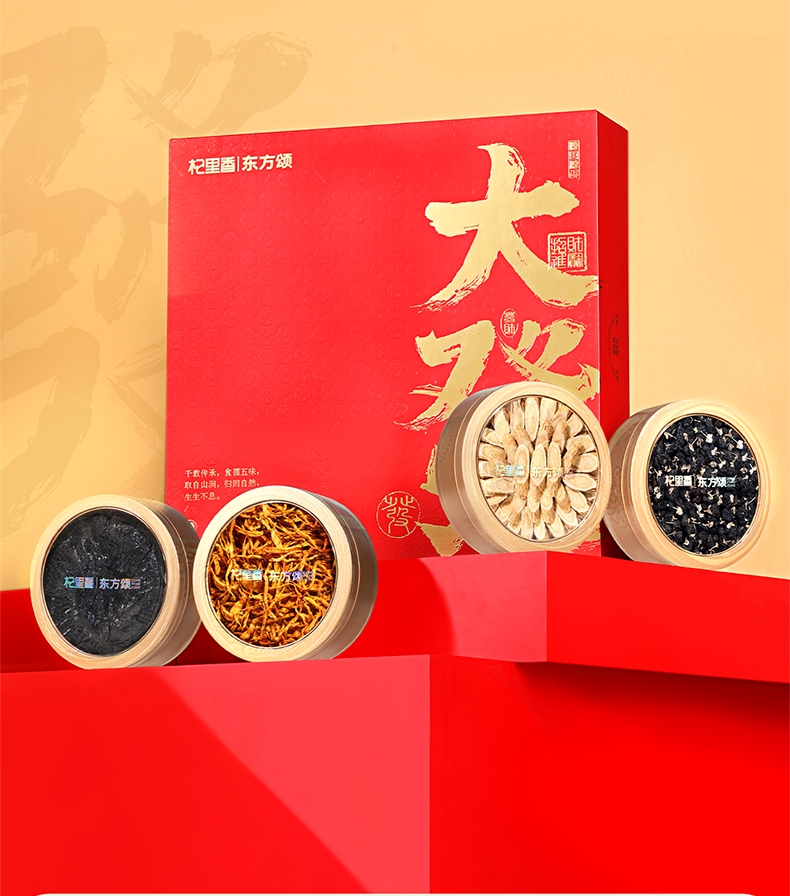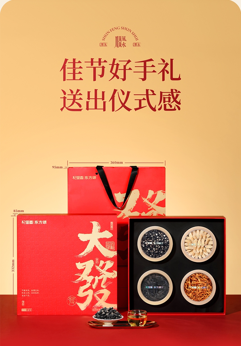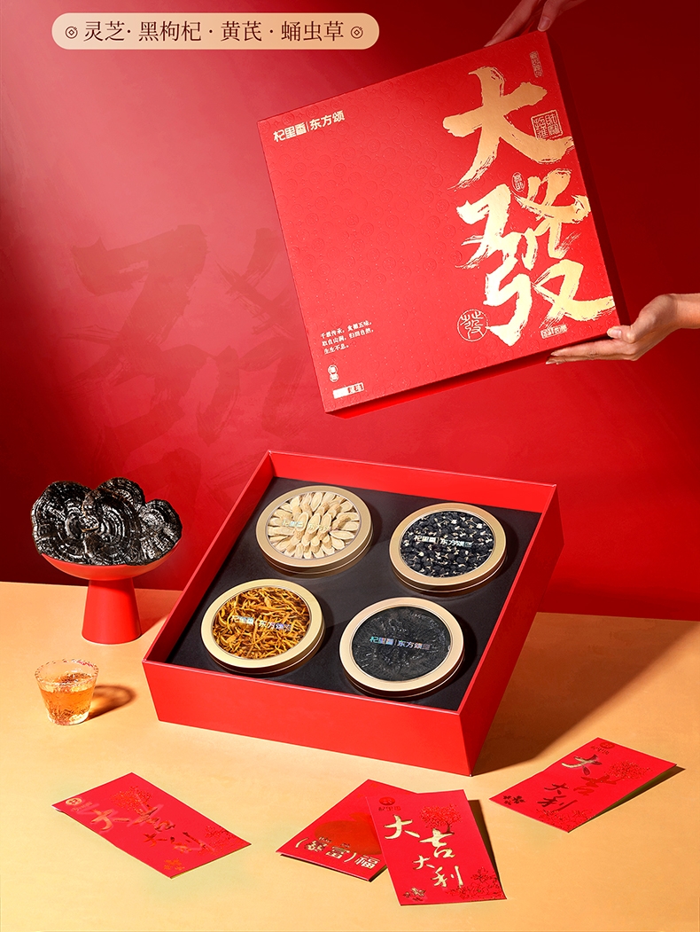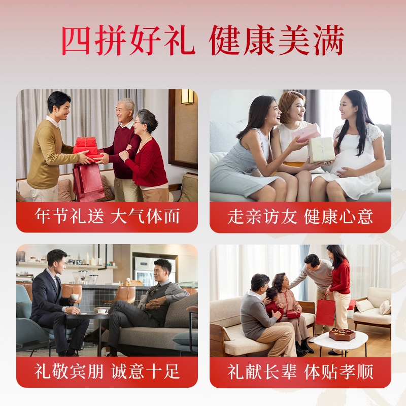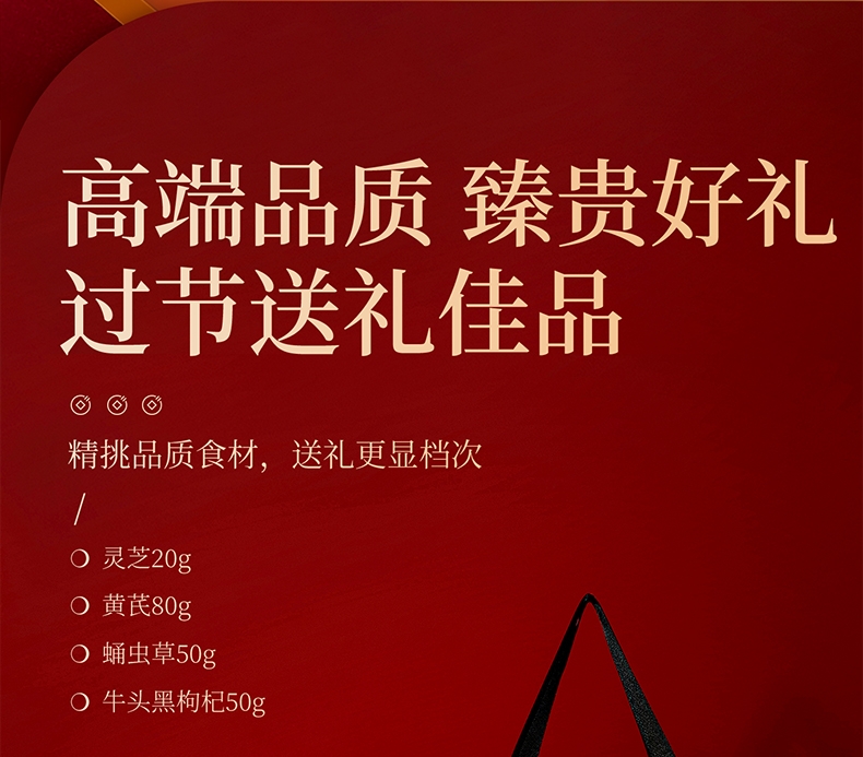 严选核心产品灵芝,黄芪,黑枸杞,蛹虫草,品质保证;四重滋补,营养更丰富,滋养更全面;高端礼盒装,赠礼袋,送礼有面儿
