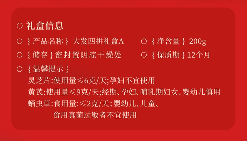 配置清单:灵芝20g+大果黑枸杞50g+1.0-1.2cm黄芪大片80g+虫草花50g,礼盒*1,礼袋*1