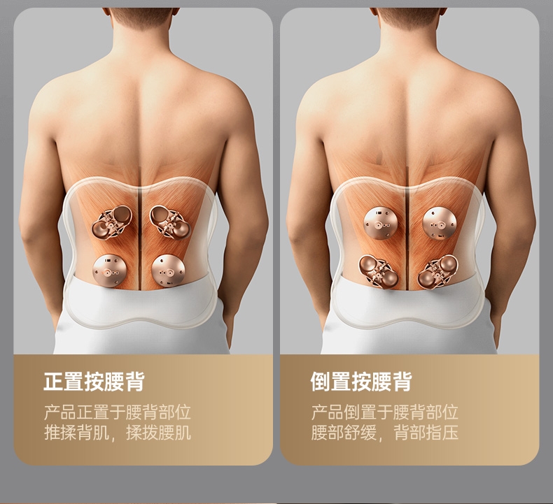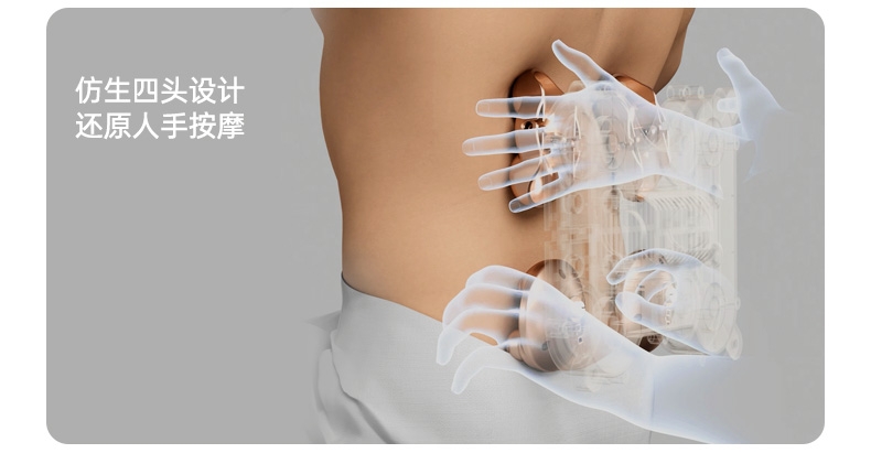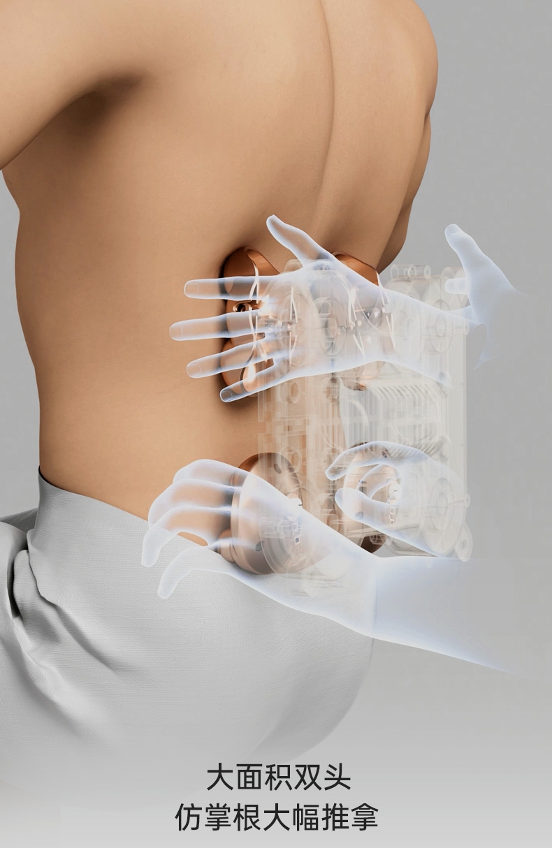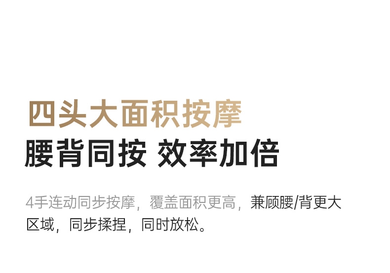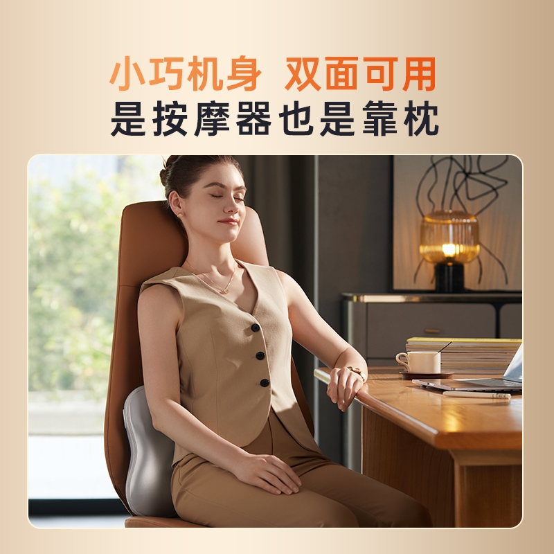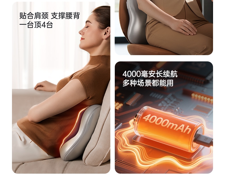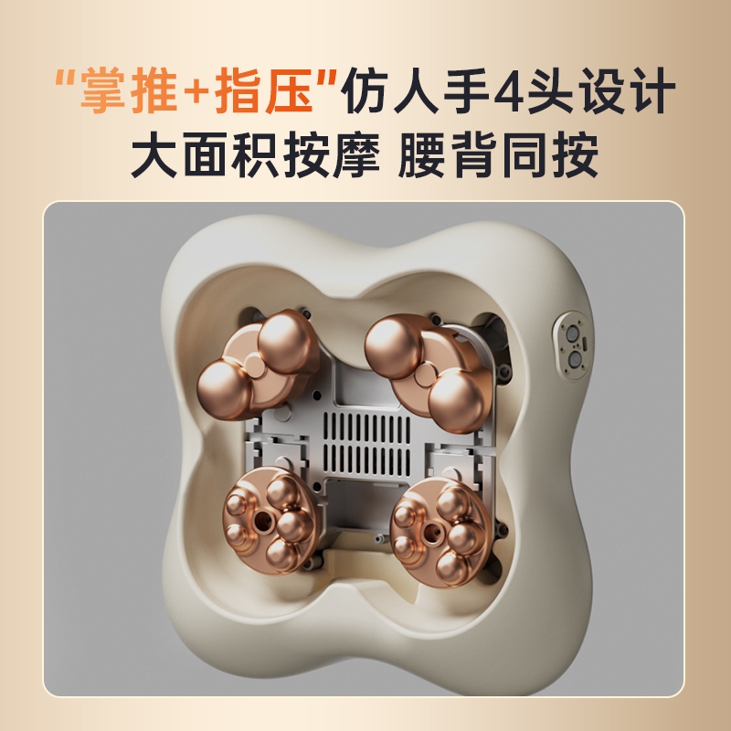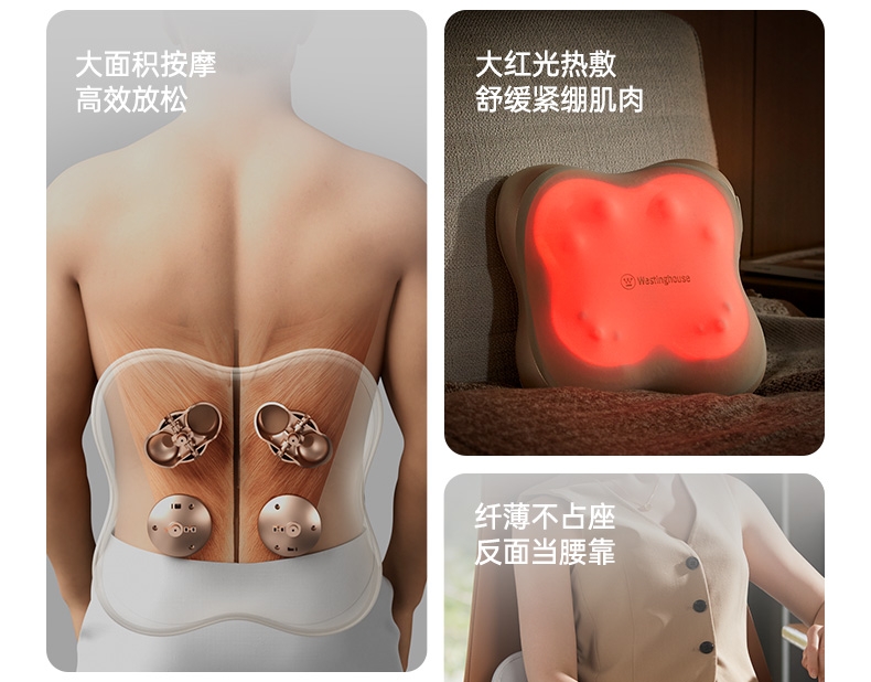 四大按摩头大面积+腰背部翘板式按摩头结构,仿手掌推;纤薄机身,双面可用,正面按摩放松,背面日常靠腰;搭配4000毫安大容量电池,续航更久;覆盖4组按摩头的大面积红光恒温热敷,恒定42℃温感;热敷可单独开启,小巧机身,暖背暖腰,灵活多用