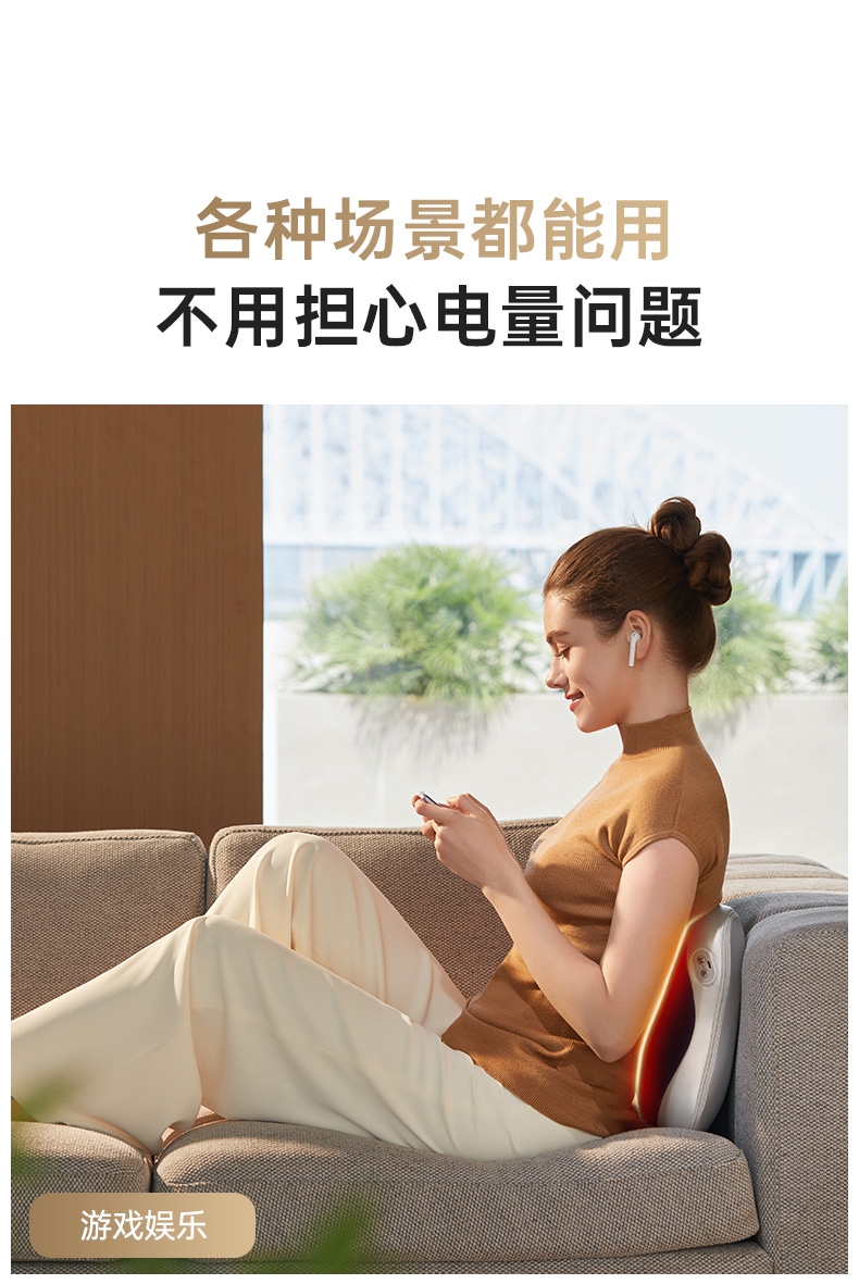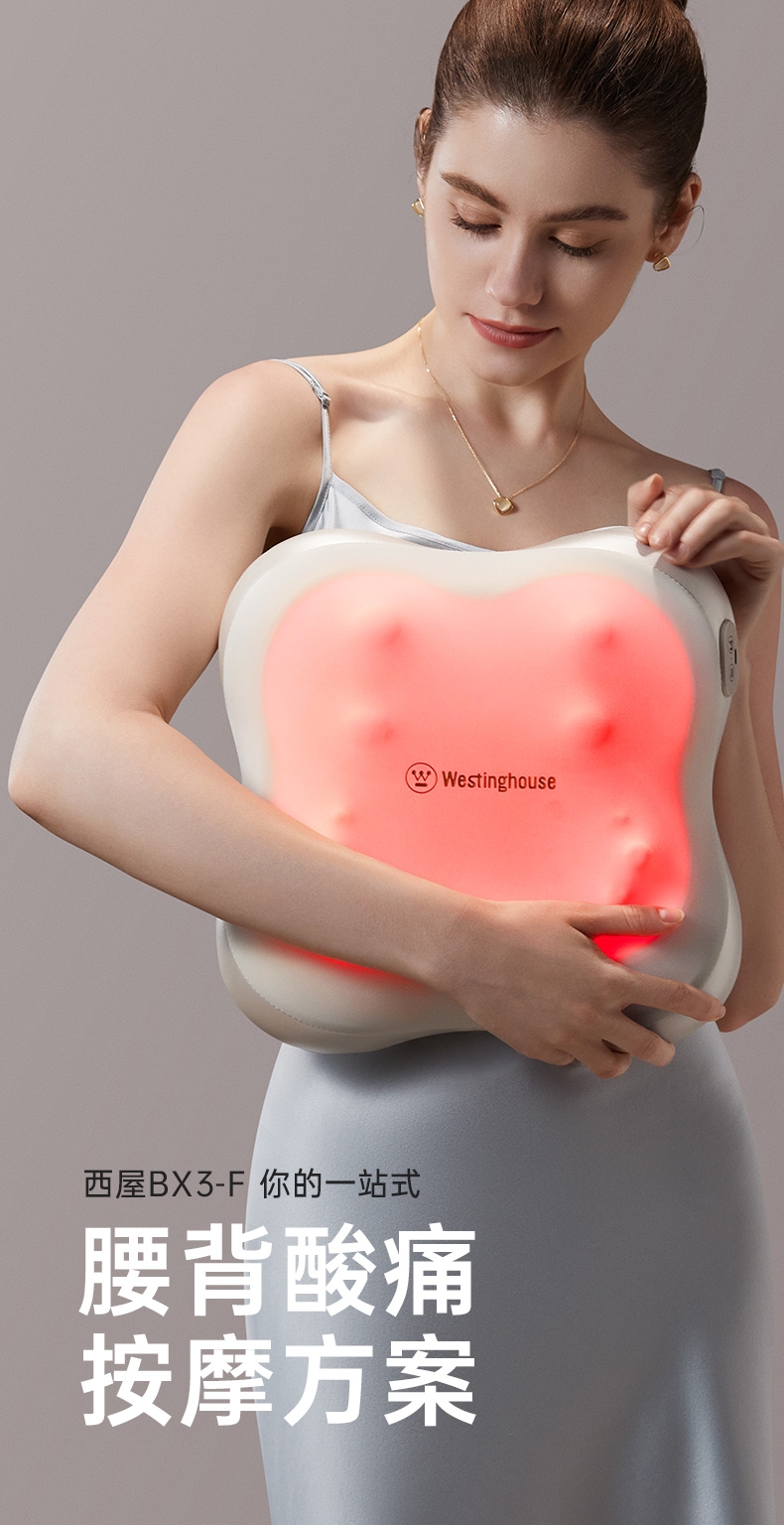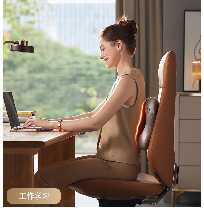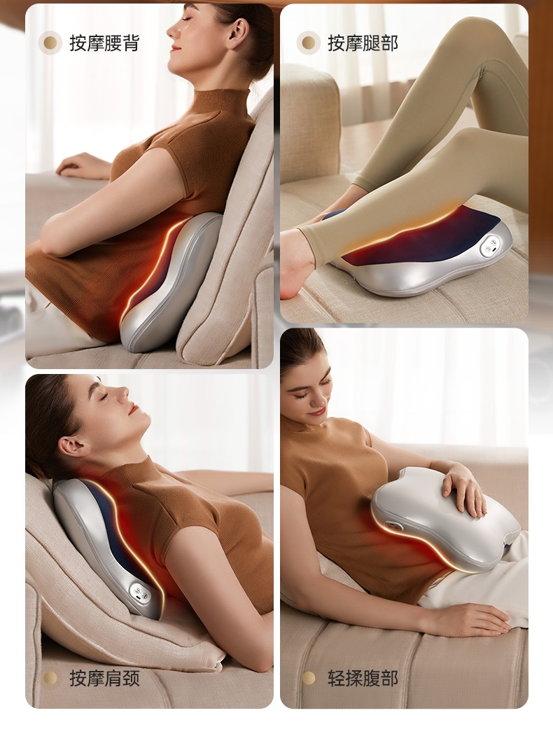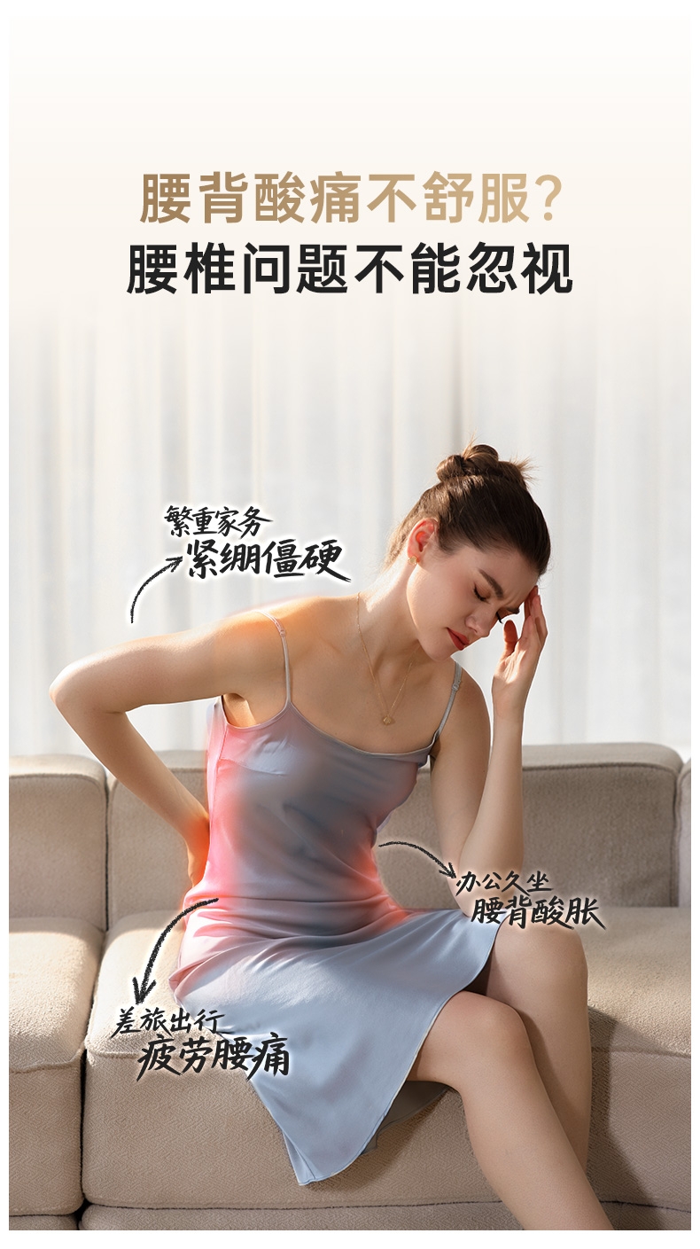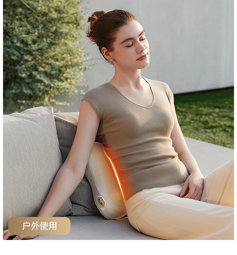 四大按摩头大面积+腰背部翘板式按摩头结构,仿手掌推;纤薄机身,双面可用,正面按摩放松,背面日常靠腰;搭配4000毫安大容量电池,续航更久;覆盖4组按摩头的大面积红光恒温热敷,恒定42℃温感;热敷可单独开启,小巧机身,暖背暖腰,灵活多用