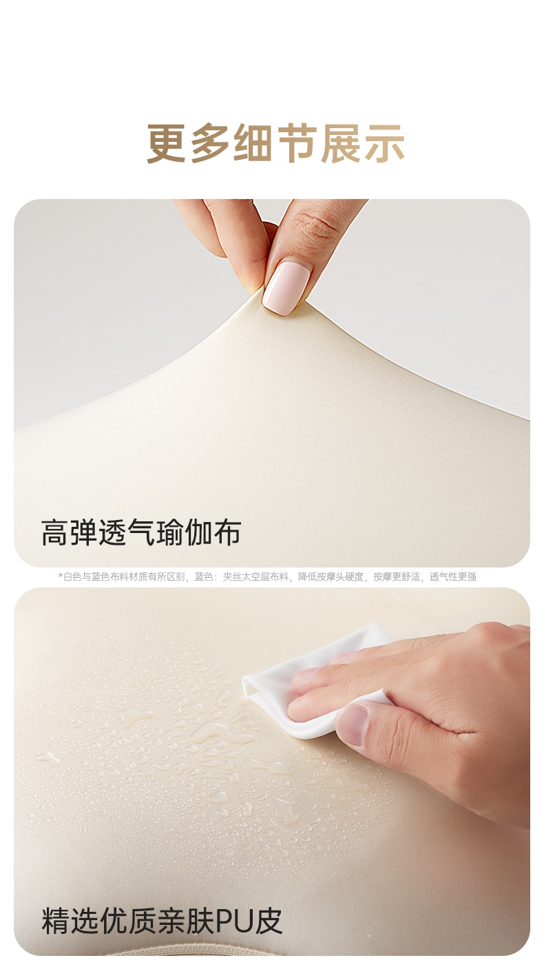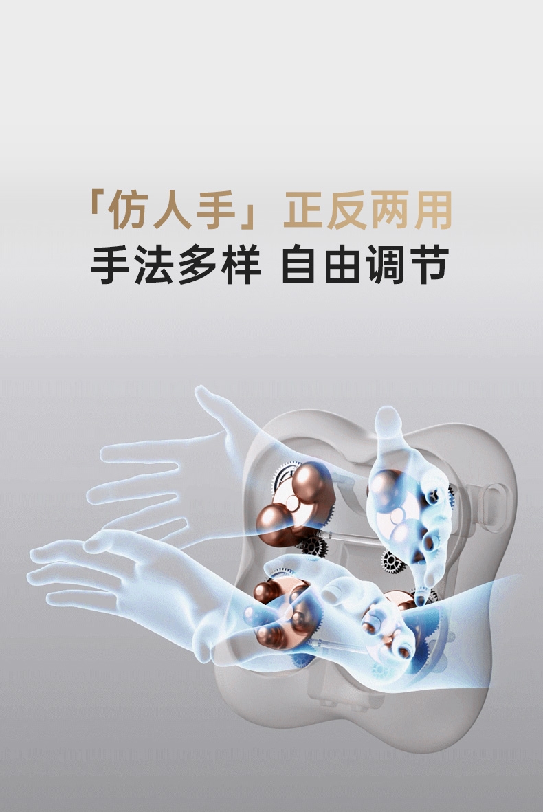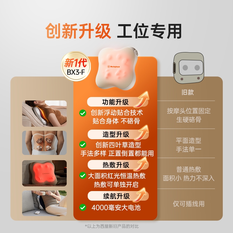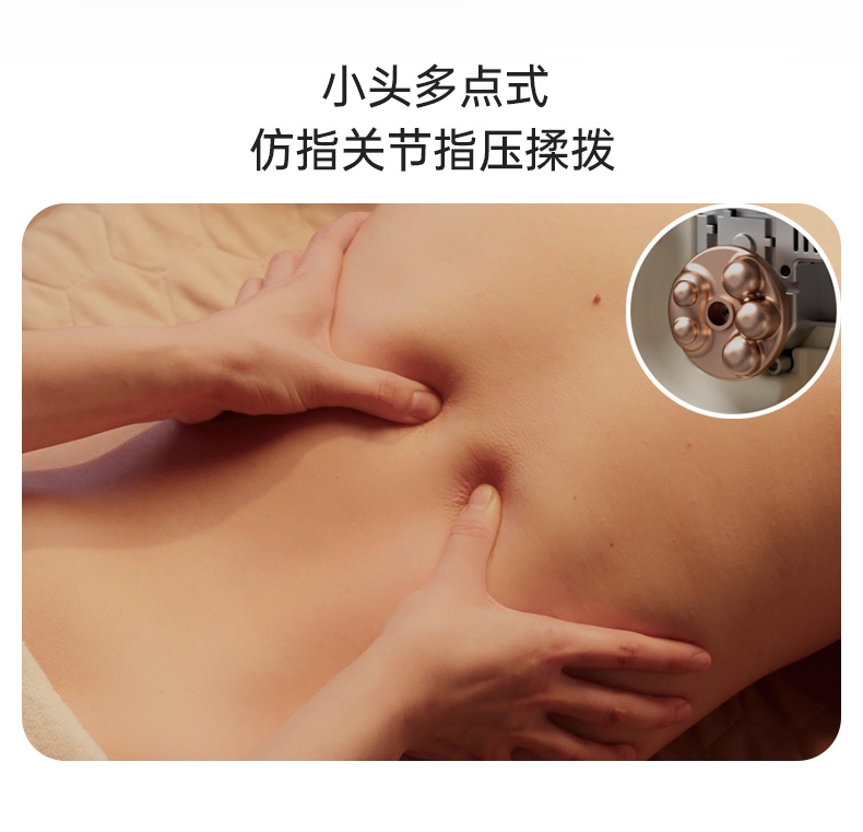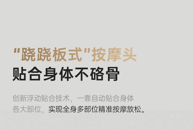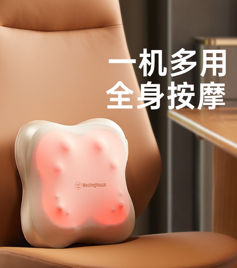 四大按摩头大面积+腰背部翘板式按摩头结构,仿手掌推;纤薄机身,双面可用,正面按摩放松,背面日常靠腰;搭配4000毫安大容量电池,续航更久;覆盖4组按摩头的大面积红光恒温热敷,恒定42℃温感;热敷可单独开启,小巧机身,暖背暖腰,灵活多用