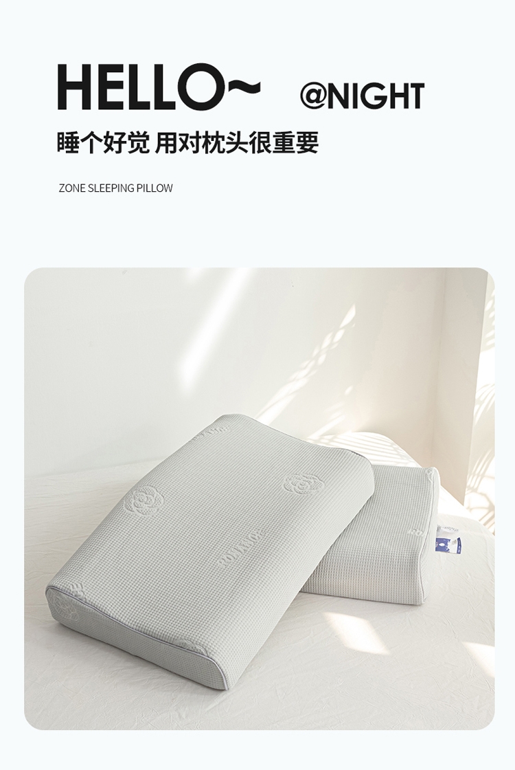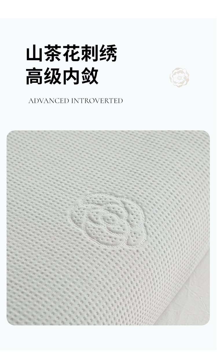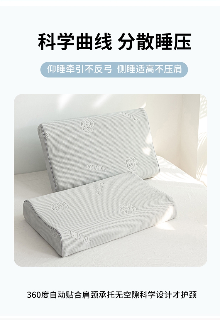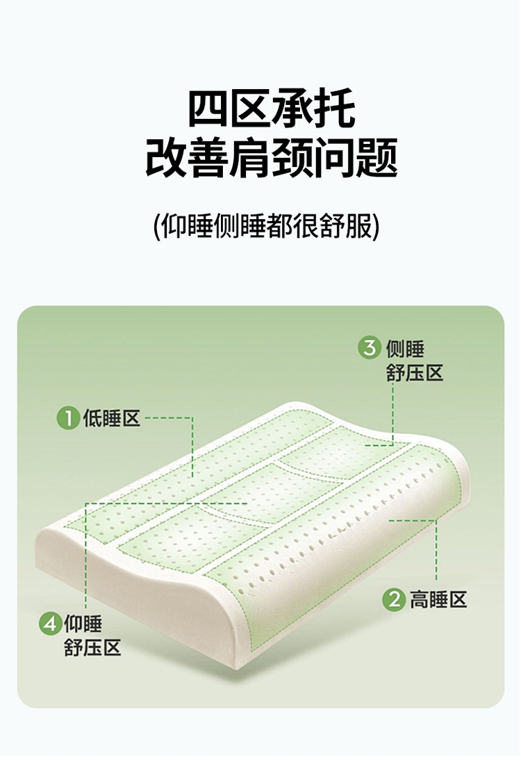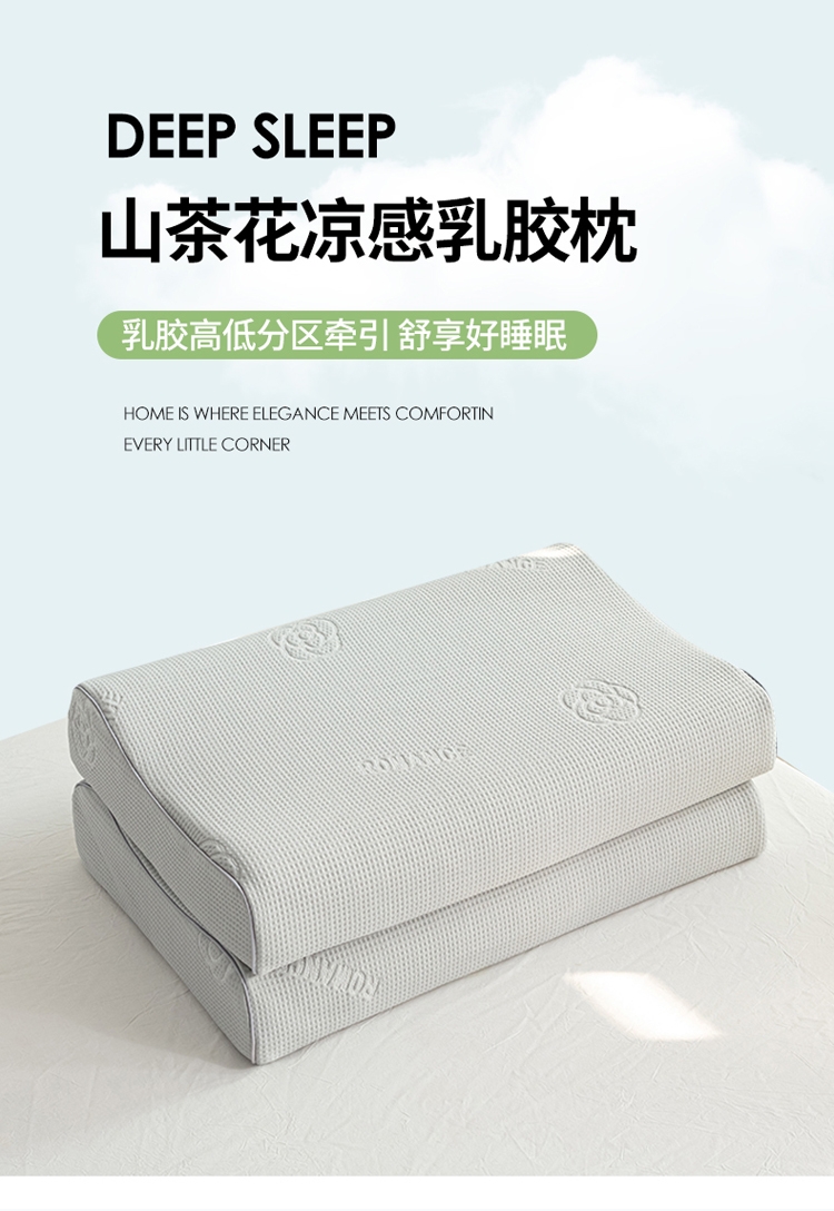 山茶花凉感乳胶枕 乳胶高低分区牵引舒享好睡眠;四区承托改善肩颈问题 (仰睡侧睡都很舒服);科学曲线分散睡压 仰睡牵引不反弓 侧睡适高不压肩