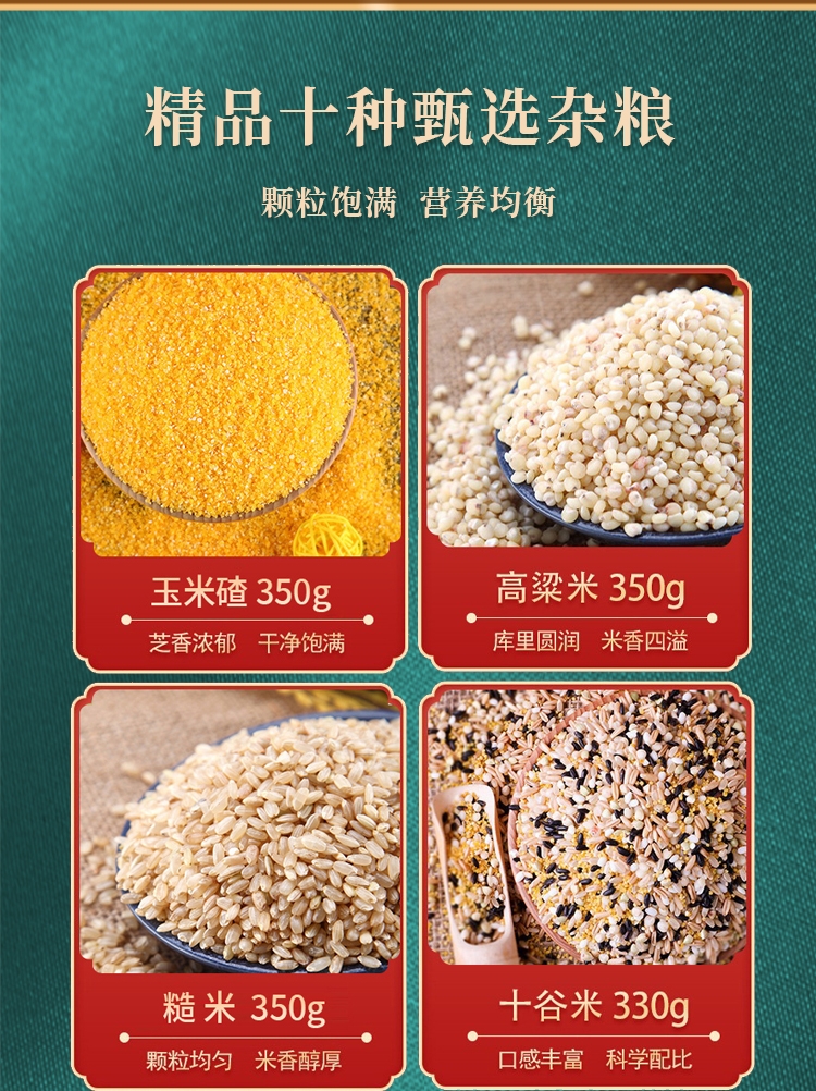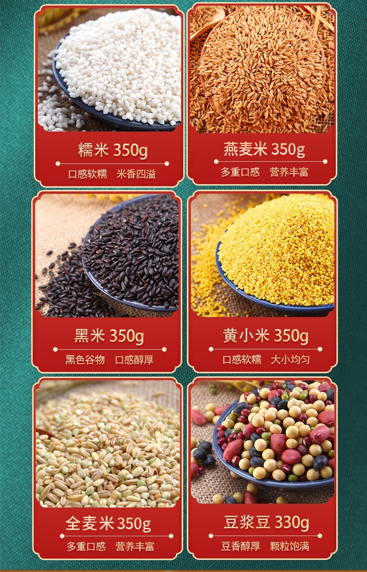 配置清单:玉米碴350g黑米350g糙米350g高梁米350g燕麦米350g豆浆豆330g糯米350g黄小米350g全麦米330g十谷米330g