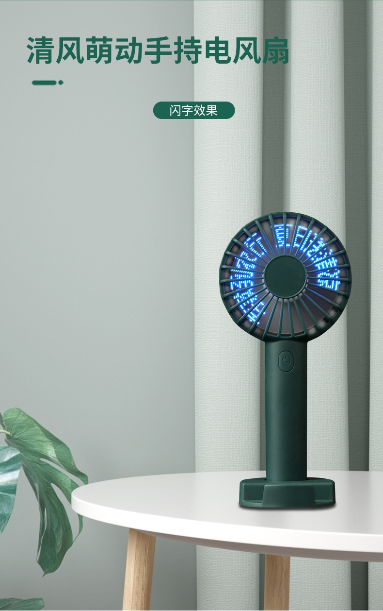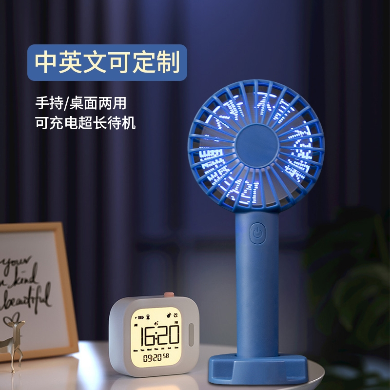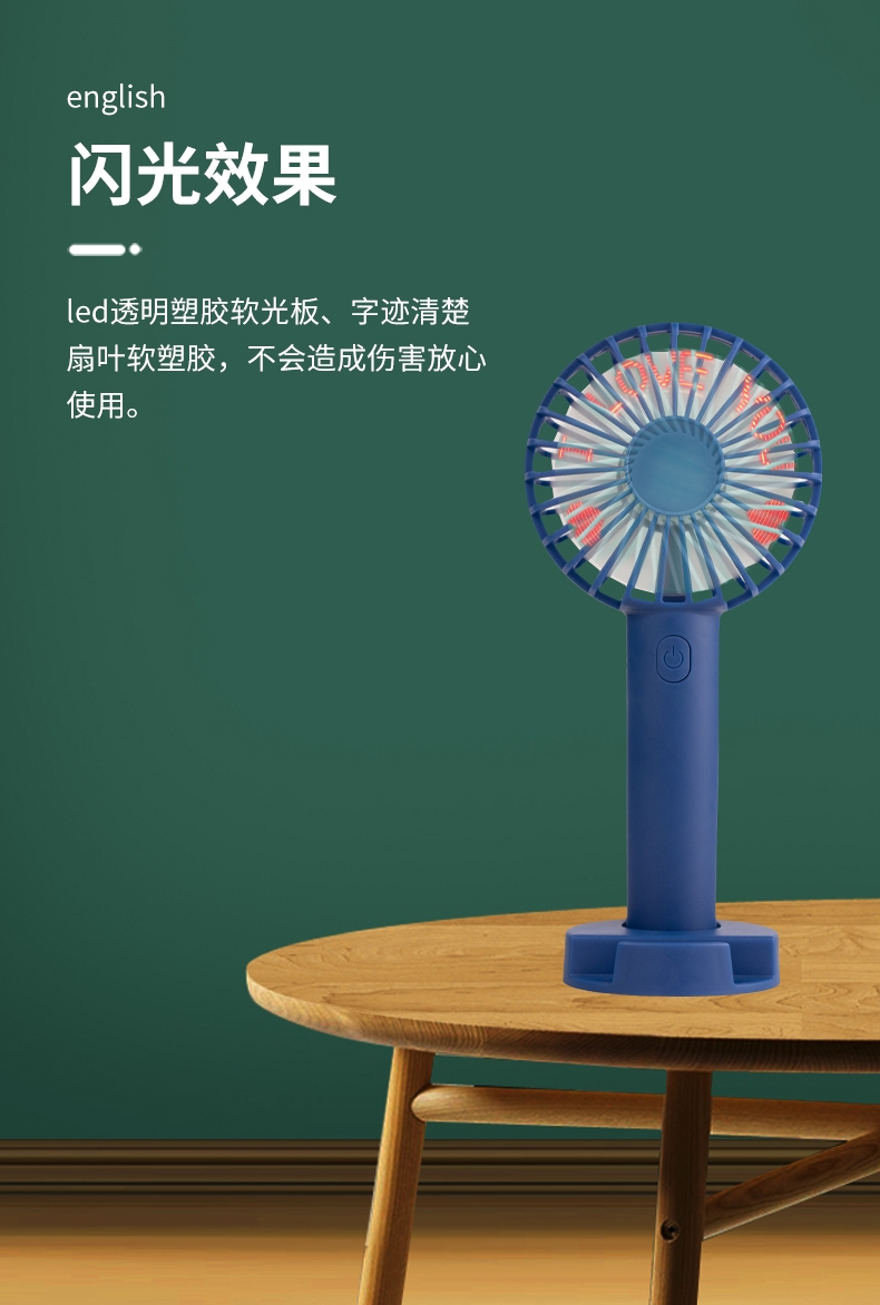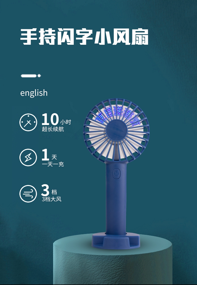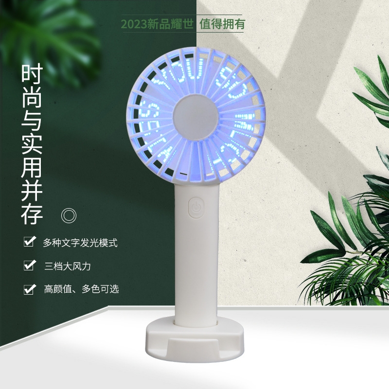 LED固定闪字风扇,广告标语定制,企业活动宣传好物;三档风力调节,小巧便于携带;搭配支架底座,手握立式两用