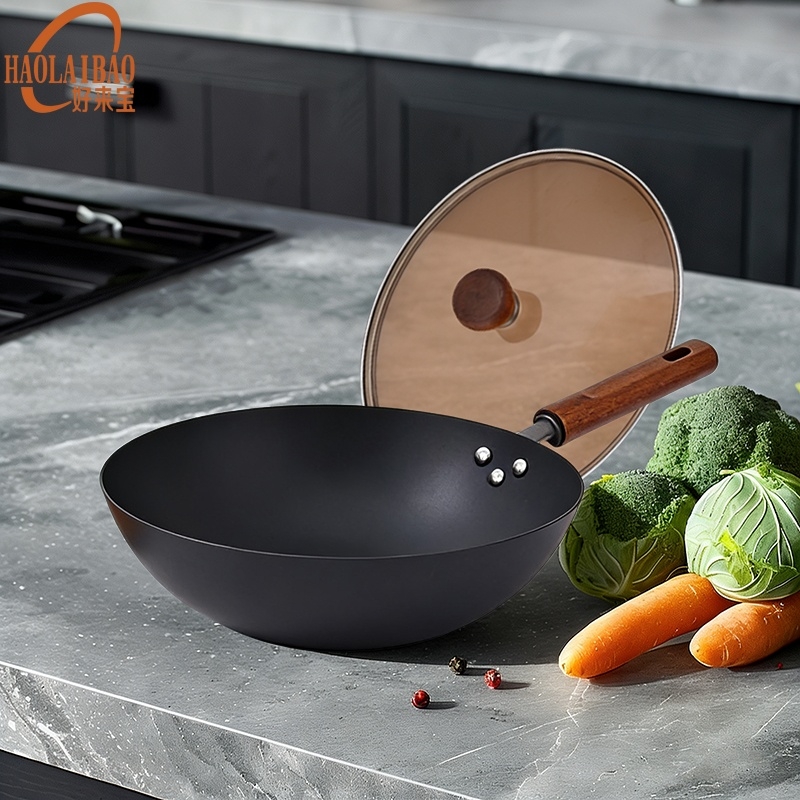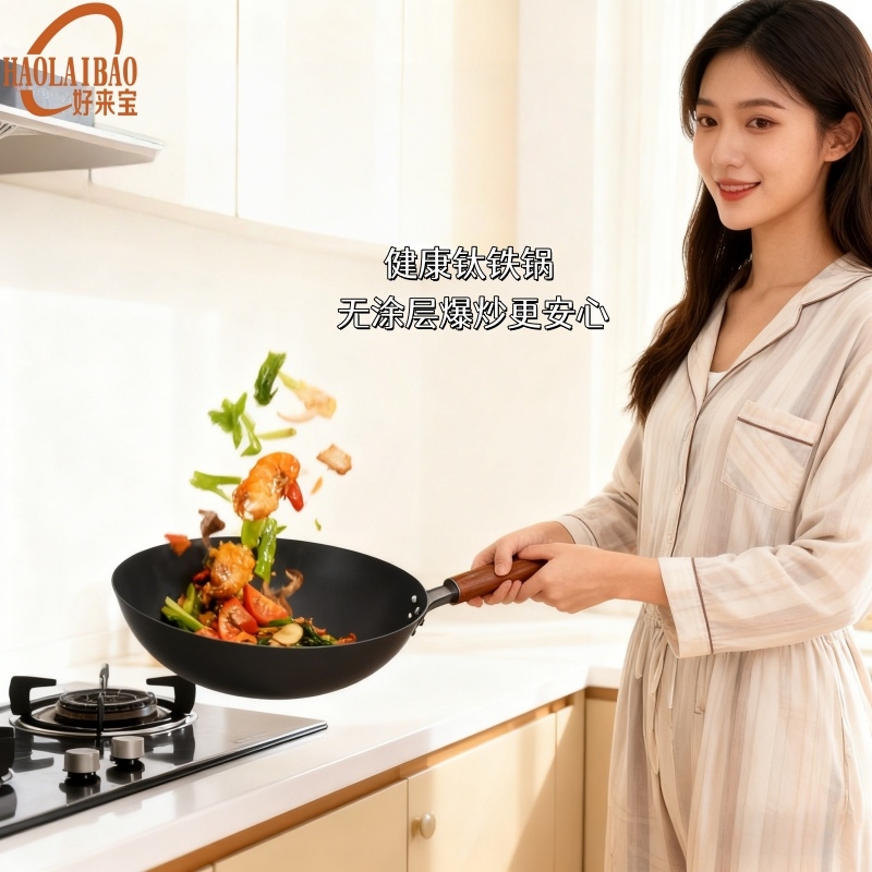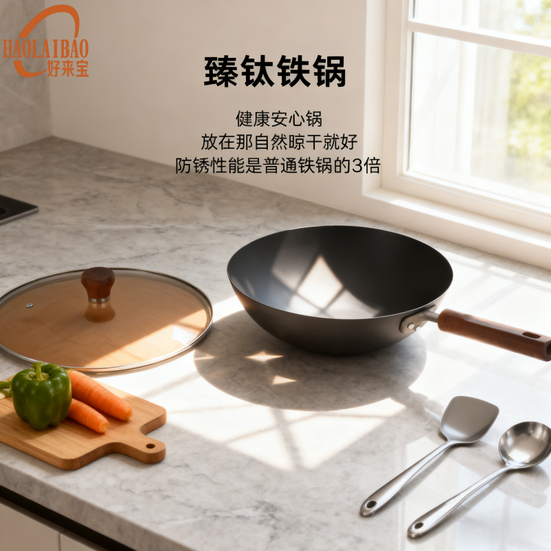 熔钛+铁+深层氮化光滑工艺=耐磨.耐高温.超防锈;高纯铁无涂层更健康,可用铁铲、耐磨、不易粘锅;桃木纹路原木顶珠原木木手柄 不累手 畅享烹饪乐趣;电镀三铆钉接口加固;茶色高端玻璃盖耐看,食材烹饪好掌握