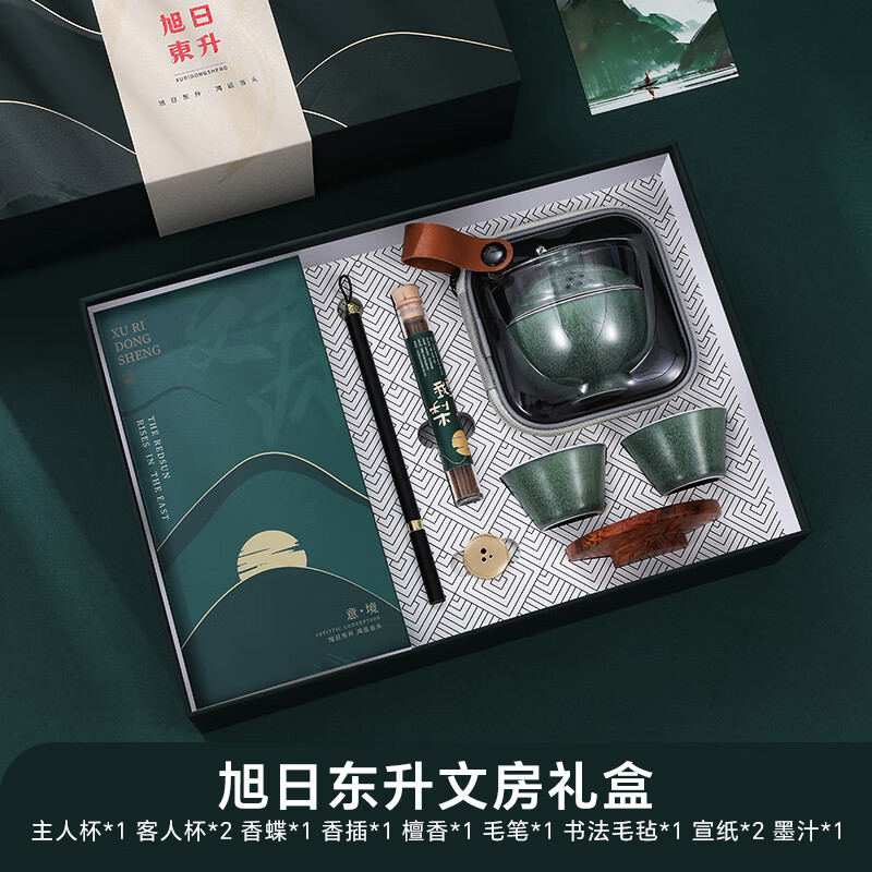墨绿金线旭日东升主题,东方美学寓意吉祥;茶具配书法用品,满足品茗挥毫多重雅趣;陶瓷光滑毛笔顺滑,檀香醇厚提升感官体验