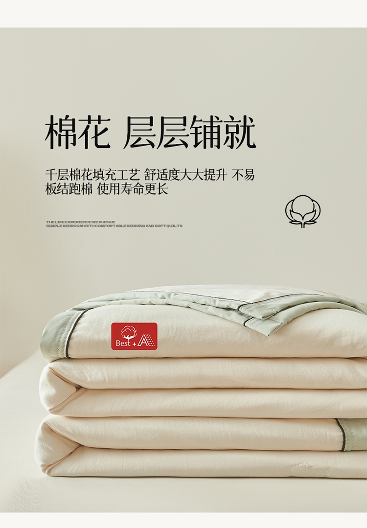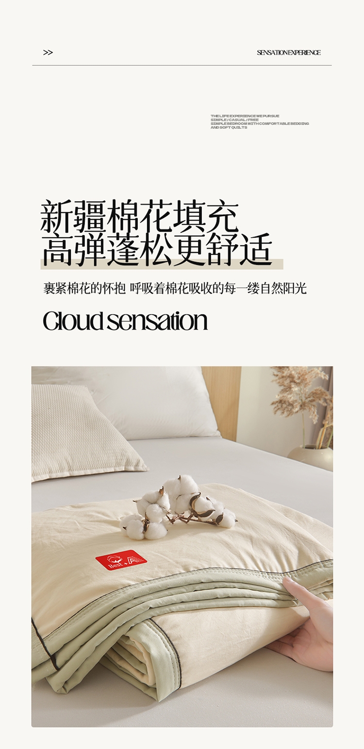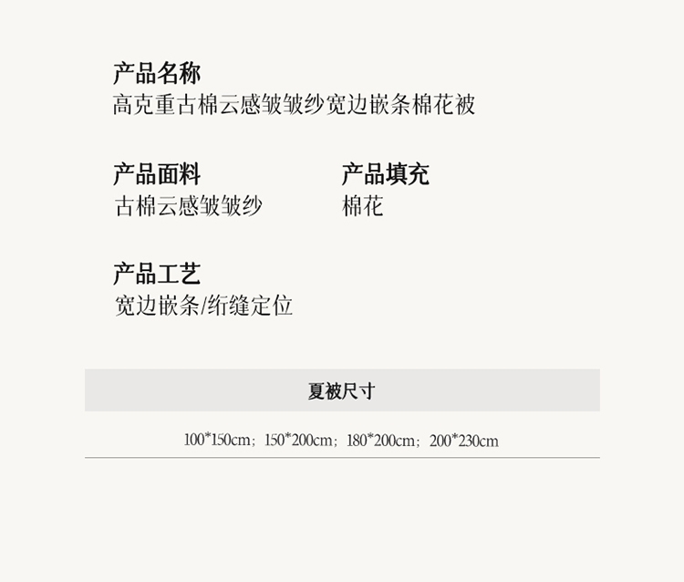 新款高克重古棉云感皱皱纱宽边嵌条棉花被;只安级纱山料 触感透气舒爽 柔软舒适静享好眠与温柔;新疆棉花填充高弹蓬松更舒适。 裹紧棉花的怀抱呼吸