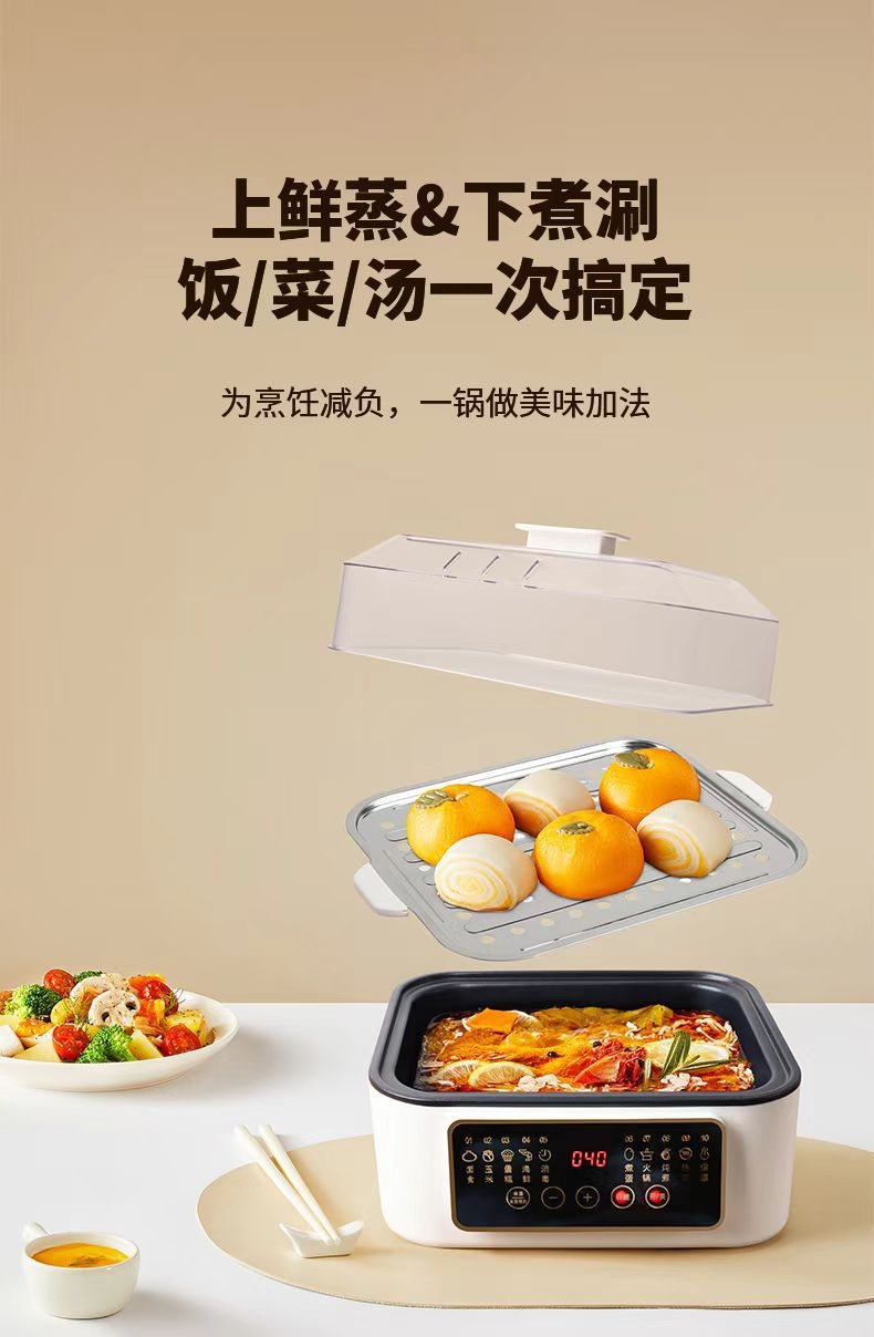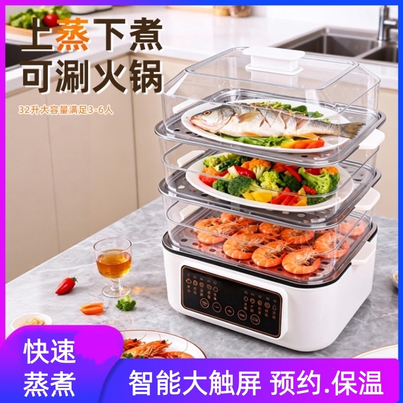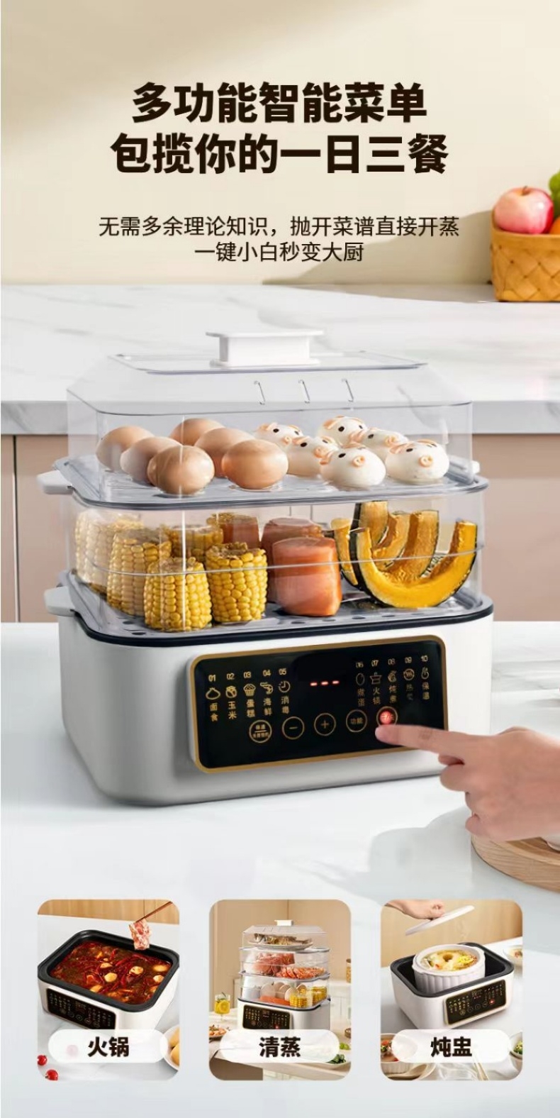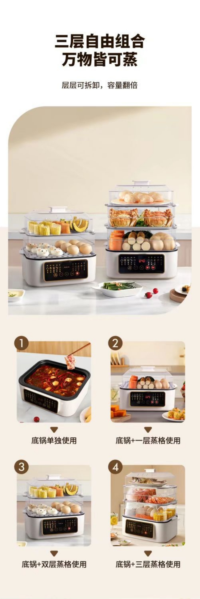 三层不锈钢蒸架;上蒸下煮底锅是电火锅;预约