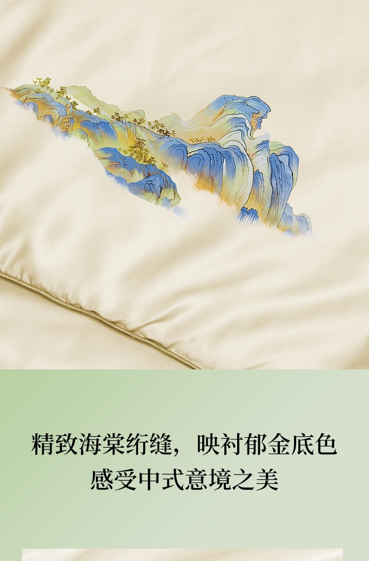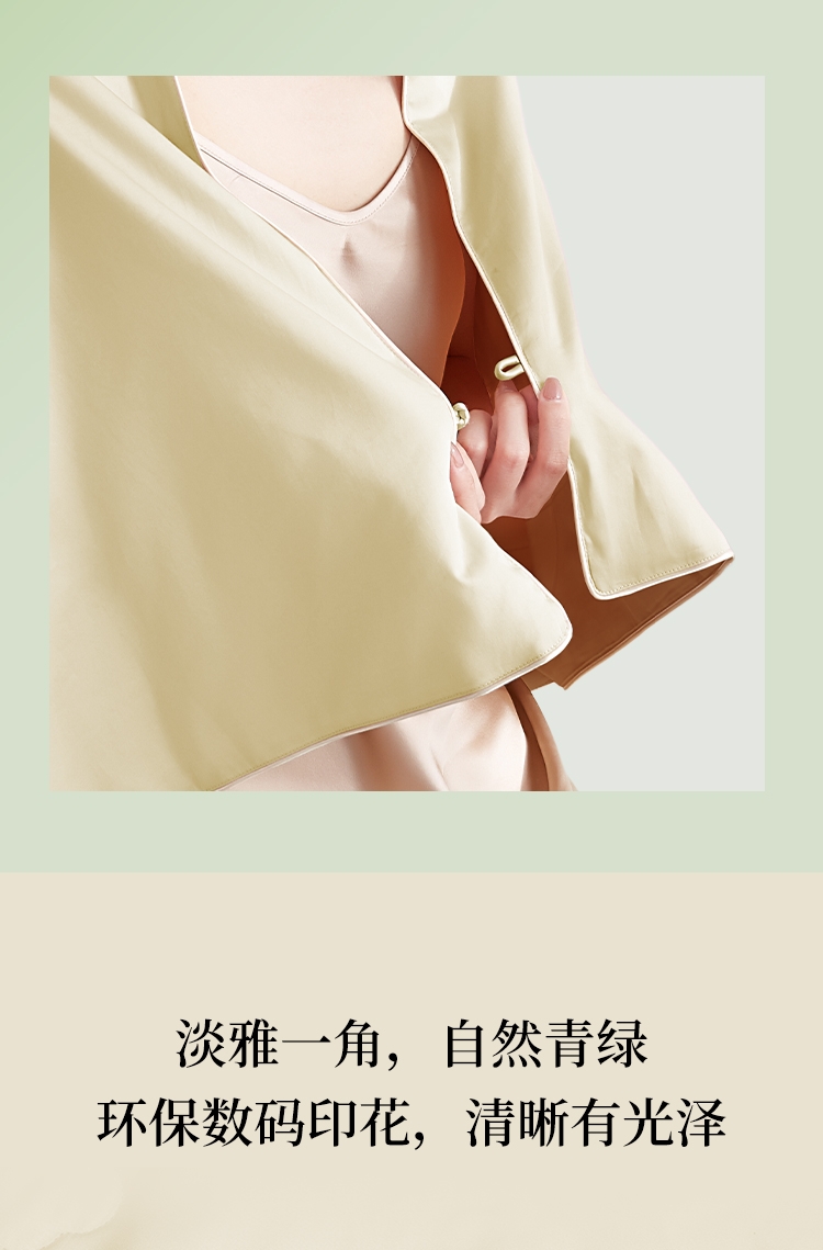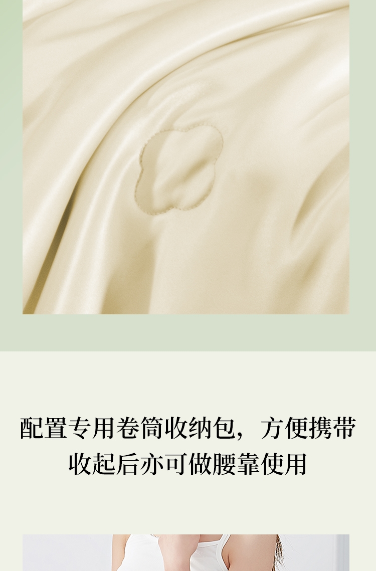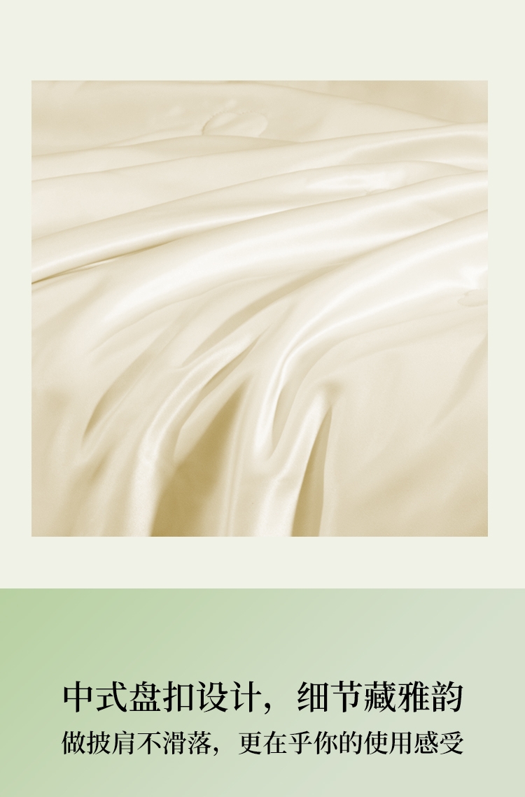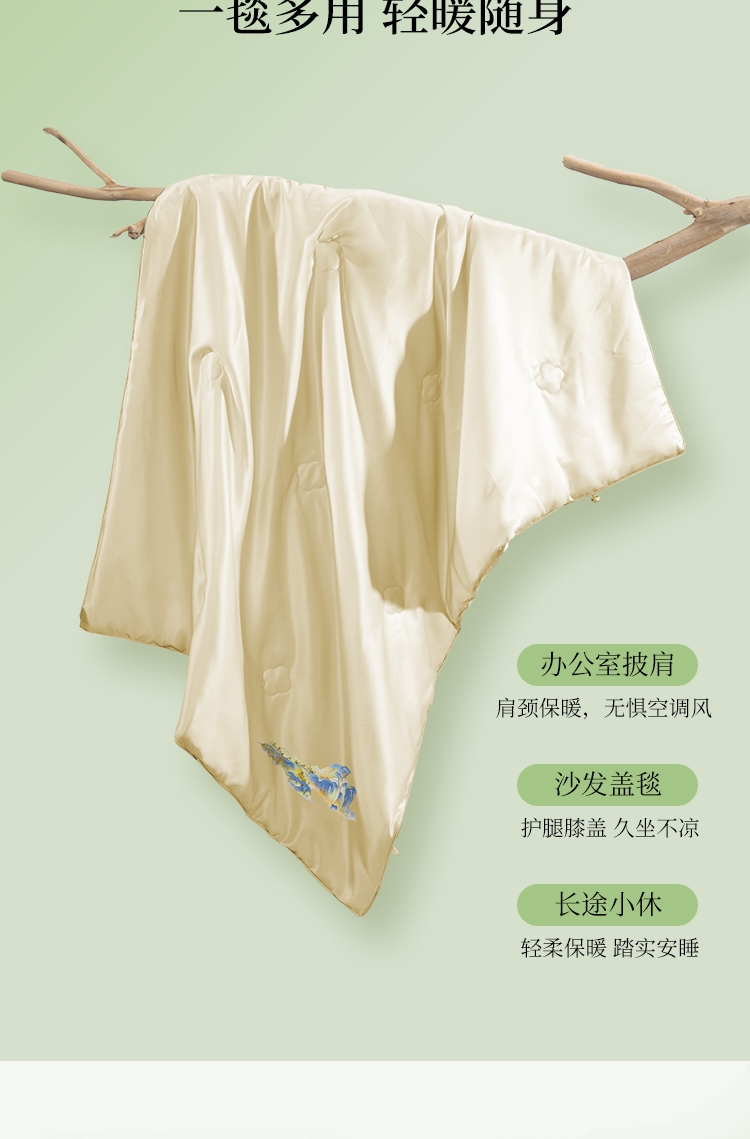 100%蚕丝填充,柔滑面料,轻盈轻暖,温馨休息时刻;精致海棠绗缝,映衬郁金底色, 感受中式意境之美;盘扣设计,可披可盖;配置专用卷筒收纳包,方便携带。