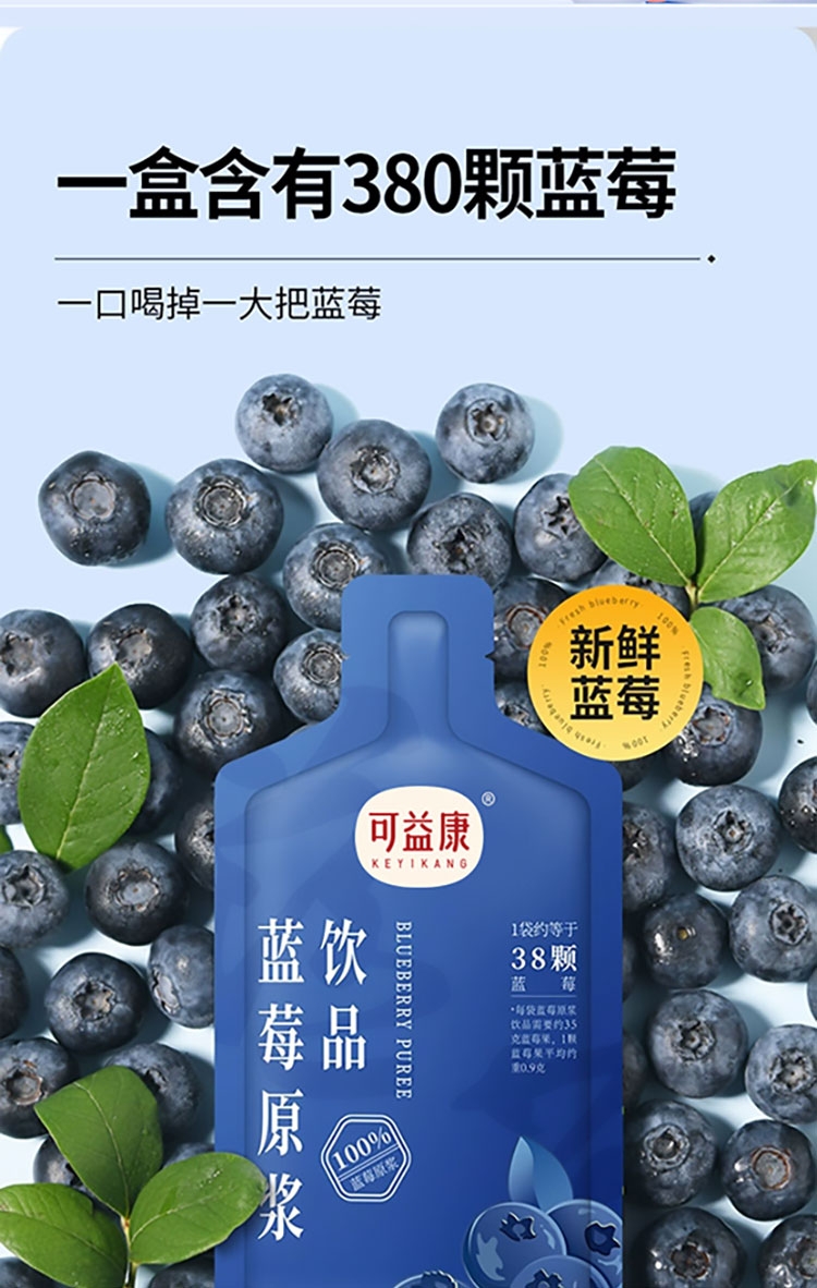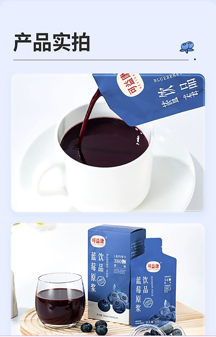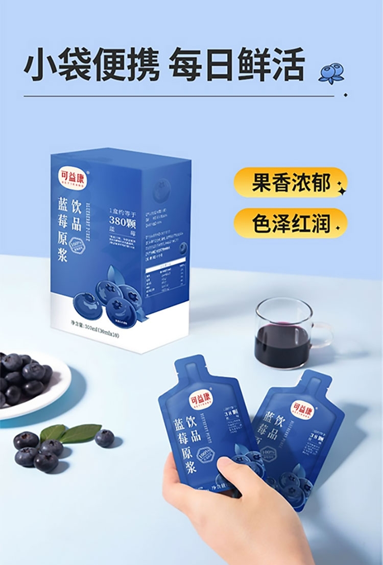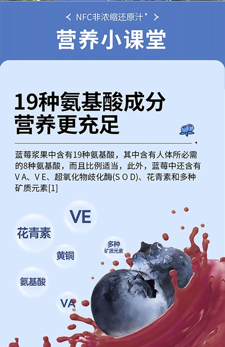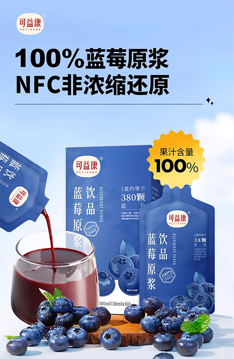 每盒约等于380颗蓝莓;NFC非浓缩还原,不加1滴水;酸甜清爽护双眼,每天一袋气色佳。