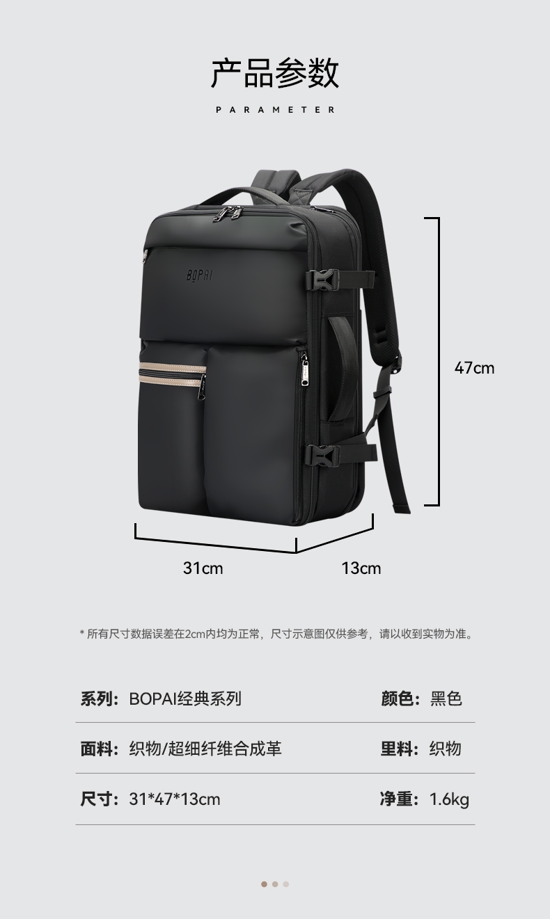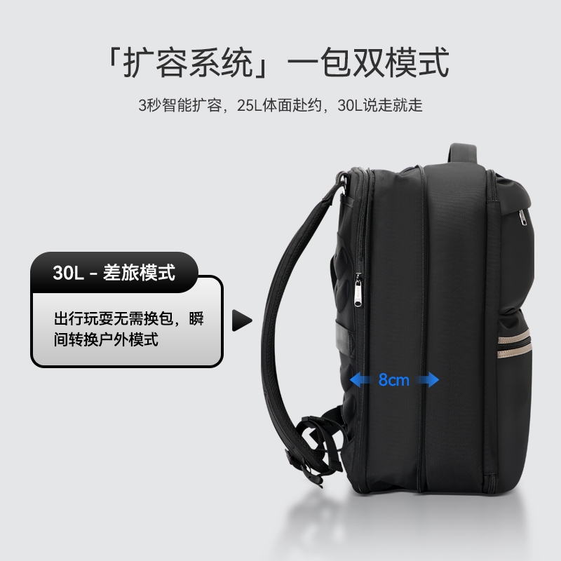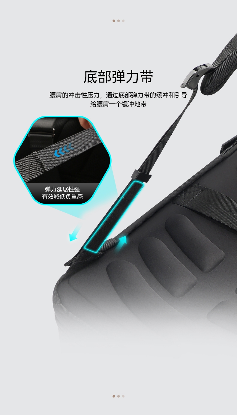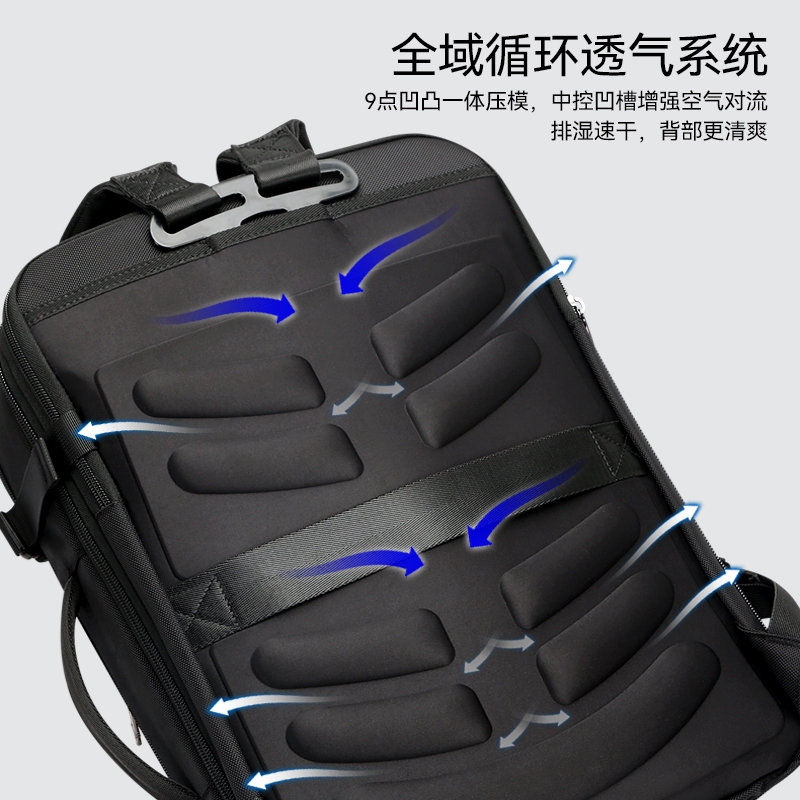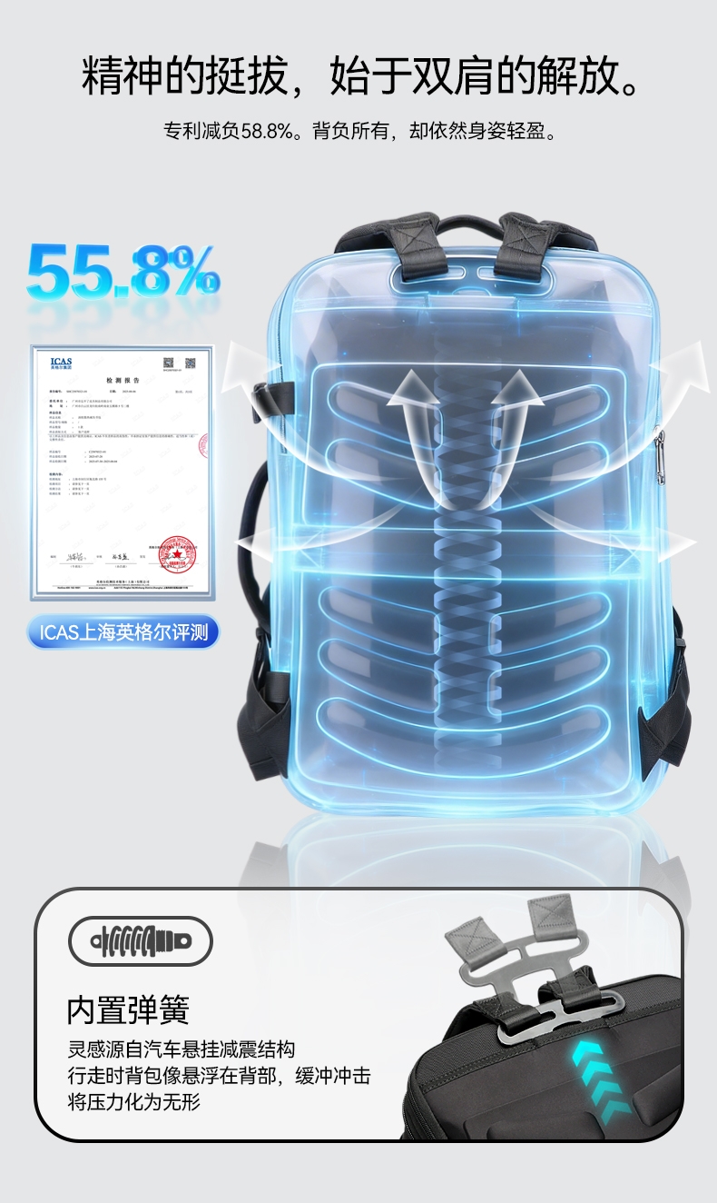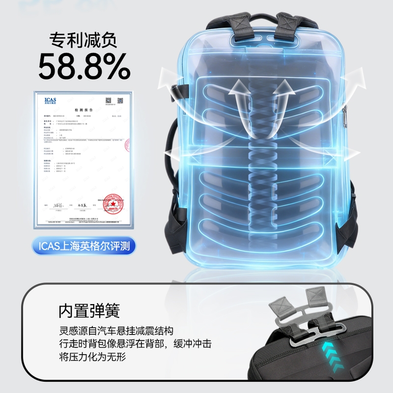 材质耐磨防泼水;包身大容量,智能增宽8cm;背部全域循环透气系统,背部内置弹簧系统减负减震