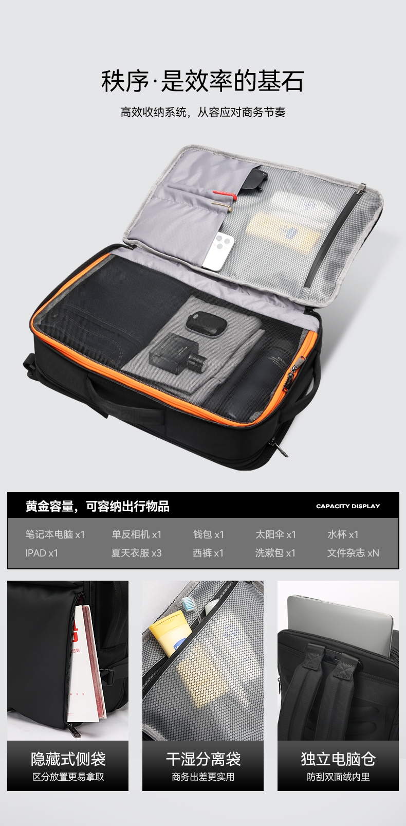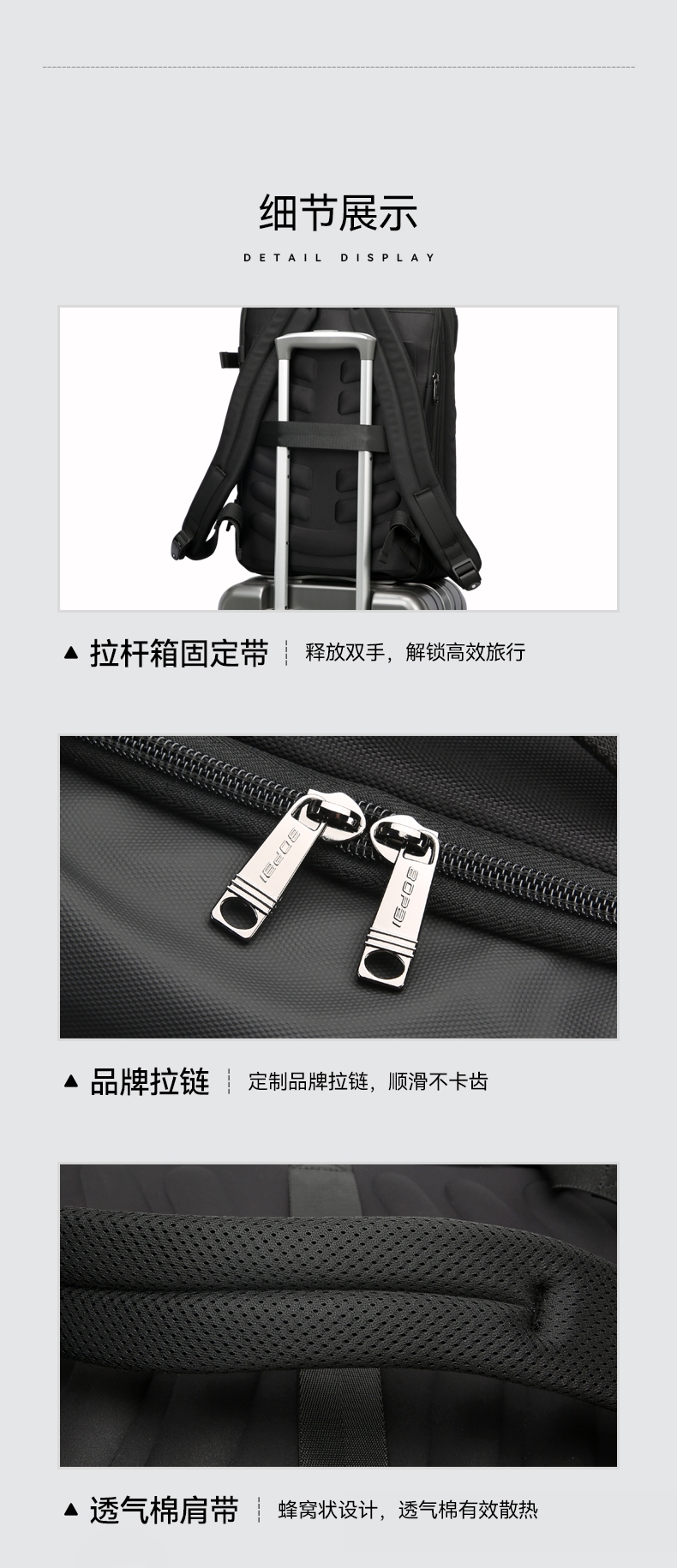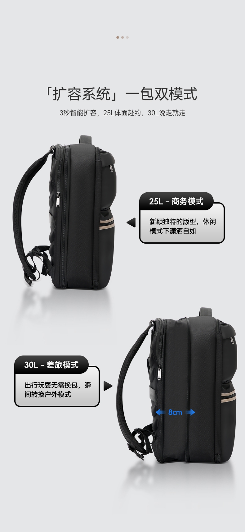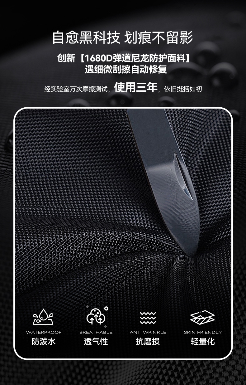 材质耐磨防泼水;包身大容量,智能增宽8cm;背部全域循环透气系统,背部内置弹簧系统减负减震