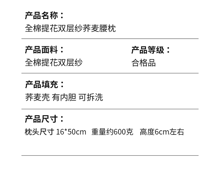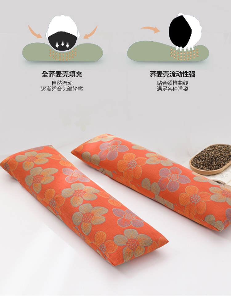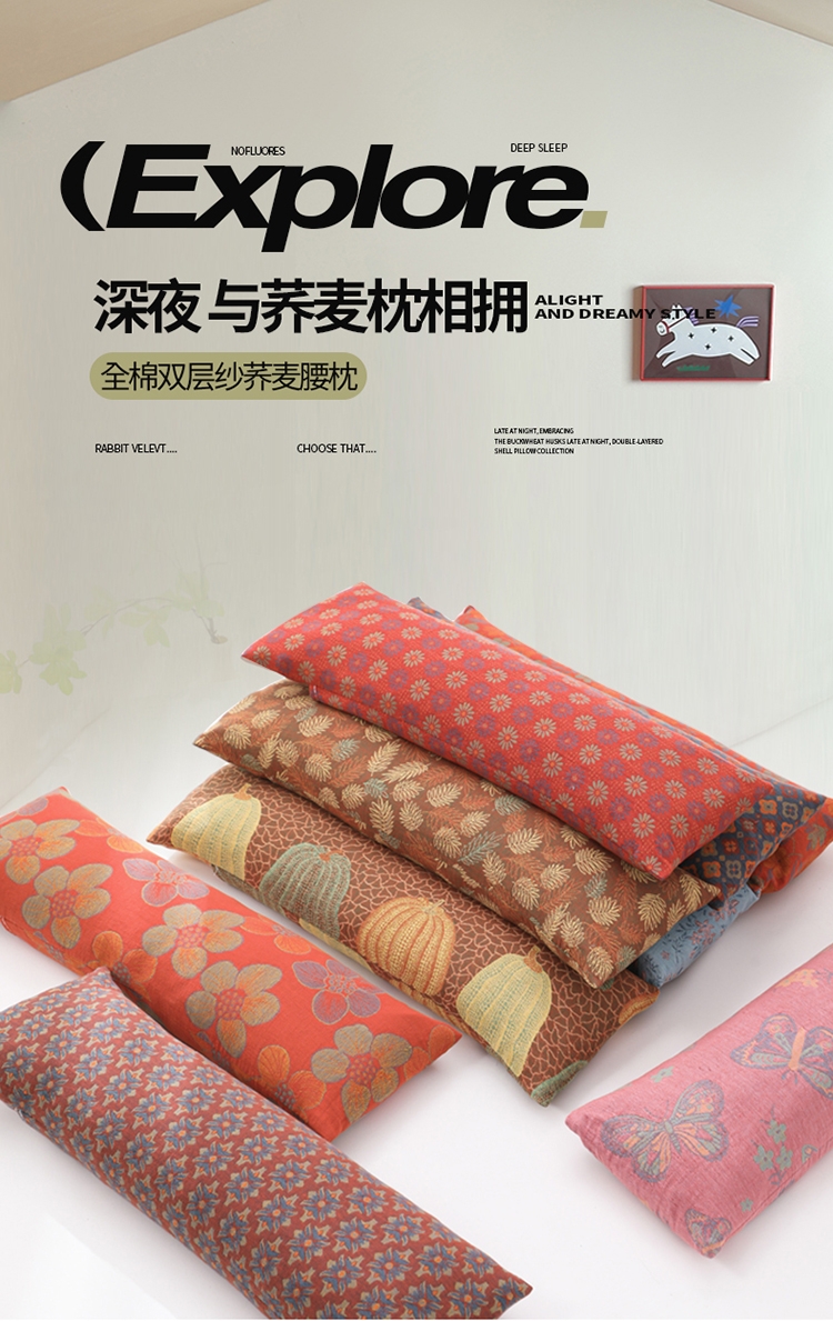 深夜与荞麦枕相拥,全棉双层纱荞麦养身多功能腰枕;全棉提花双层纱柔软的肌肤触碰感 #触感柔软细腻感知;#品质优良的荞麦壳成壳率高颗粒饱满洁净清香