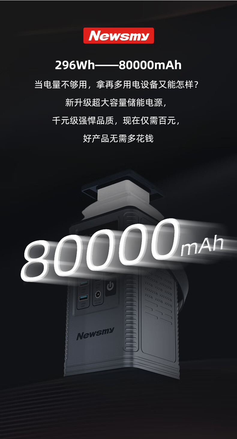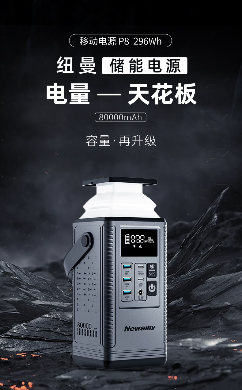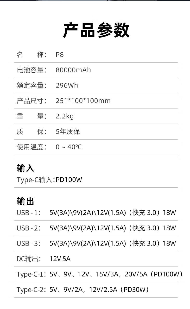 大容量80000毫安,多口输出最大功率208W;迷你小巧,更适合户外;严格测试,安全防护