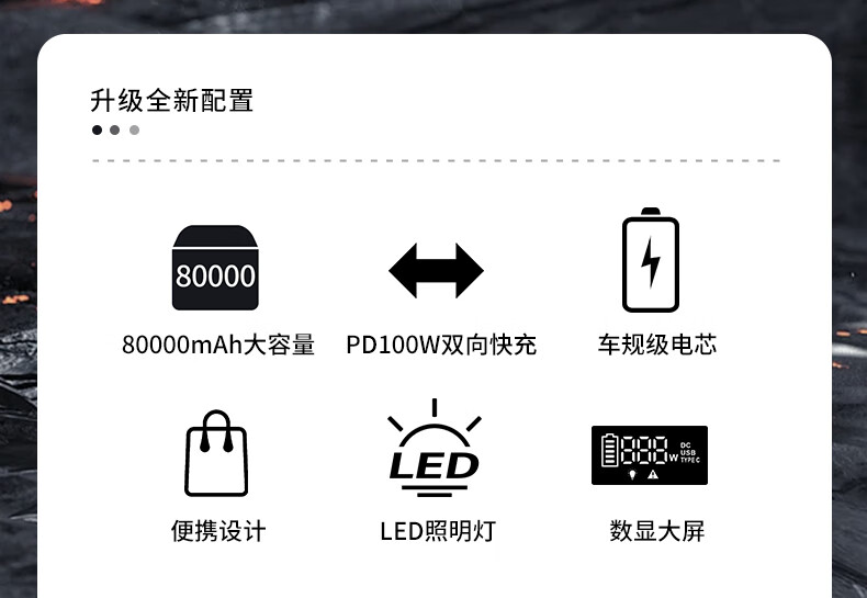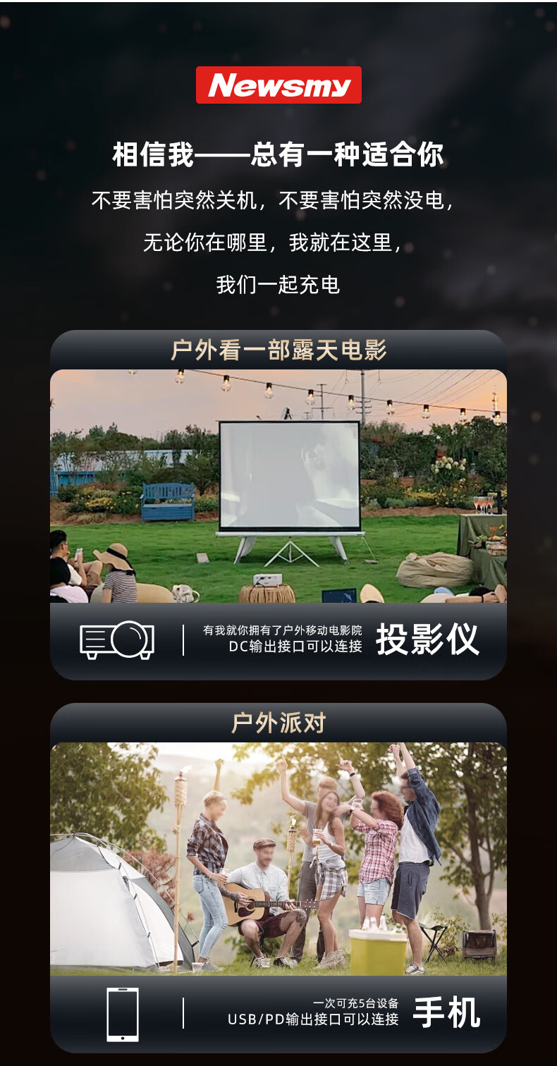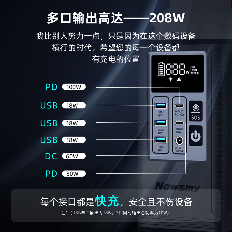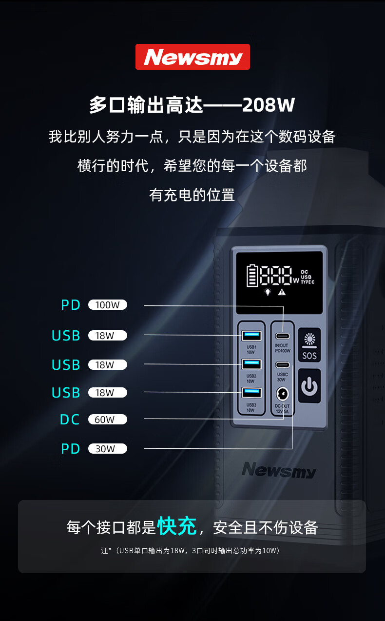 大容量80000毫安,多口输出最大功率208W;迷你小巧,更适合户外;严格测试,安全防护