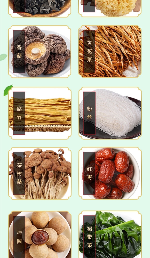 配置清单:山木耳80克*1袋 银耳80克*1袋 香菇80克*1袋 黄花菜80克*1袋 黄豆腐竹200克*1袋 粉丝400克*1袋 茶树菇70克*1袋 红枣300克*1袋 桂圆200克*1袋 裙带菜100克*1袋 紫菜50克*1袋 鹿茸菇60克*1袋