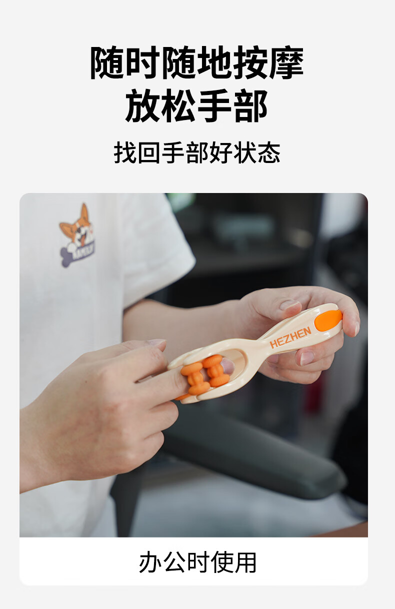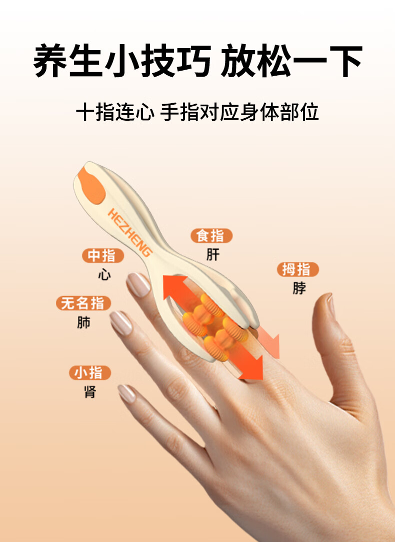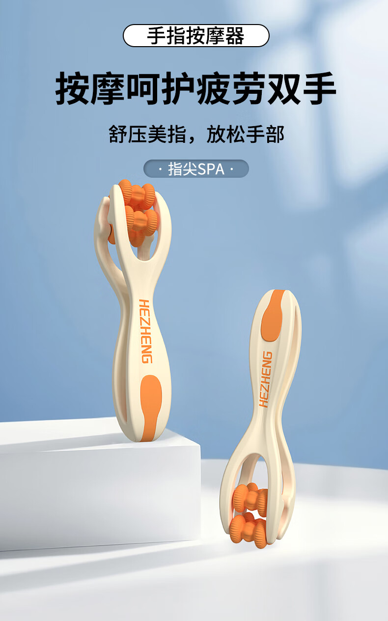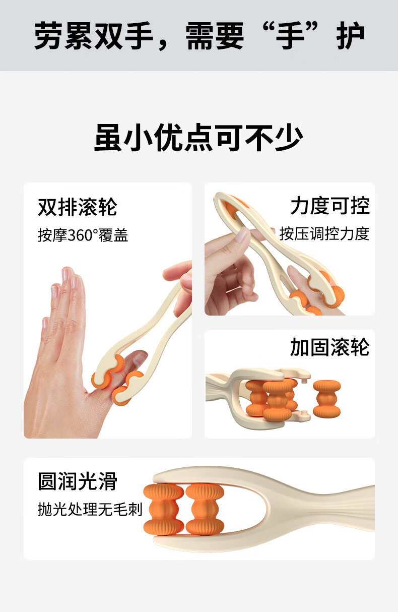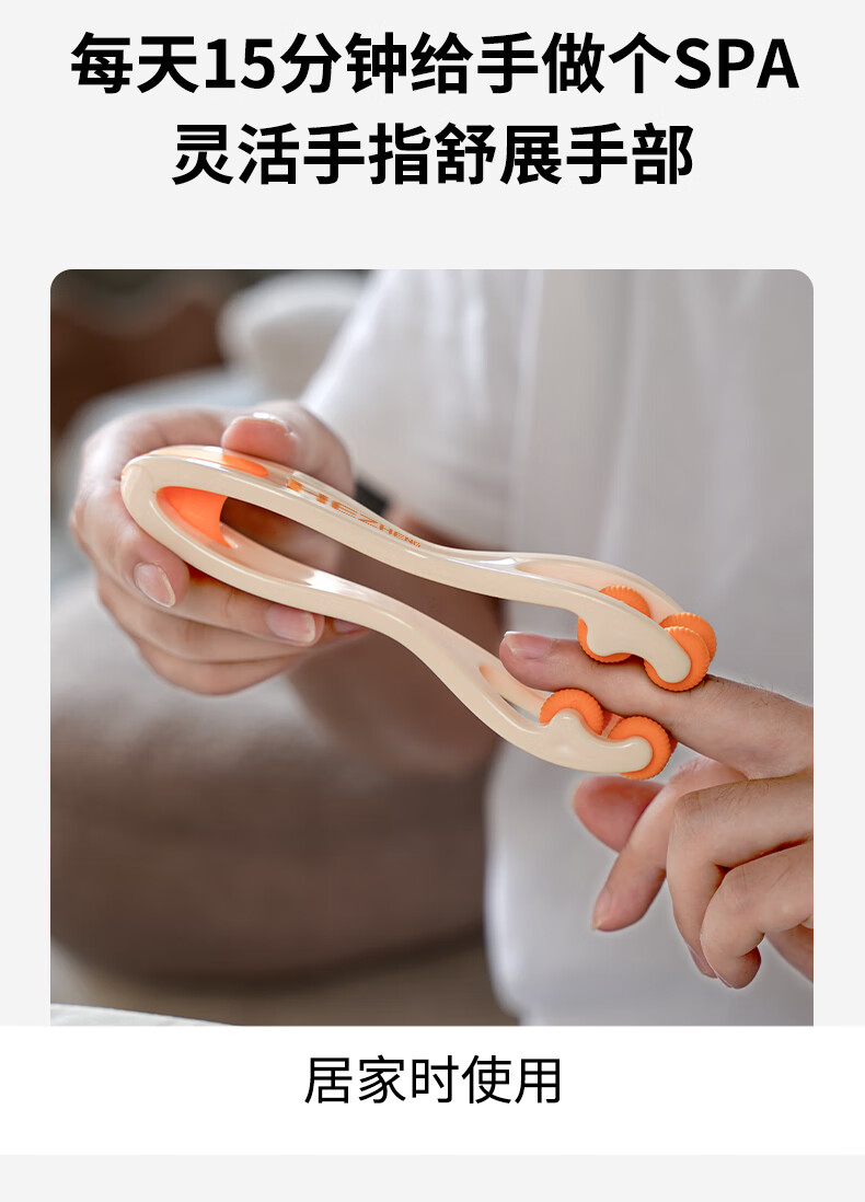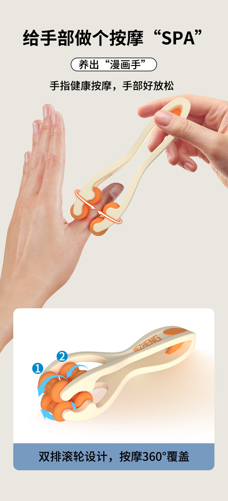 给手部做个SPA,美指舒压,体积小巧,随时按摩;硅胶材质,安心使用,舒适享受;双排滚轮设计,按摩360°全覆盖,边缘抛光处理