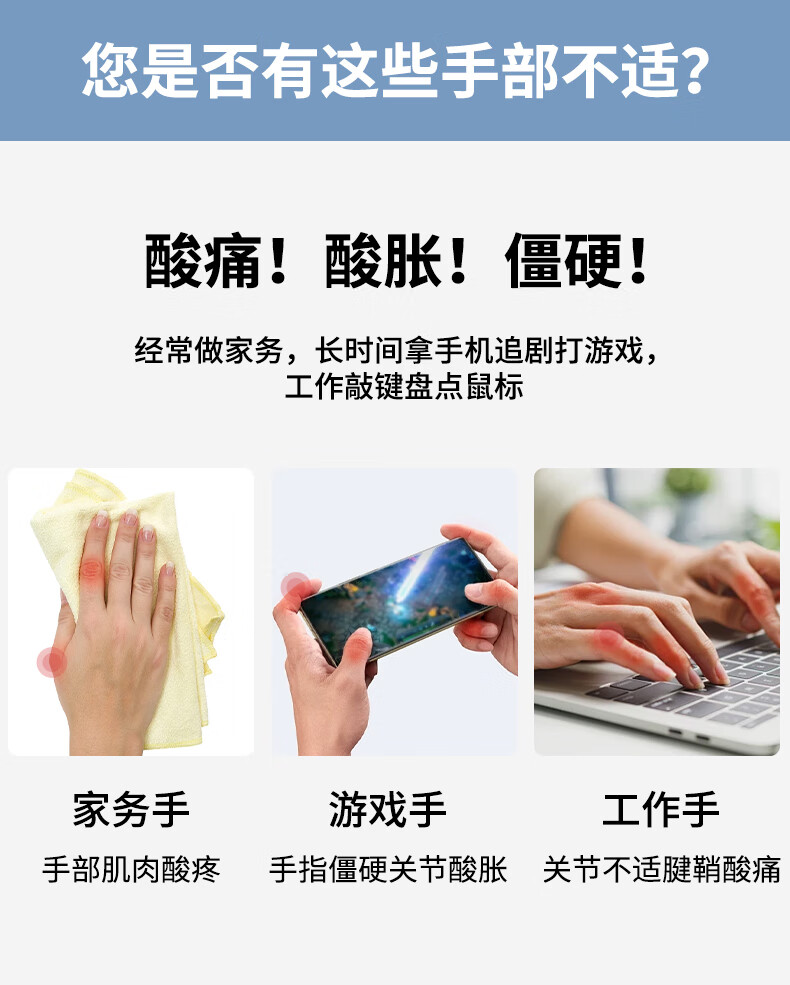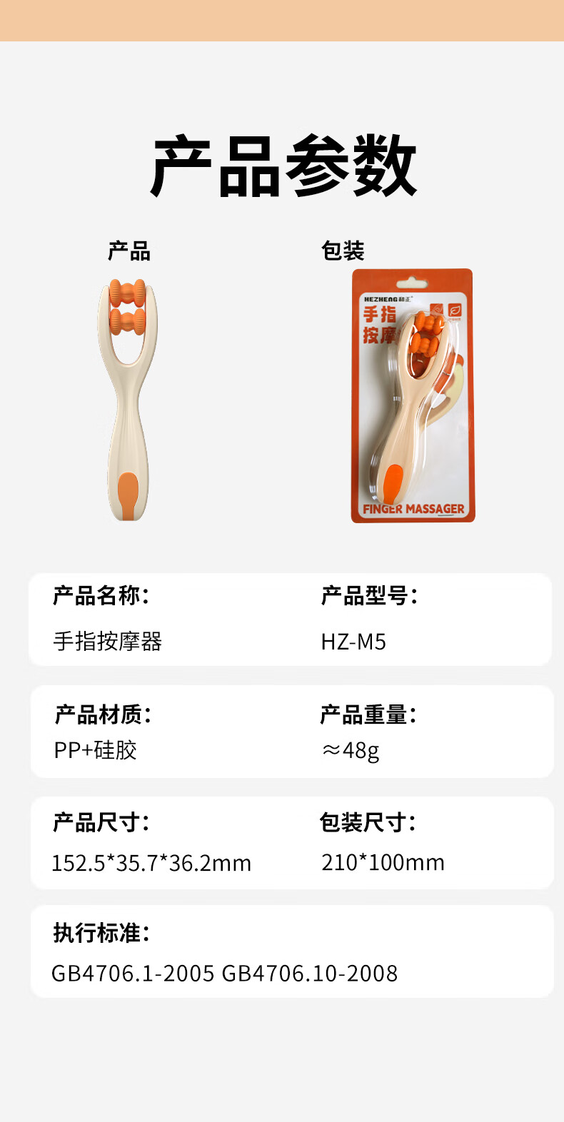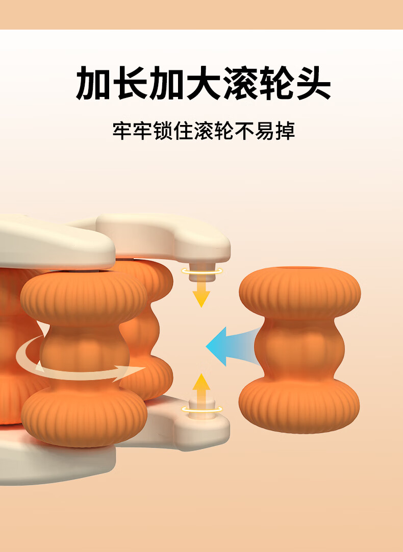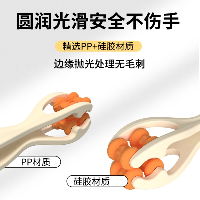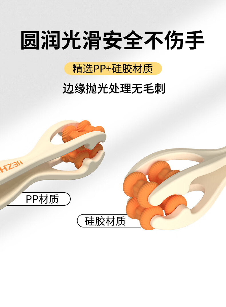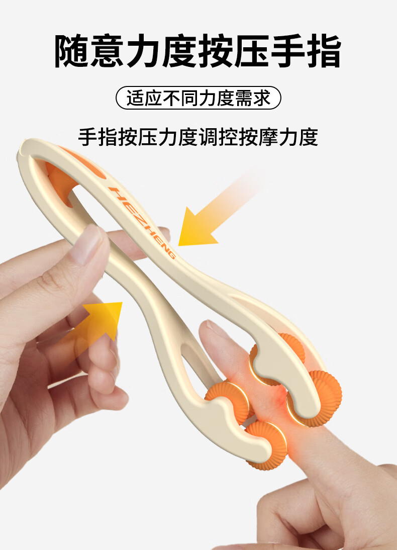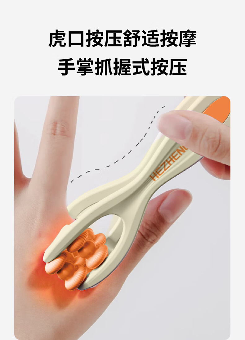 给手部做个SPA,美指舒压,体积小巧,随时按摩;硅胶材质,安心使用,舒适享受;双排滚轮设计,按摩360°全覆盖,边缘抛光处理
