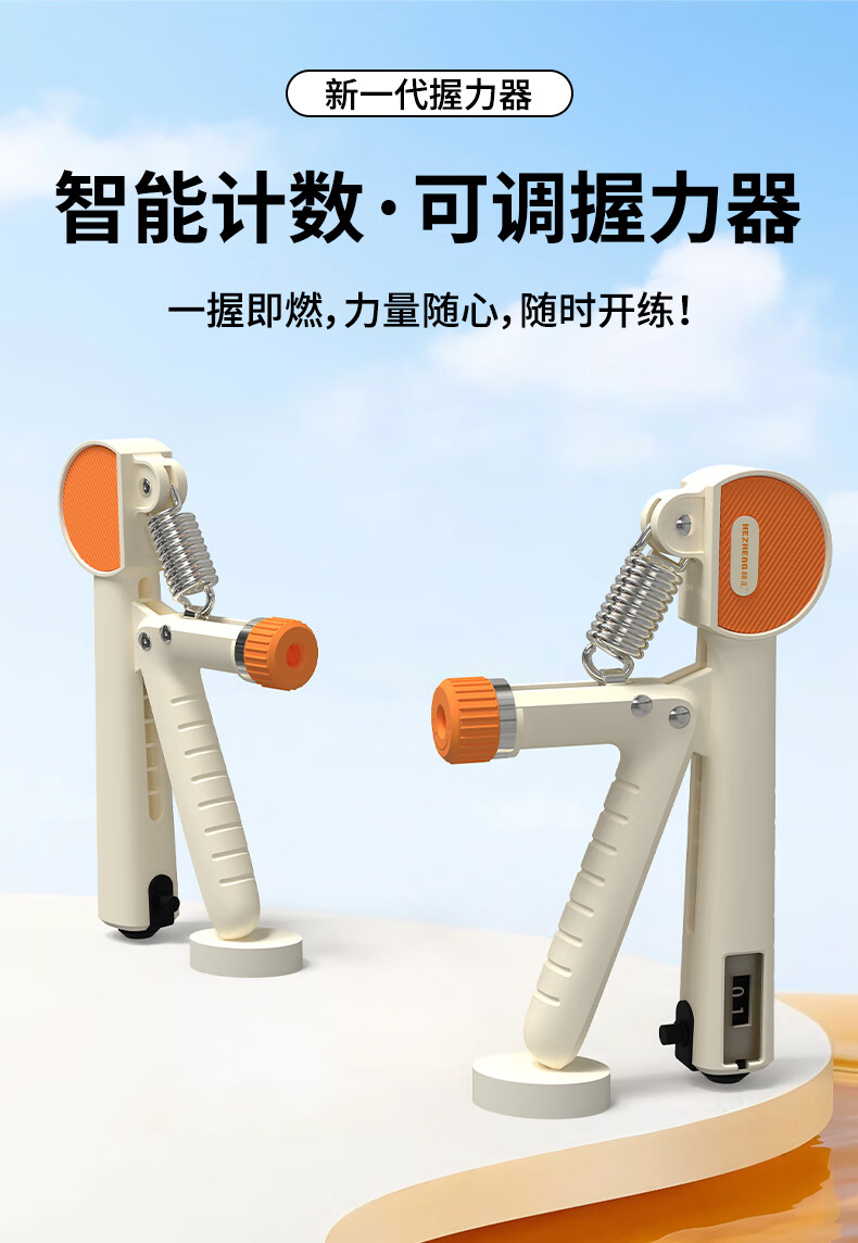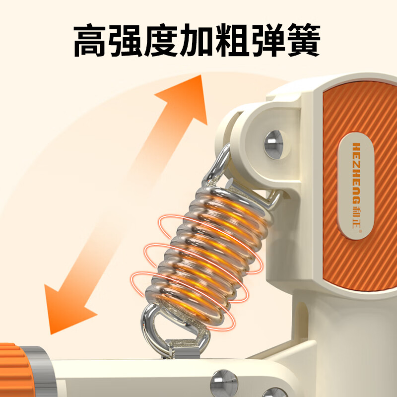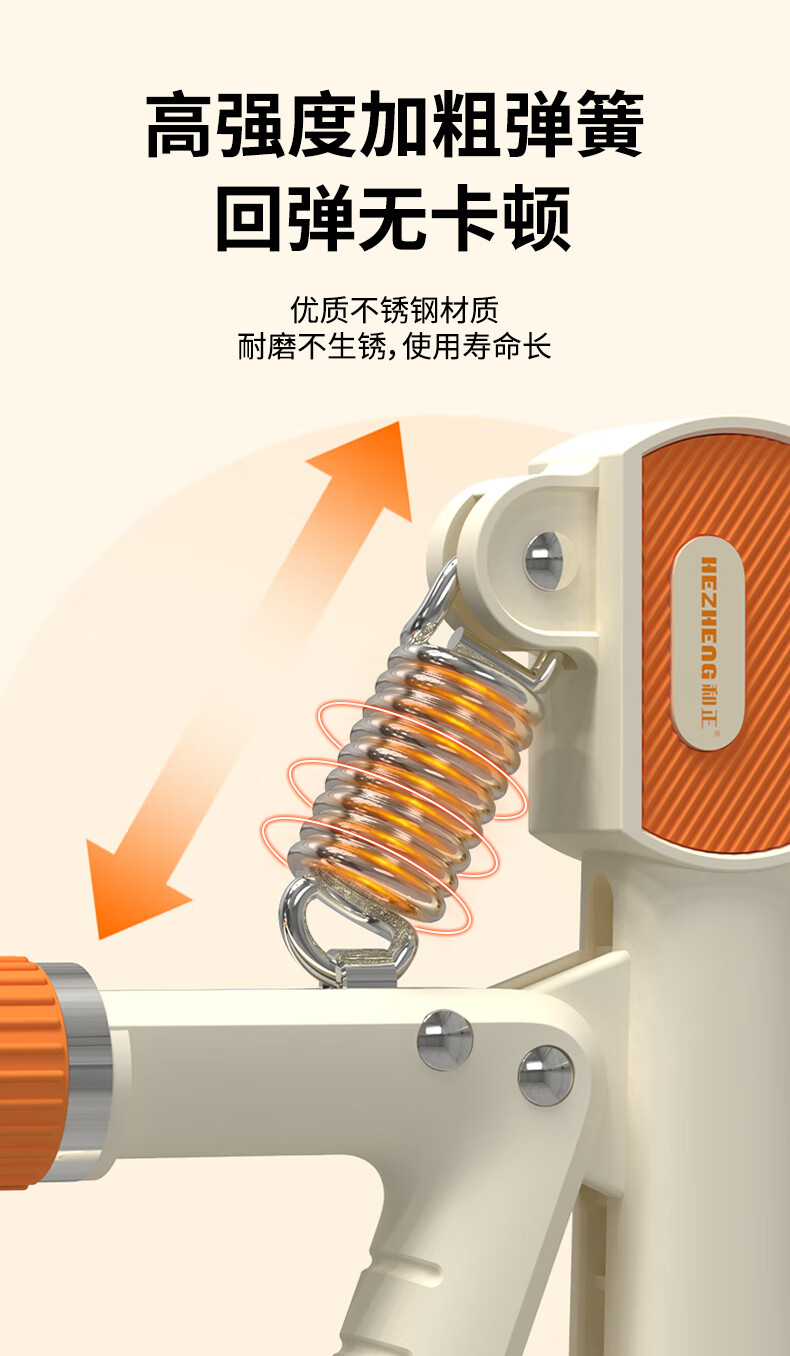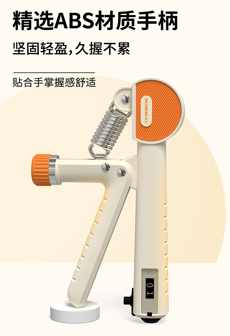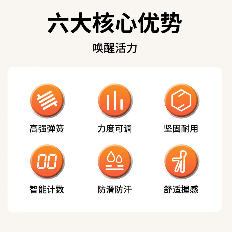 ABS材质手柄,横向沟槽纹路设计,贴合手掌舒适防滑;高强度加粗弹簧,坚固耐用不断裂;智能机械计数,一目了然,操作简单;5-60kg力度可调节,旋转钮帽即可调大调小力度值;便携小巧,轻松放进口袋,随时随地锻炼起来