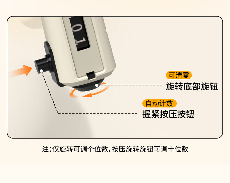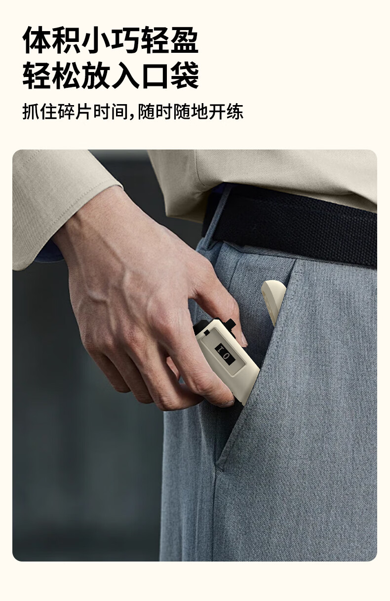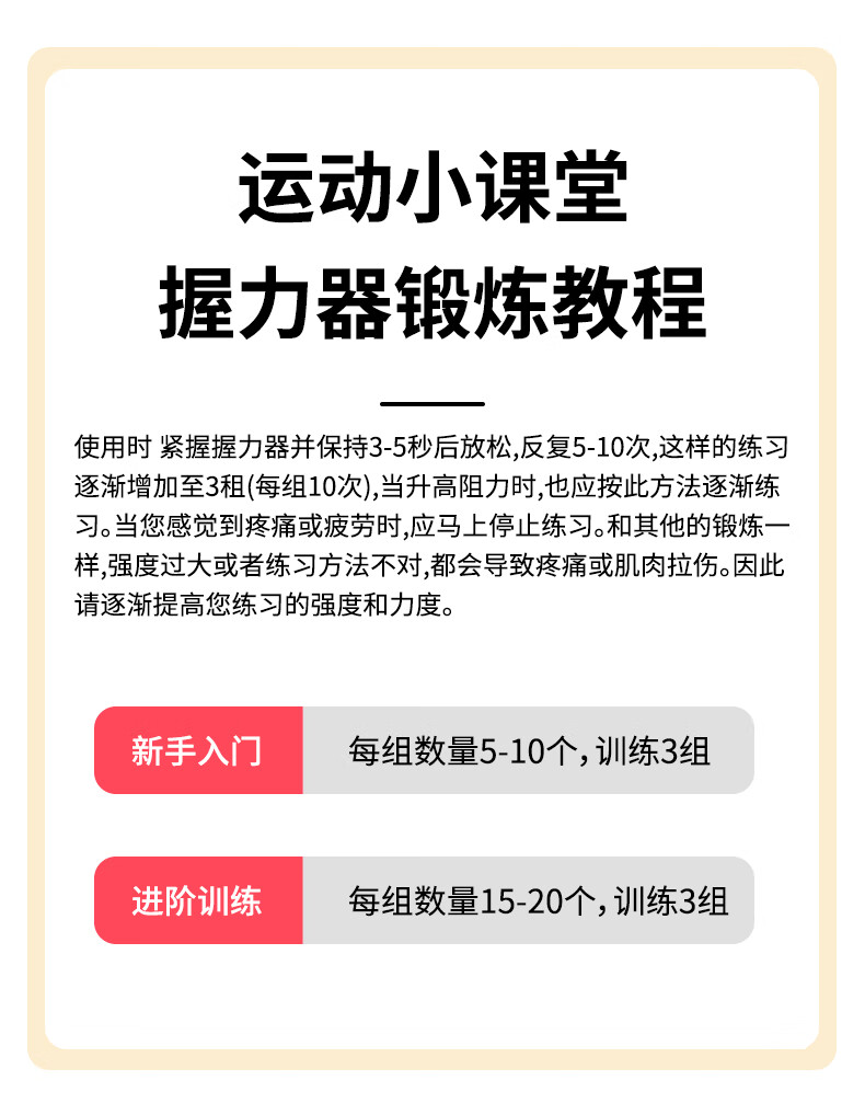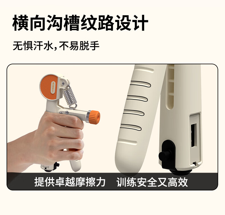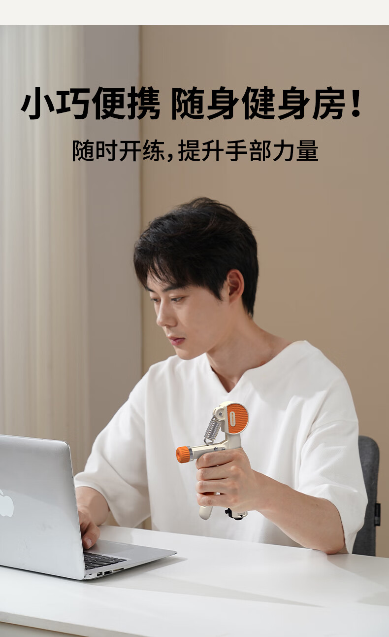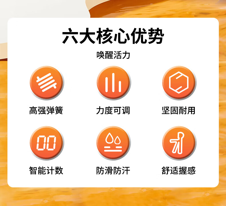 ABS材质手柄,横向沟槽纹路设计,贴合手掌舒适防滑;高强度加粗弹簧,坚固耐用不断裂;智能机械计数,一目了然,操作简单;5-60kg力度可调节,旋转钮帽即可调大调小力度值;便携小巧,轻松放进口袋,随时随地锻炼起来