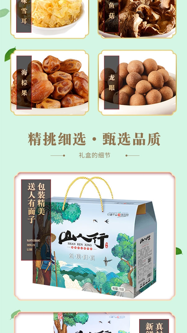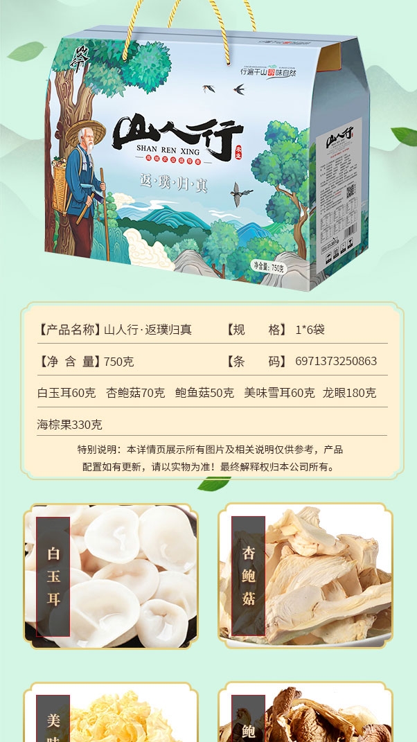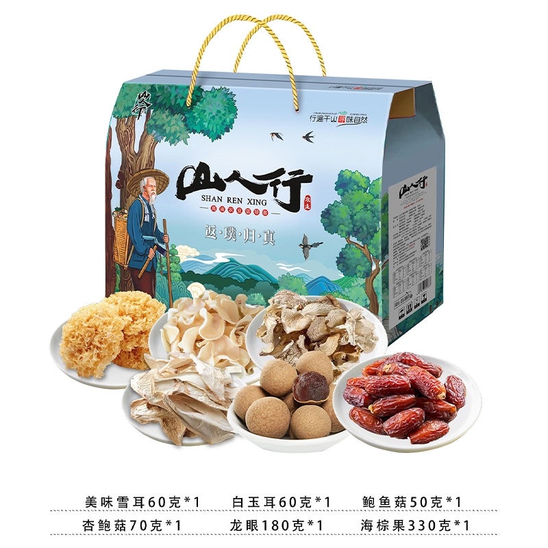 配置清单:美味雪耳60克*1袋 白玉耳60克*1袋 鲍鱼菇50克*1袋 杏鲍菇70克*1袋 龙眼180克*1袋 海棕果330克*1袋