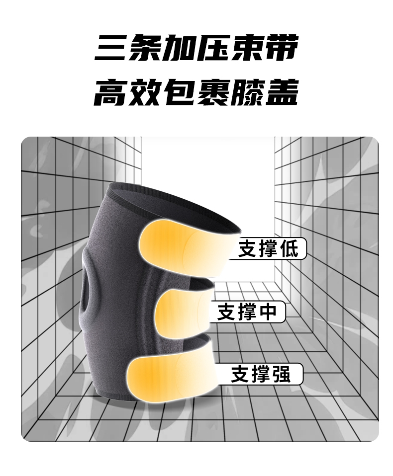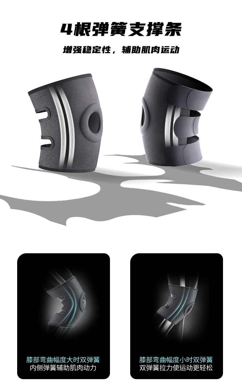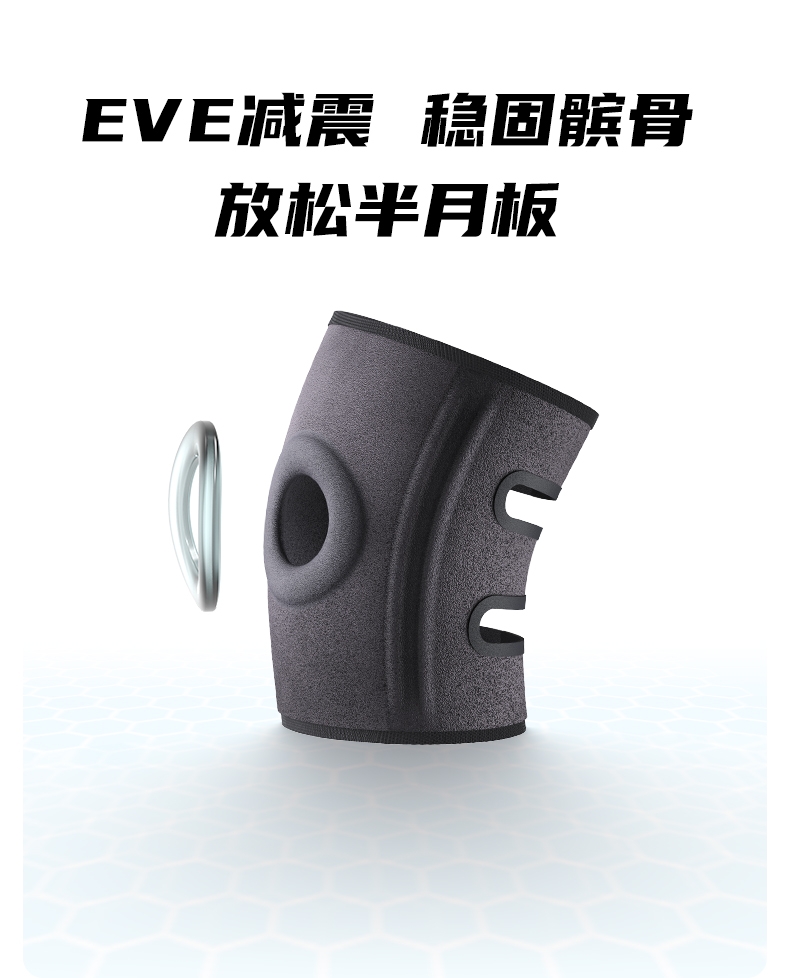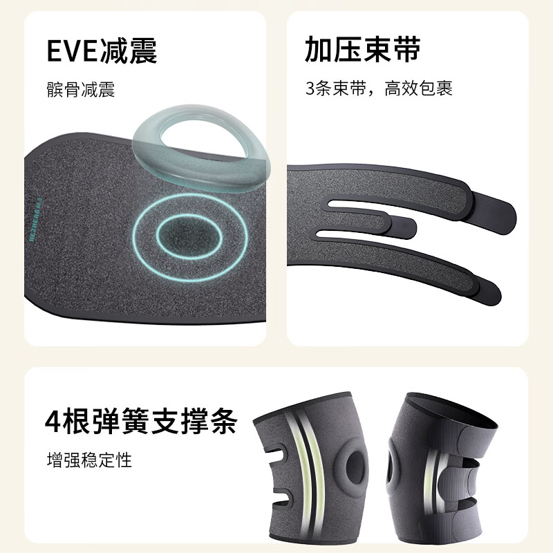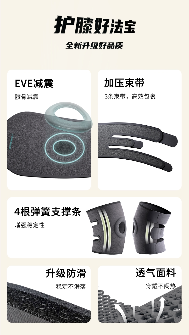 四根弹簧支撑条,增强稳定性;升级COOLMAX面料,亲肤透气,吸汗排湿;EVE髌骨衬垫,防撞、减震、减压;背面升级铺满防滑条,超强稳定、不易滑落;三条加压束带,高效包裹膝盖,自由调节各部位松紧