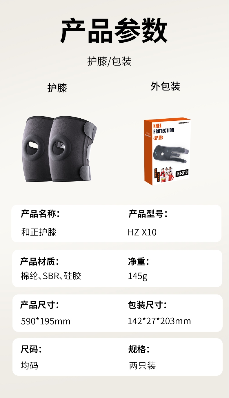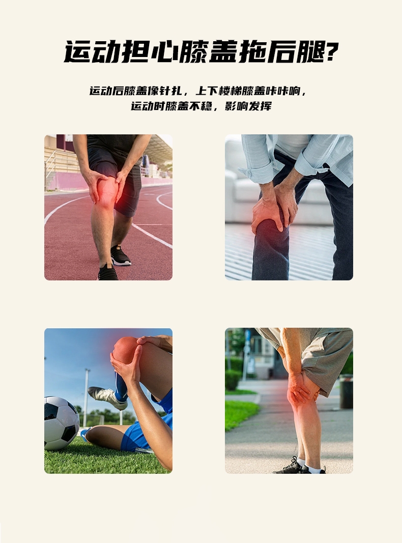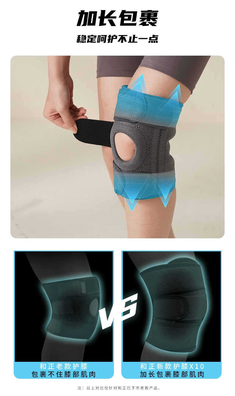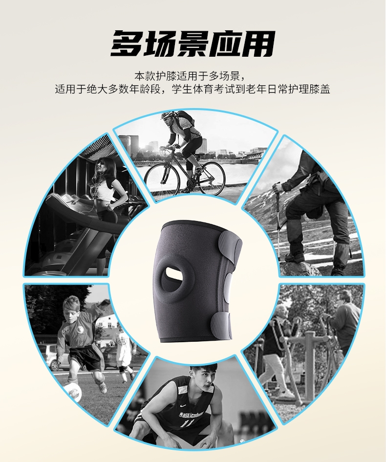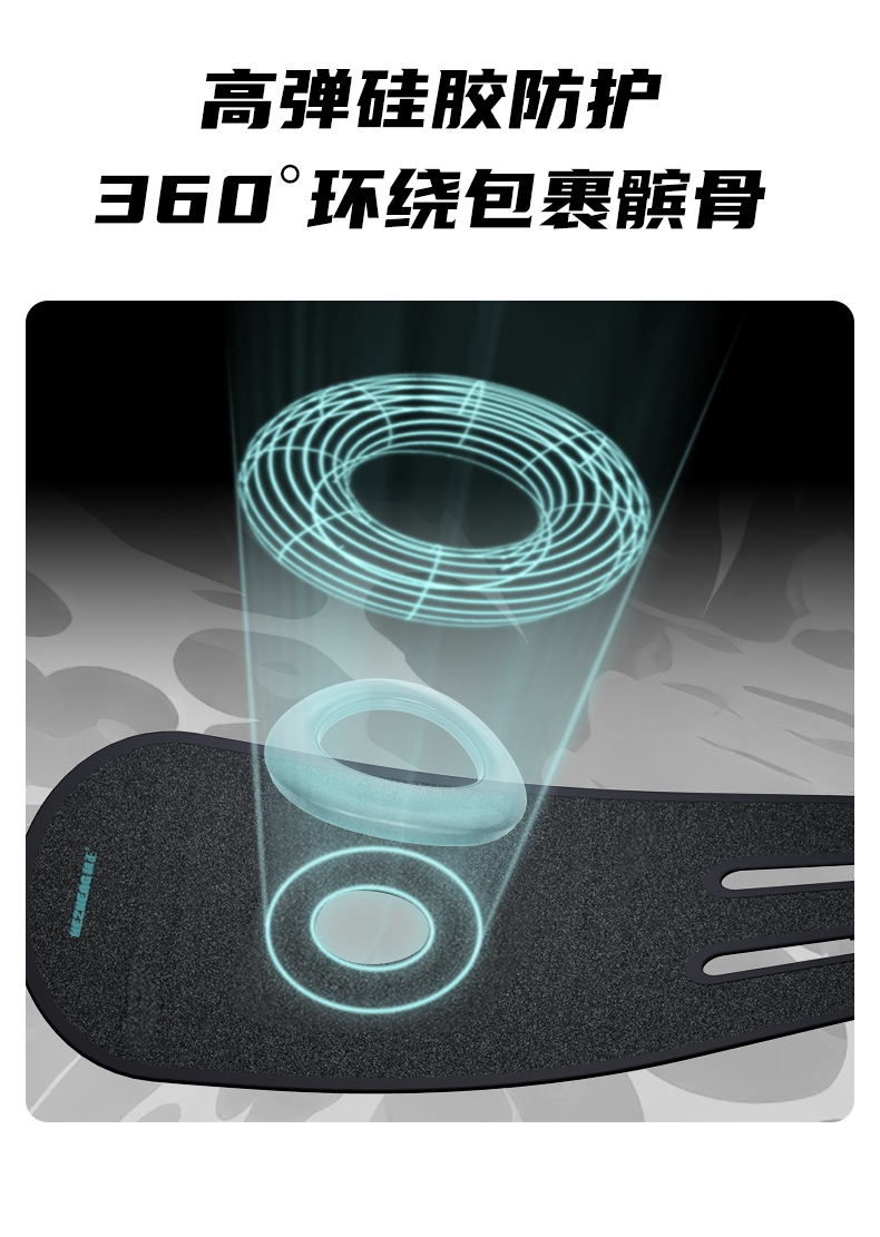四根弹簧支撑条,增强稳定性;升级COOLMAX面料,亲肤透气,吸汗排湿;EVE髌骨衬垫,防撞、减震、减压;背面升级铺满防滑条,超强稳定、不易滑落;三条加压束带,高效包裹膝盖,自由调节各部位松紧