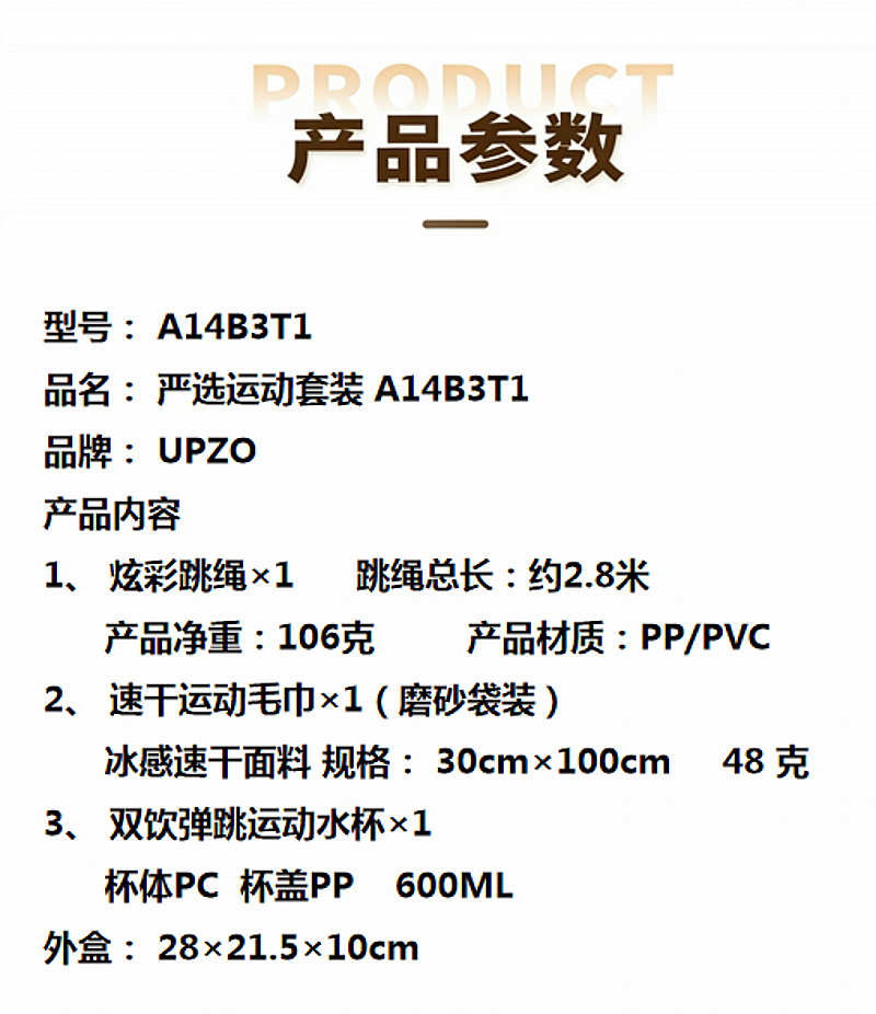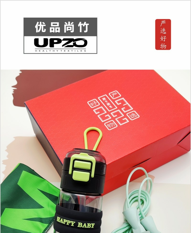 配置清单:炫彩跳绳*1、弹跳运动水杯*1、速干运动毛巾*1、礼盒*1