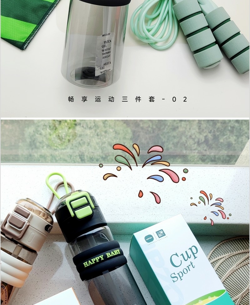 七彩运动巾 速干面料 外观设计风格靓丽;炫彩跳绳 时尚手柄设计 外观靓丽品质优异;双饮弹跳水杯 600毫升容量 优质PC杯体