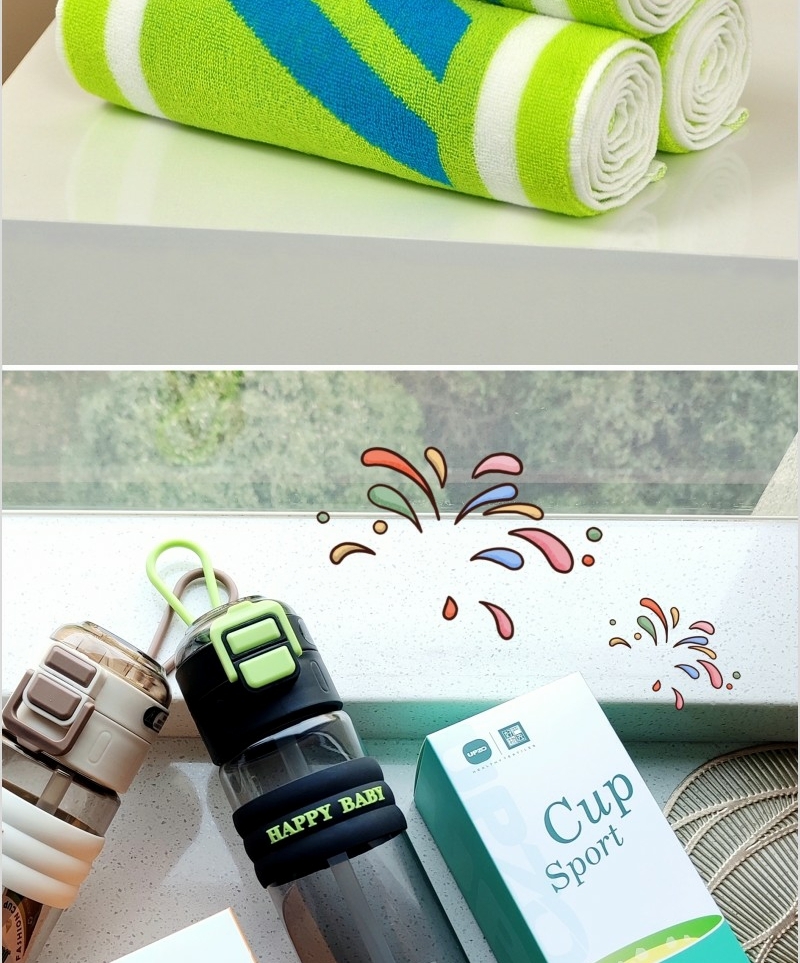 炫彩跳绳 时尚手柄设计 外观靓丽品质优异;纯棉提花运动巾 时尚外观 精梳棉材质 超强吸水;双饮运动水杯 可采用吸管 也可以大口径直饮