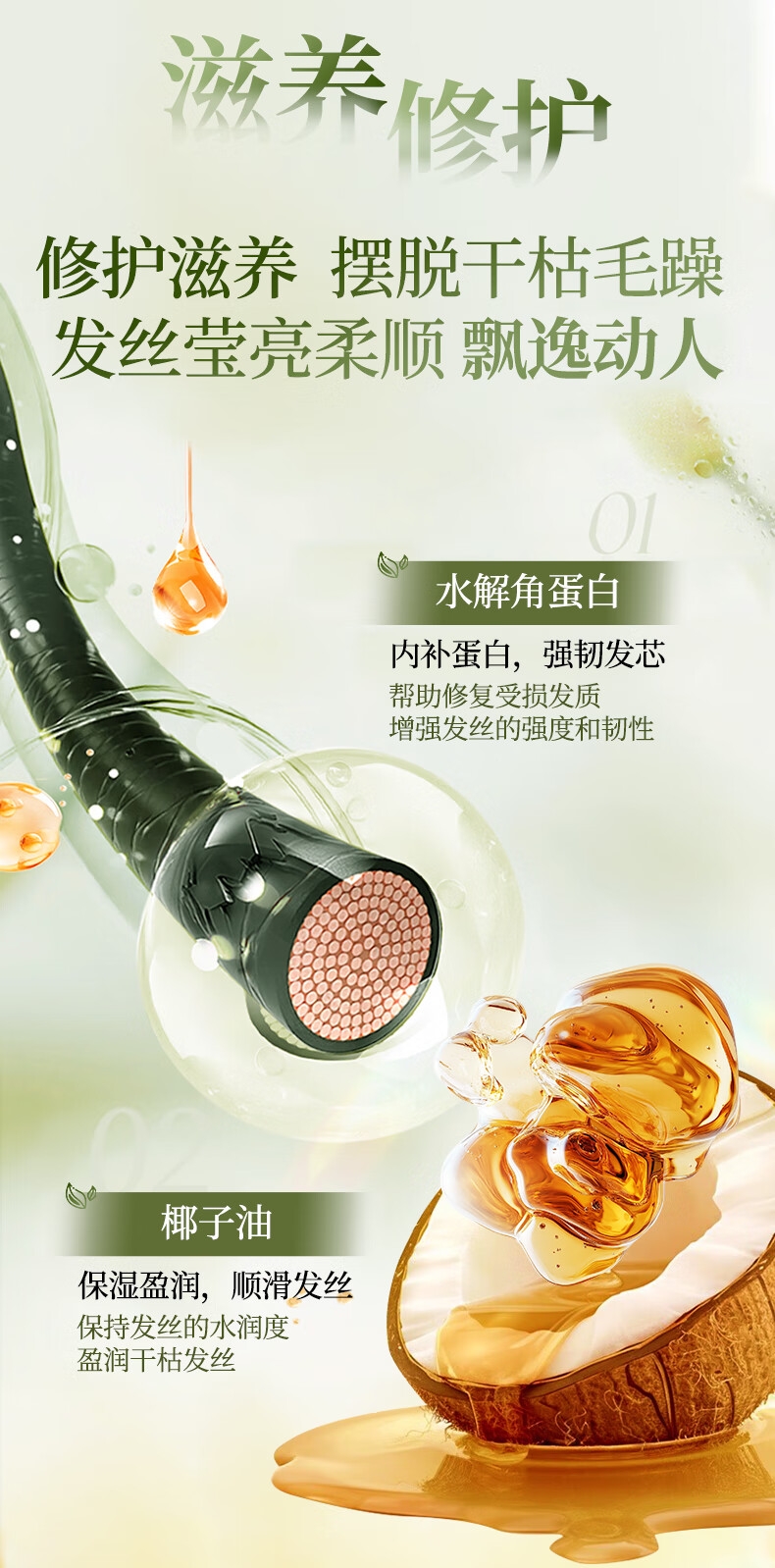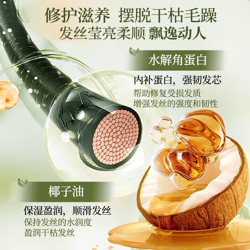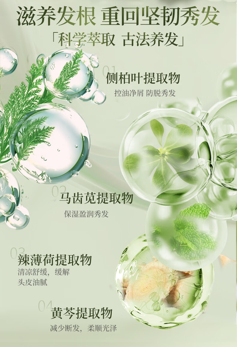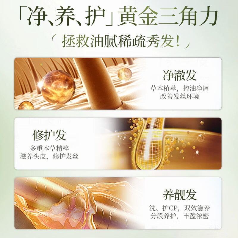 草本植萃,控油净屑 改善发丝环境;多重本草精粹,滋养头皮,修护发丝;洗、护CP,双效滋养分段养护,丰盈蓬松