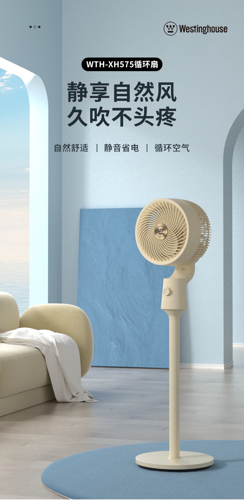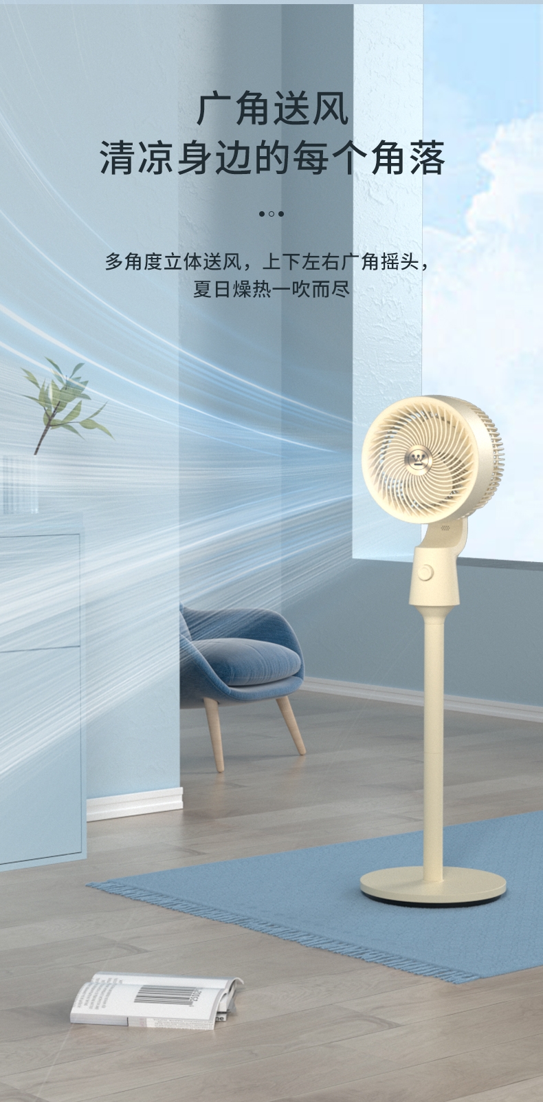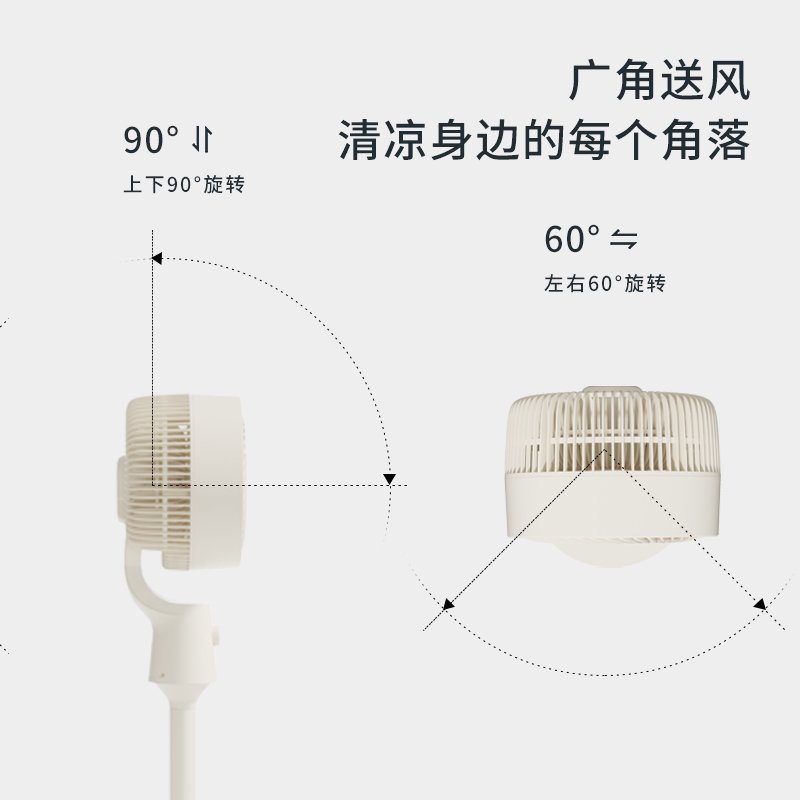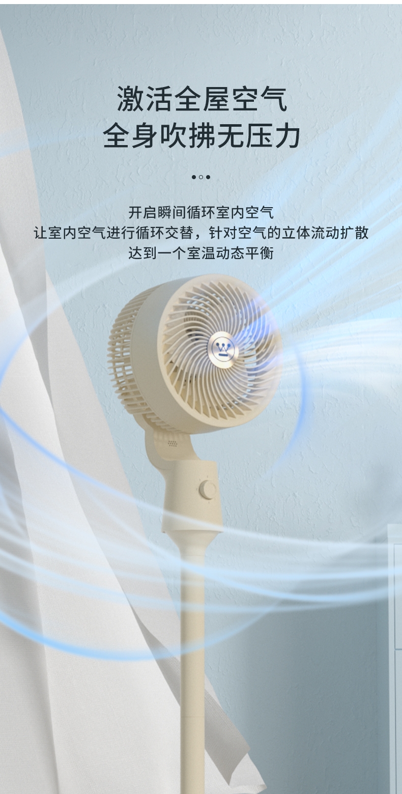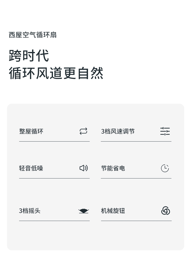 西屋超高性价比循环扇 3档风速调节,满足不同需求;左右50°上下90°摇头,台立两用,高度可调节;旋钮式操控,简单易懂,低噪音设计,轻柔不扰眠