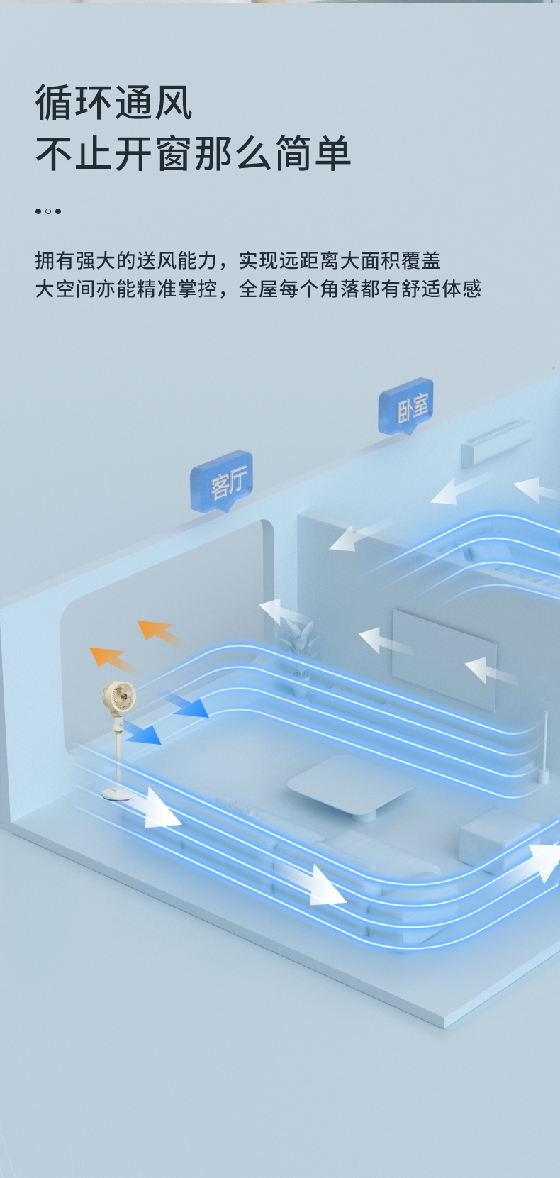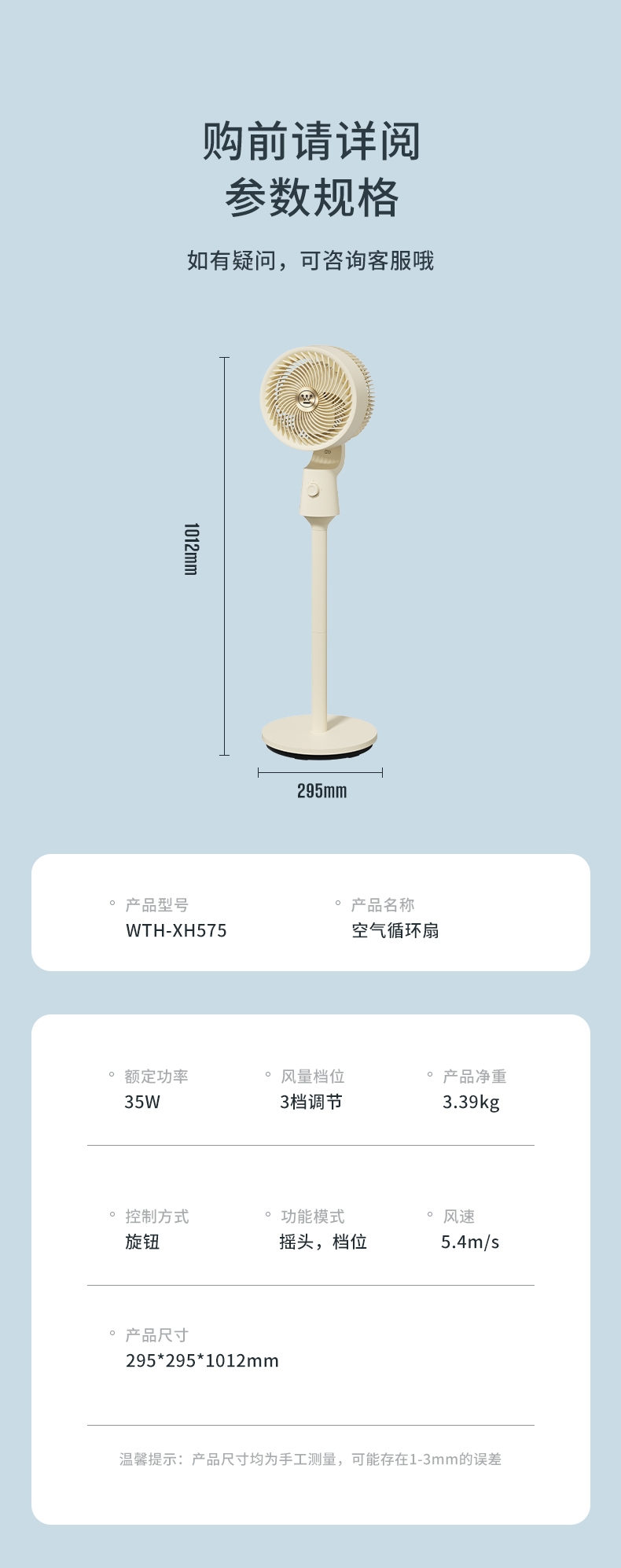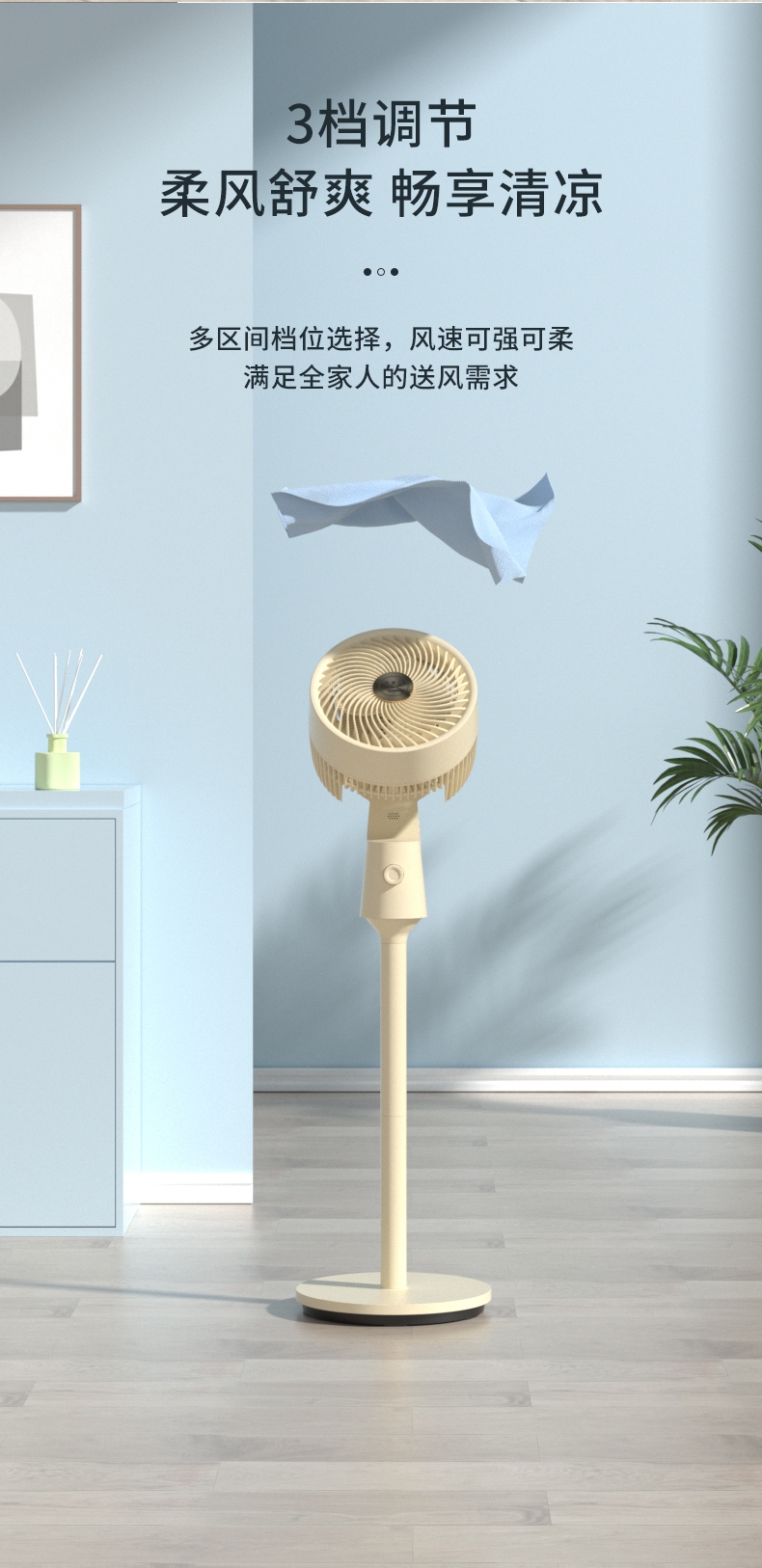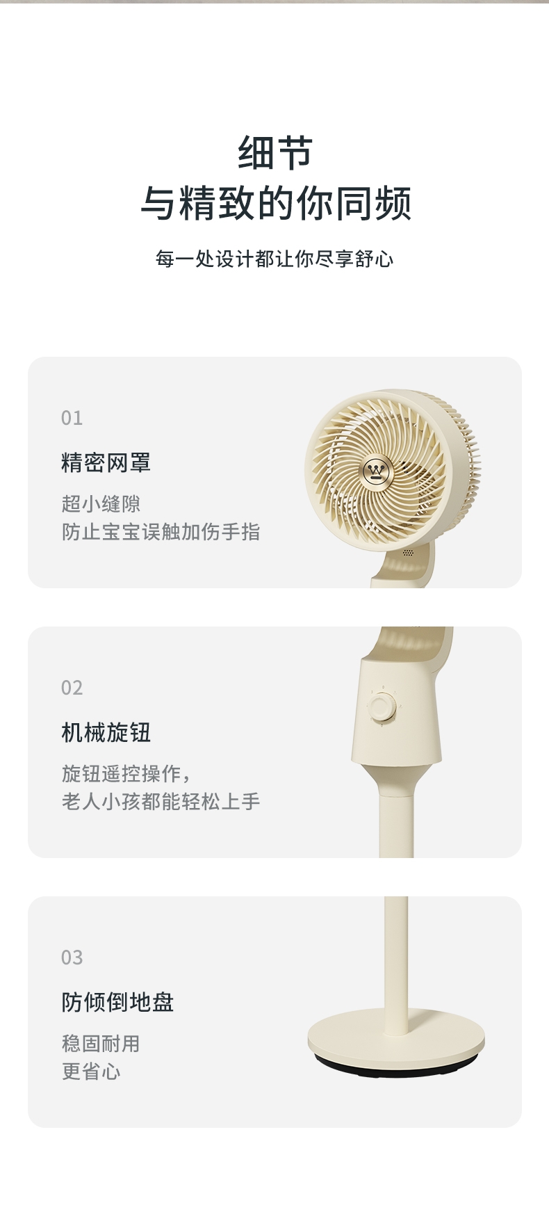 西屋超高性价比循环扇 3档风速调节,满足不同需求;左右50°上下90°摇头,台立两用,高度可调节;旋钮式操控,简单易懂,低噪音设计,轻柔不扰眠
