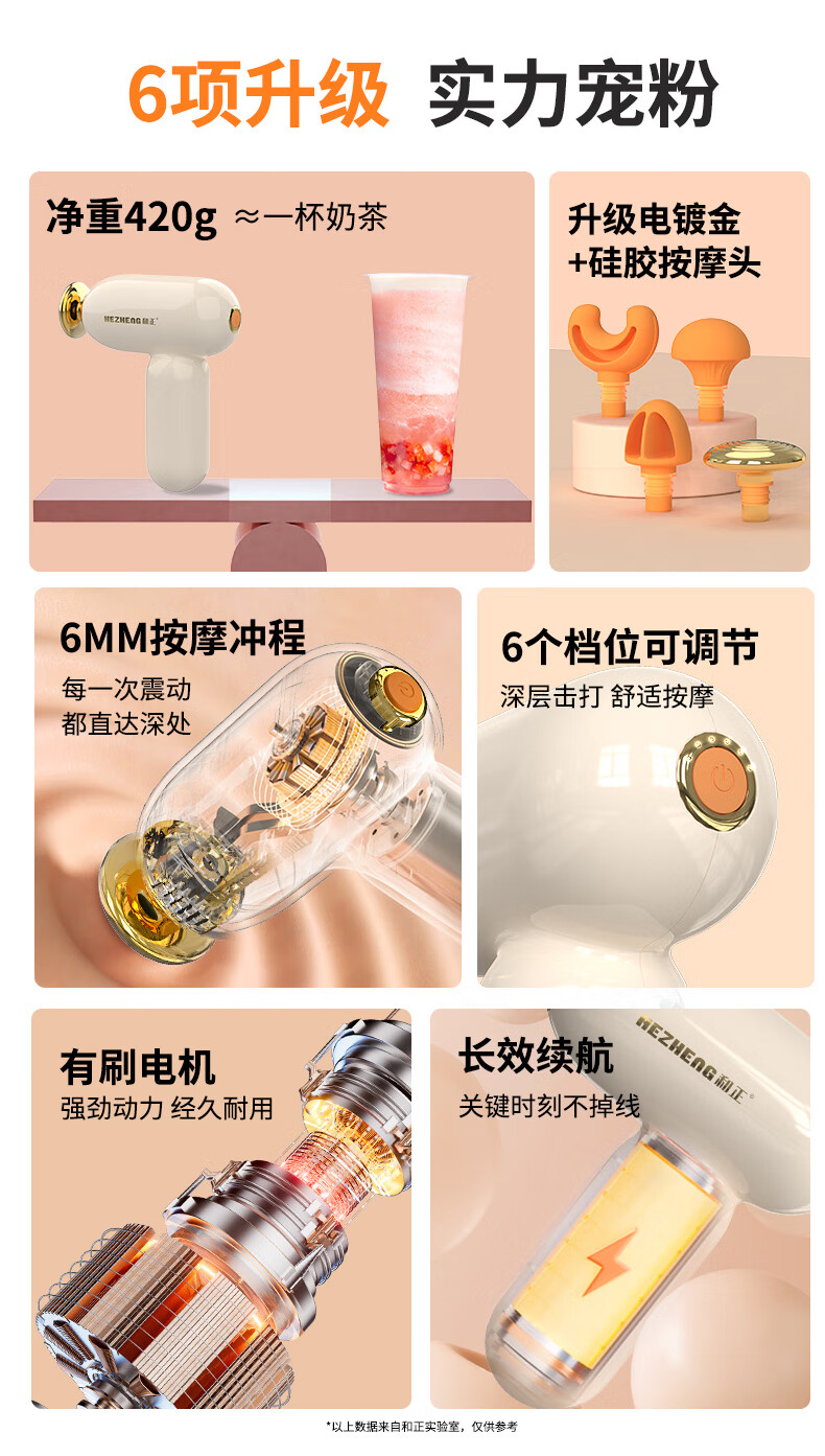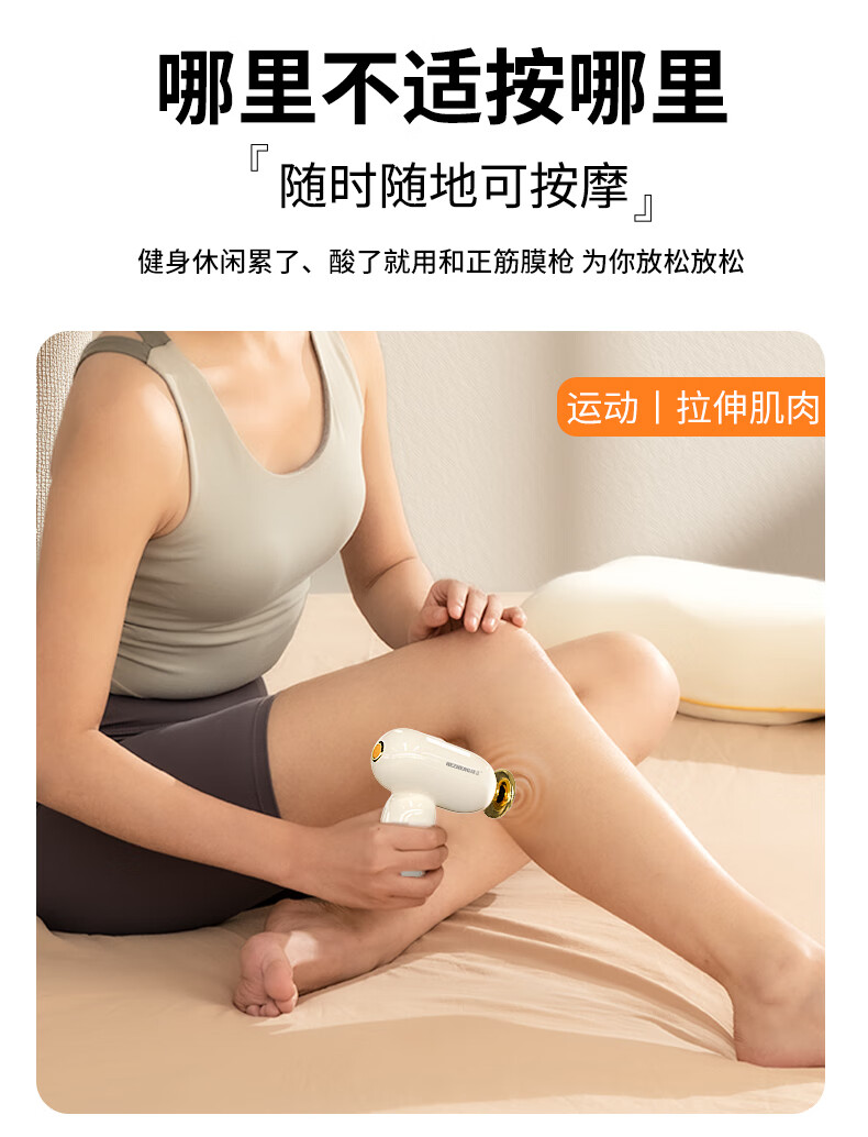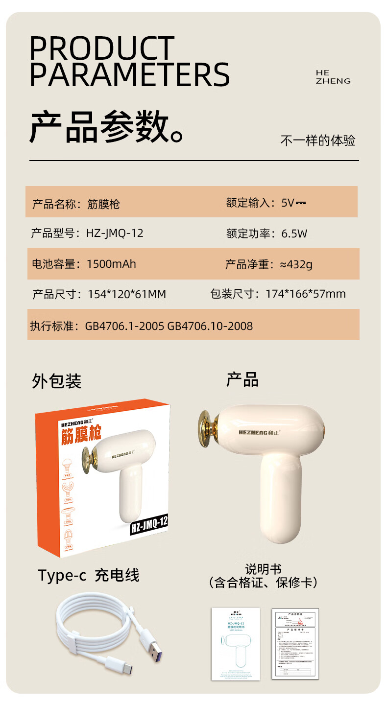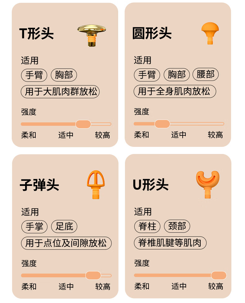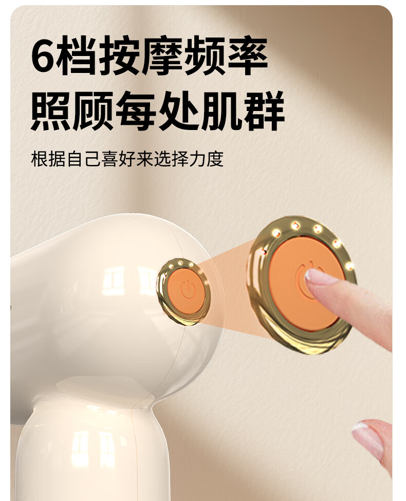 6档按摩频率,照顾每处肌群;大容量电池,持久续航,TYPE-C通用接口;按摩不震手,减震分区设计,减少按摩时手部的震感;久用不发烫,长时间使用不烫手;精选4款专业按摩头T形头、圆形头、子弹头、U形头