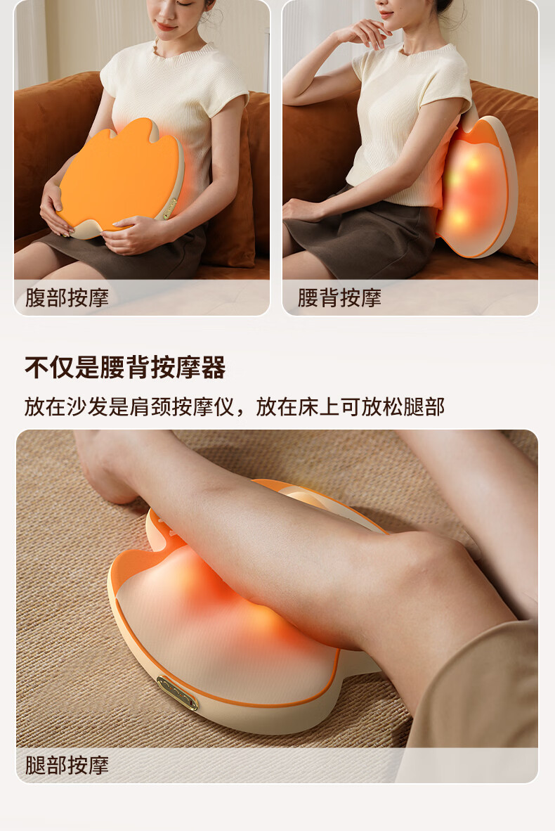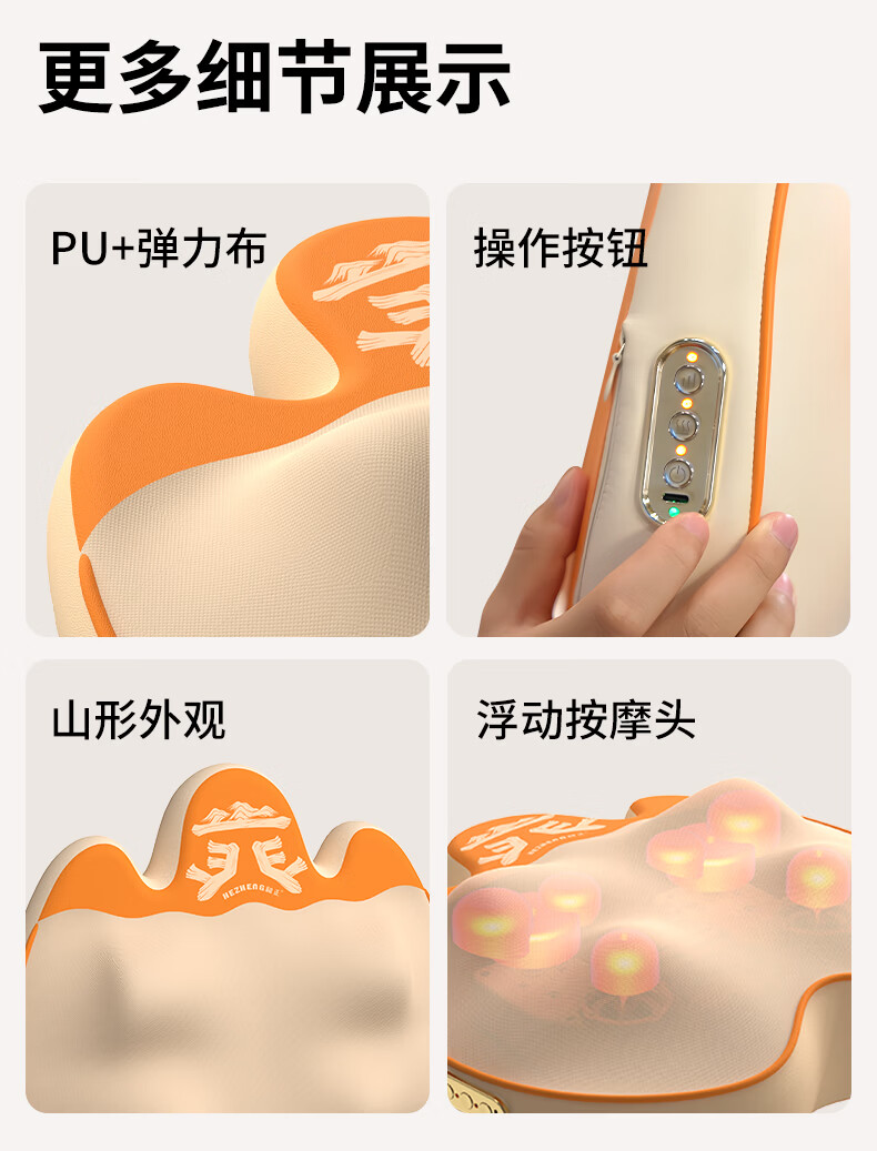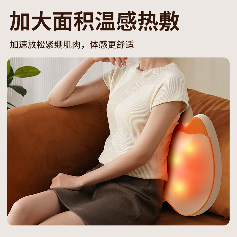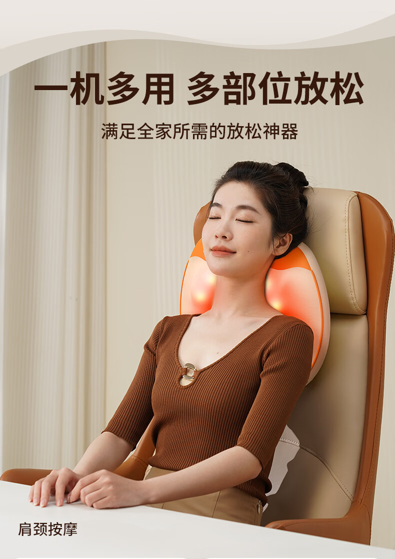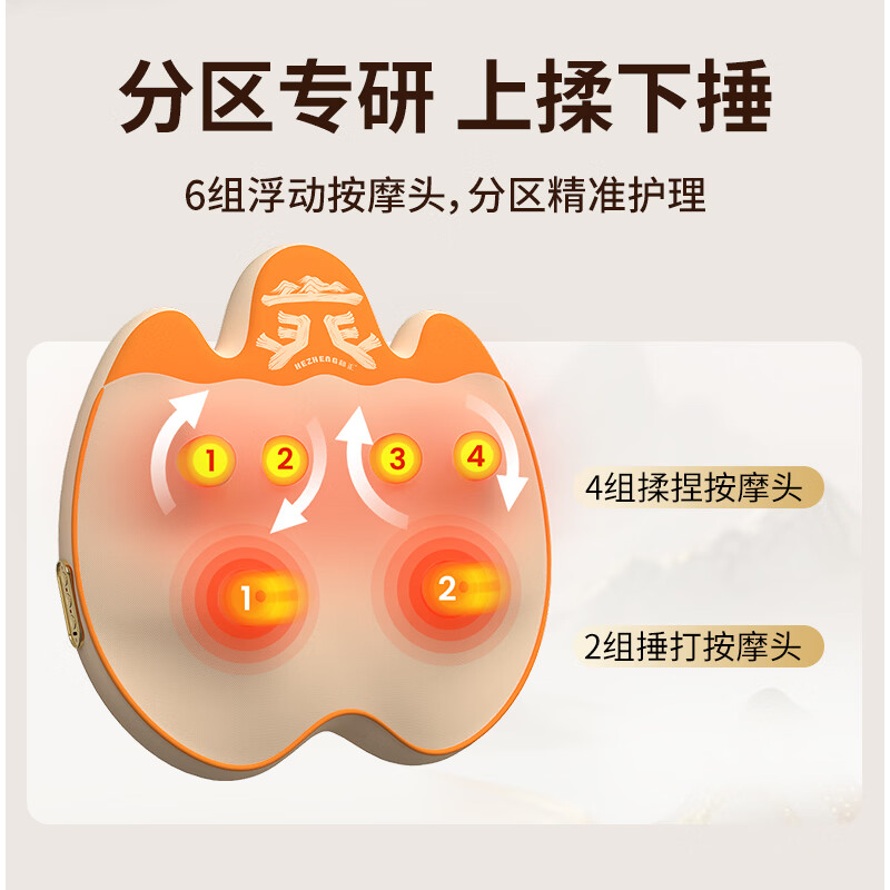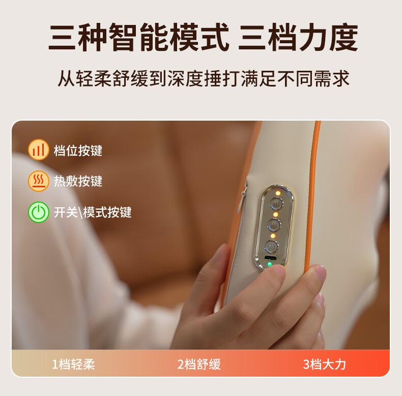 6组浮动按摩头,分区精准施力,上部4组揉捏头;下部2组捶打头;三种模式,随心切换、三档力度可调;材质安全、续航长、无线便携、自动定时