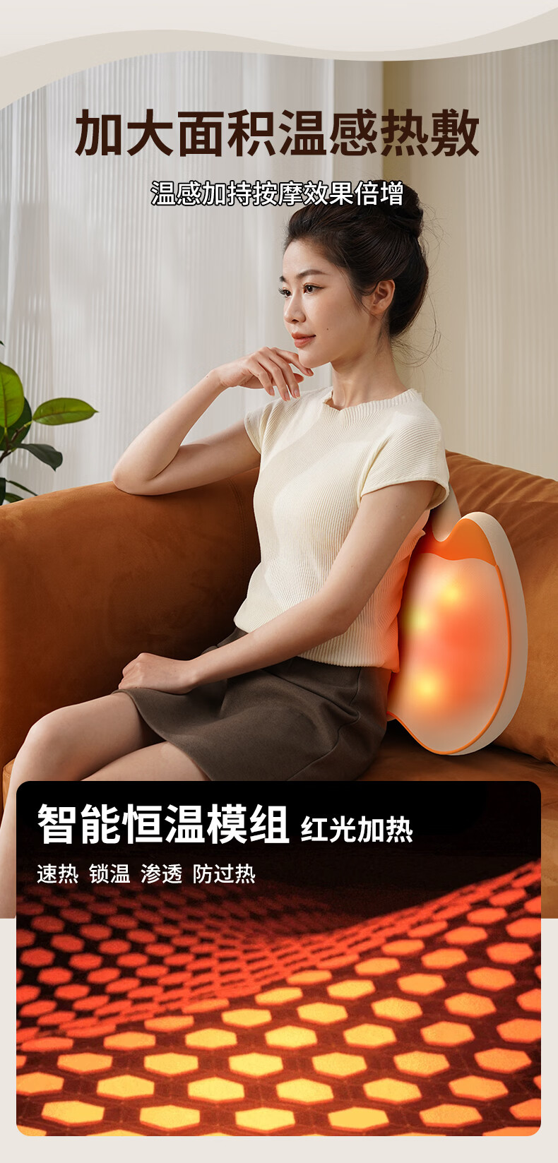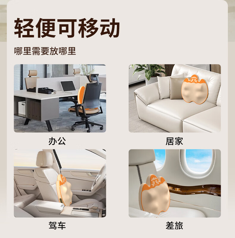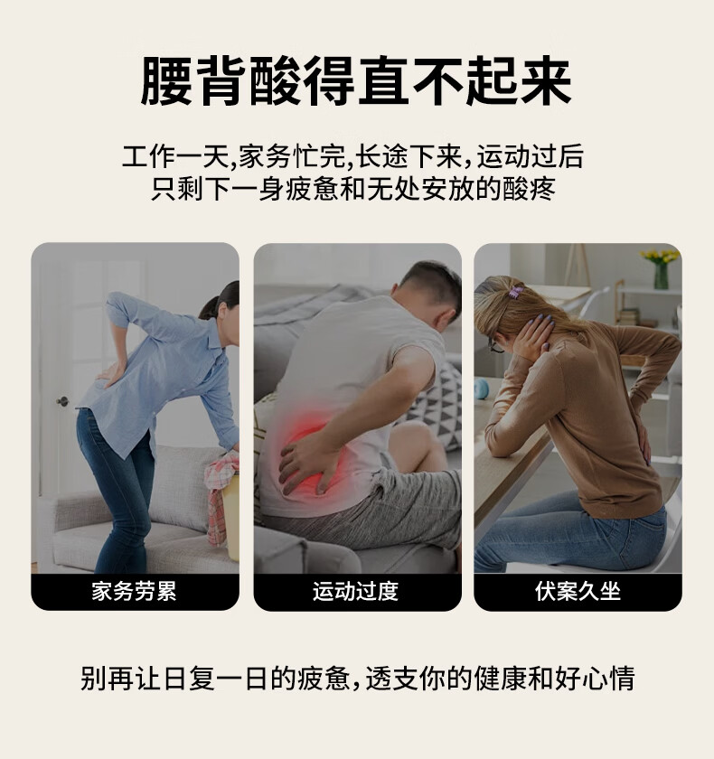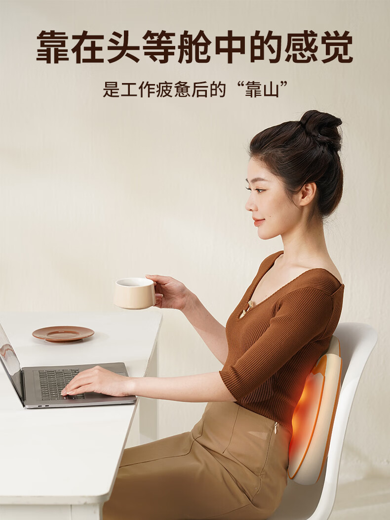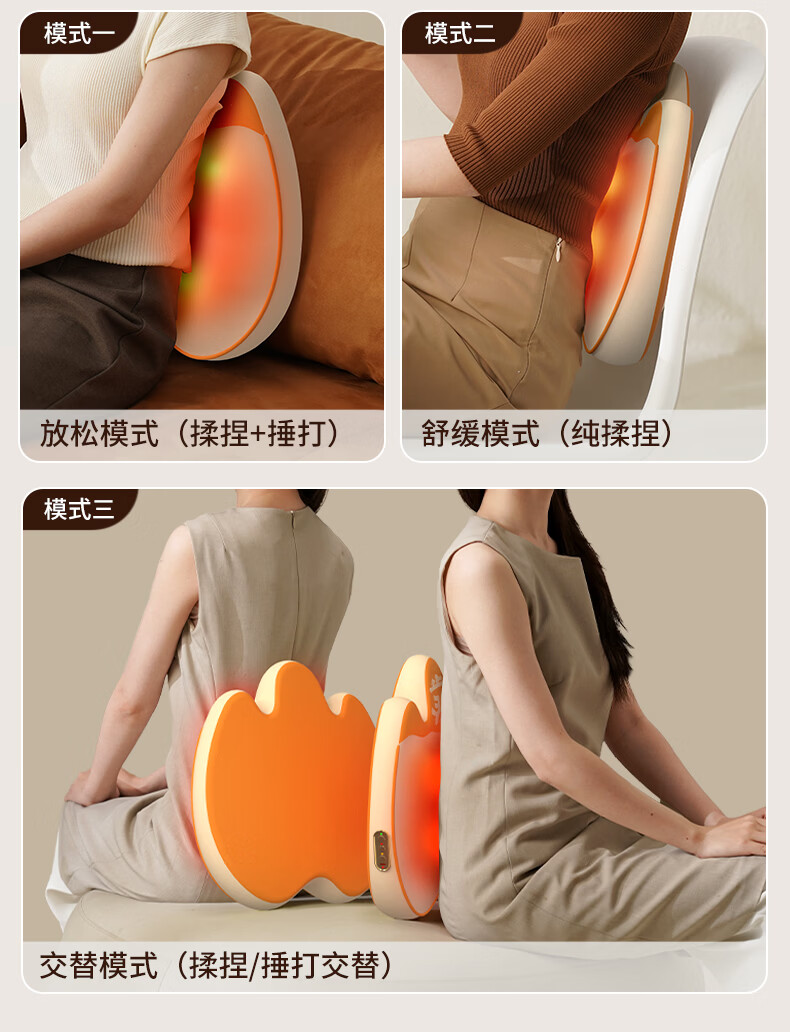 6组浮动按摩头,分区精准施力,上部4组揉捏头;下部2组捶打头;三种模式,随心切换、三档力度可调;材质安全、续航长、无线便携、自动定时