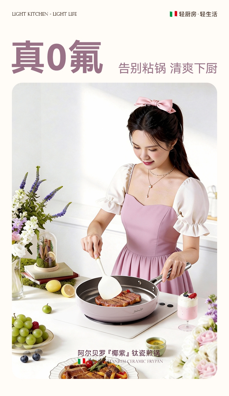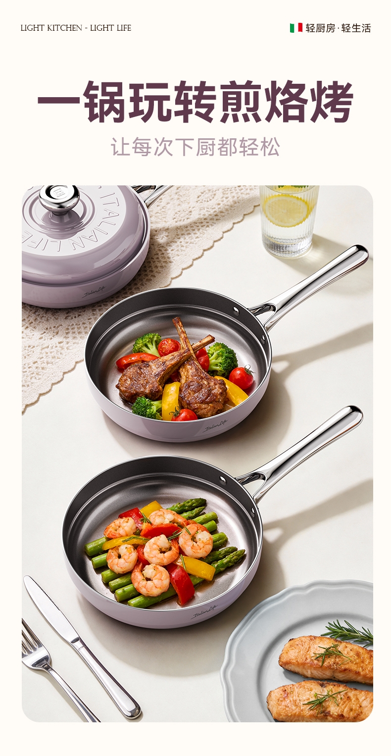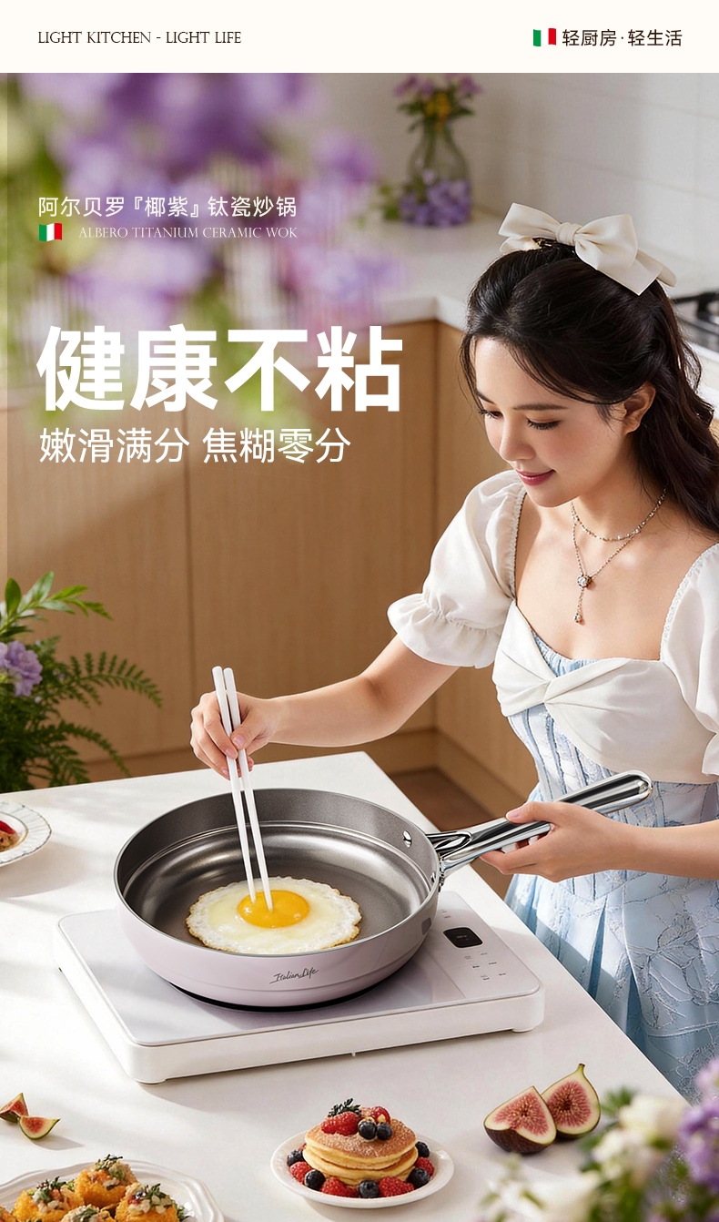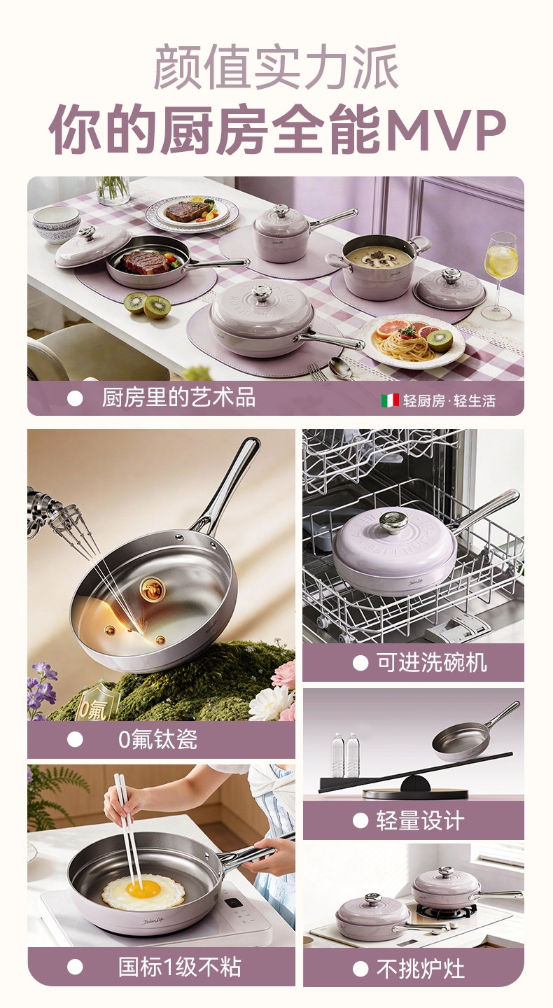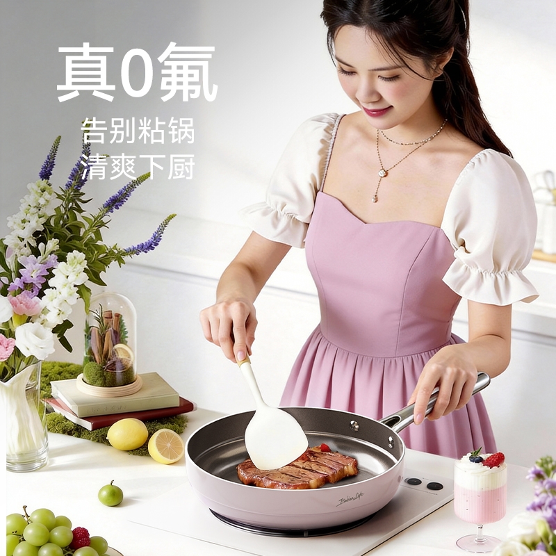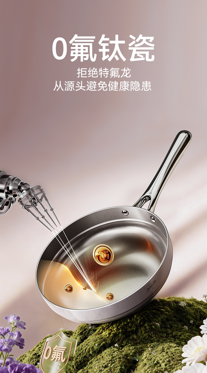 国标1级不粘,钛不粘不糊底;钛瓷革新材质,0氟0析出0涂层;9HV硬度,持久耐磨不粘