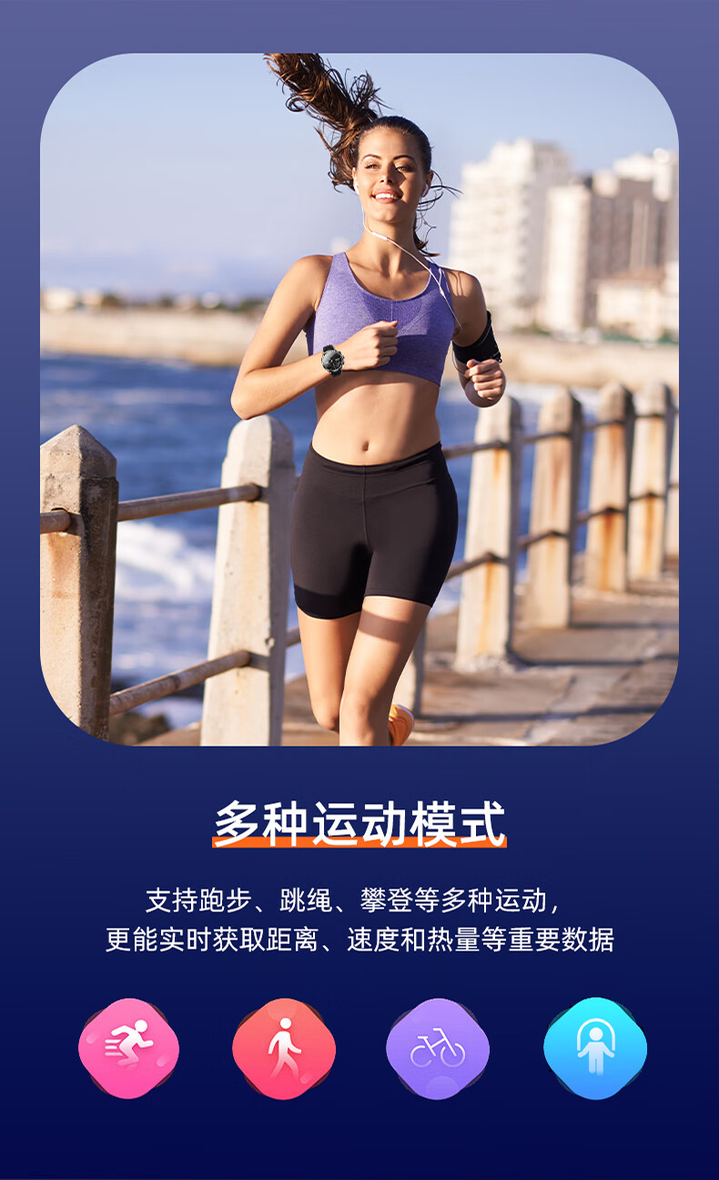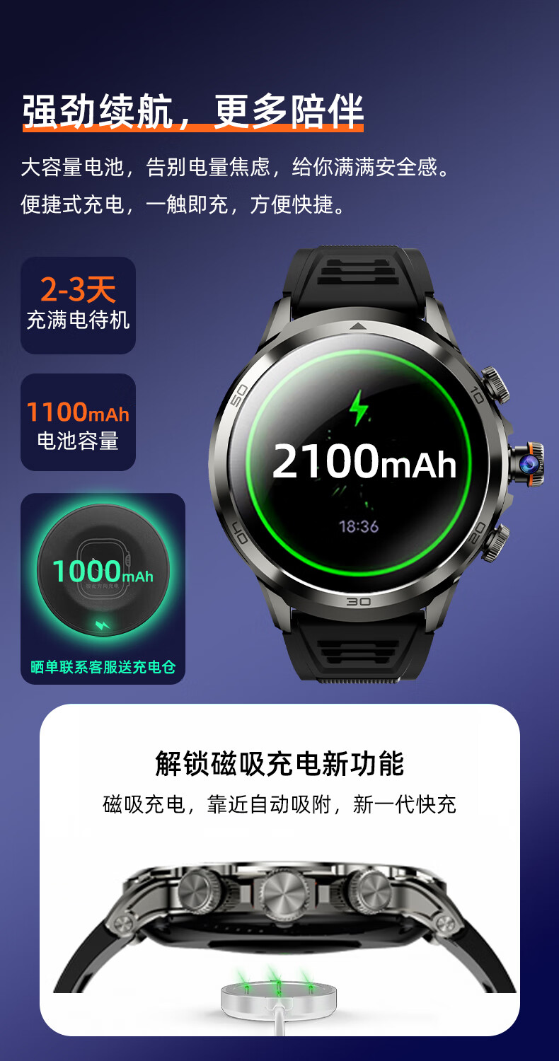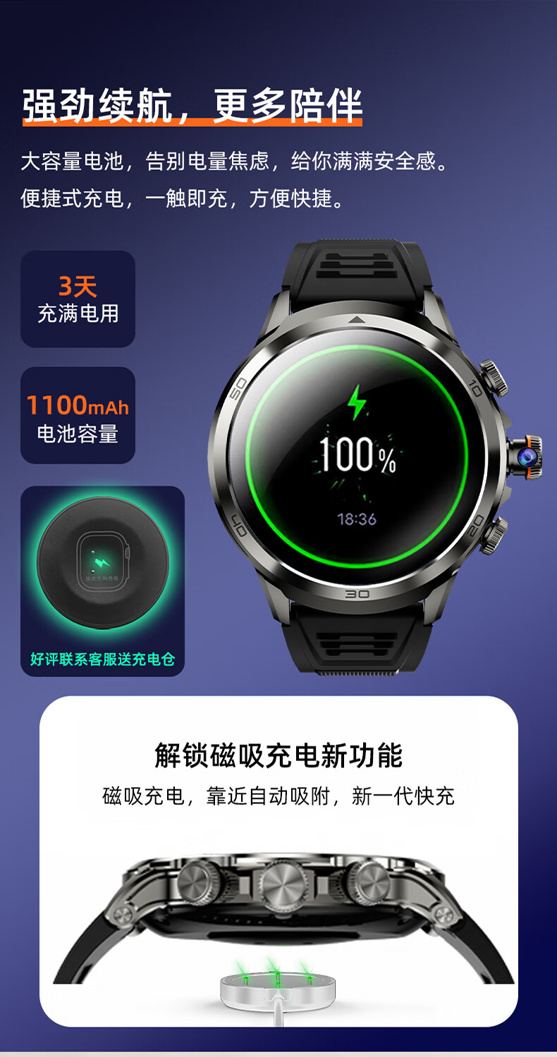 1100mAh大电池,使用2天不断电;IPX7级深度防尘防水;心率、血氧测试,时刻查看自己健康状态