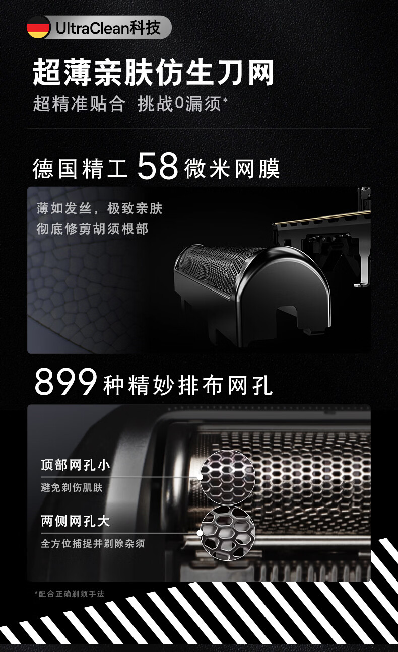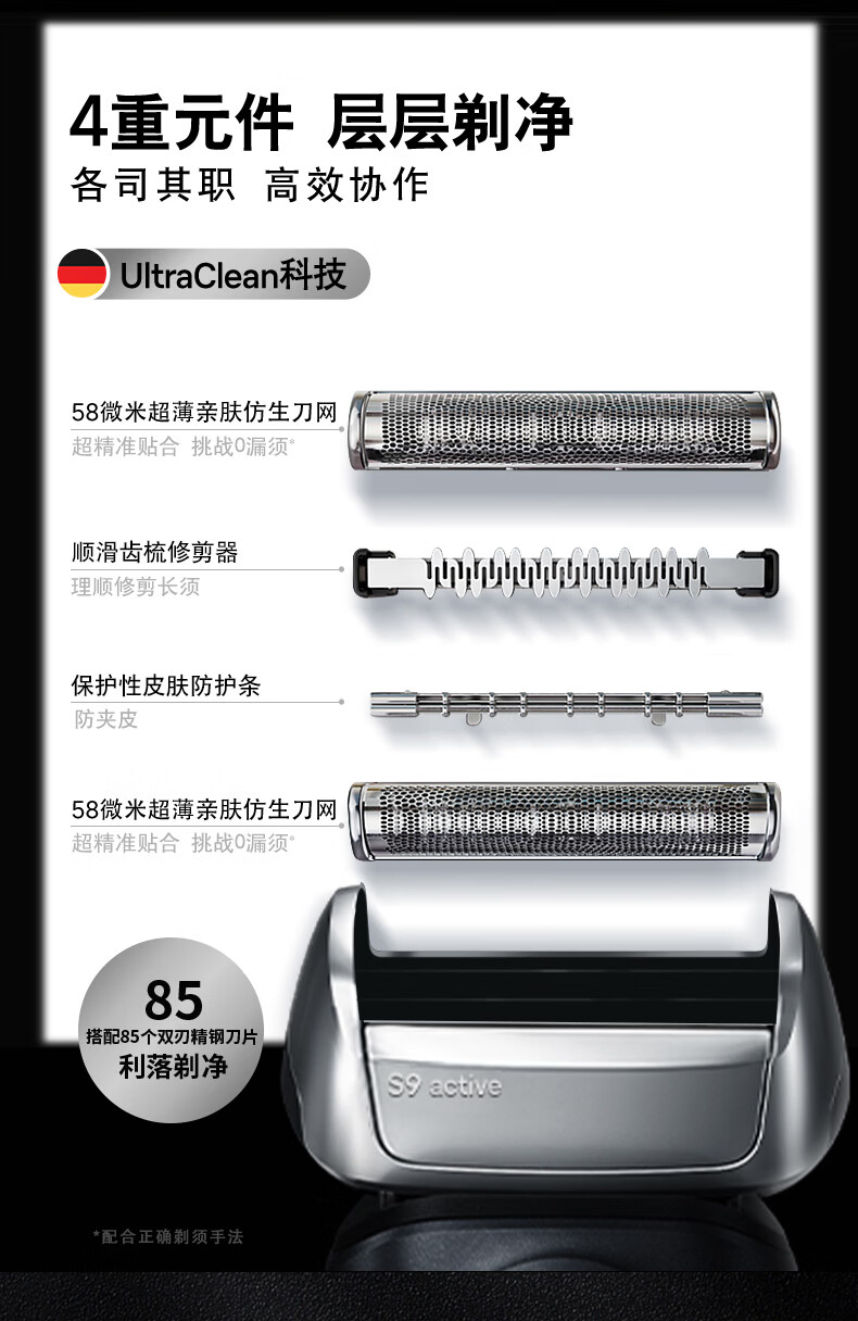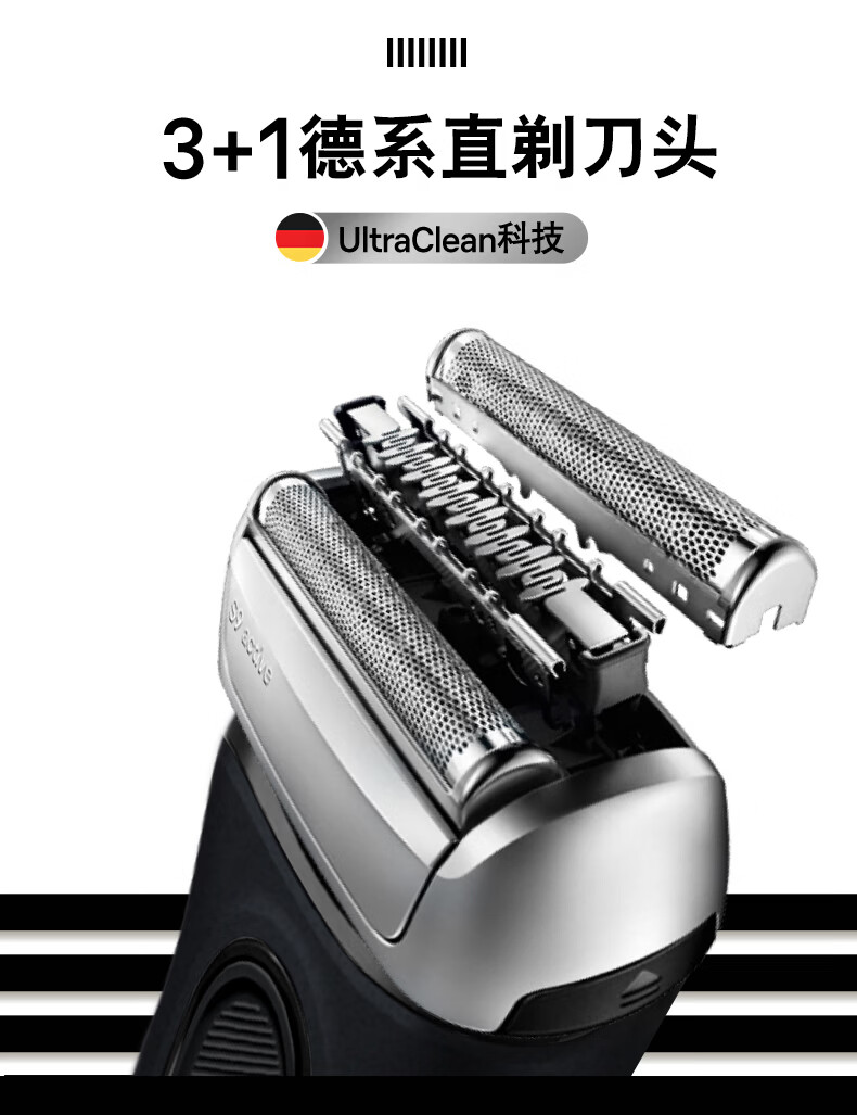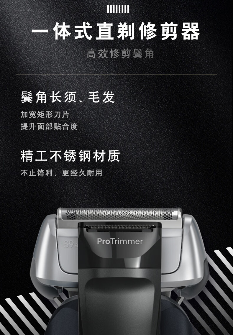 3+1往复式刀头;一体式直剃修剪器,高效修剪鬓角;智能无线旅行盒,持久续航高达6周