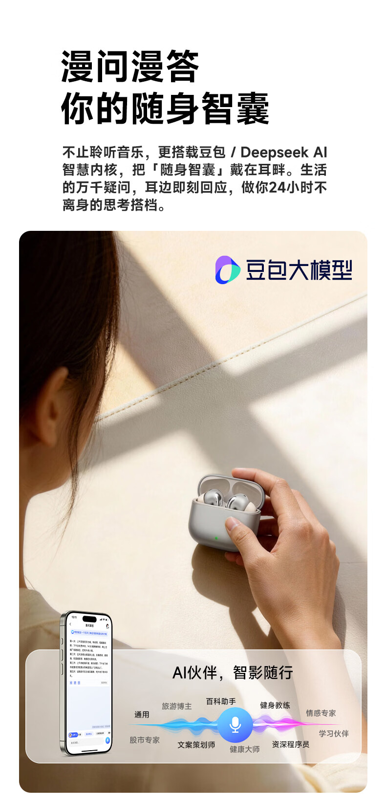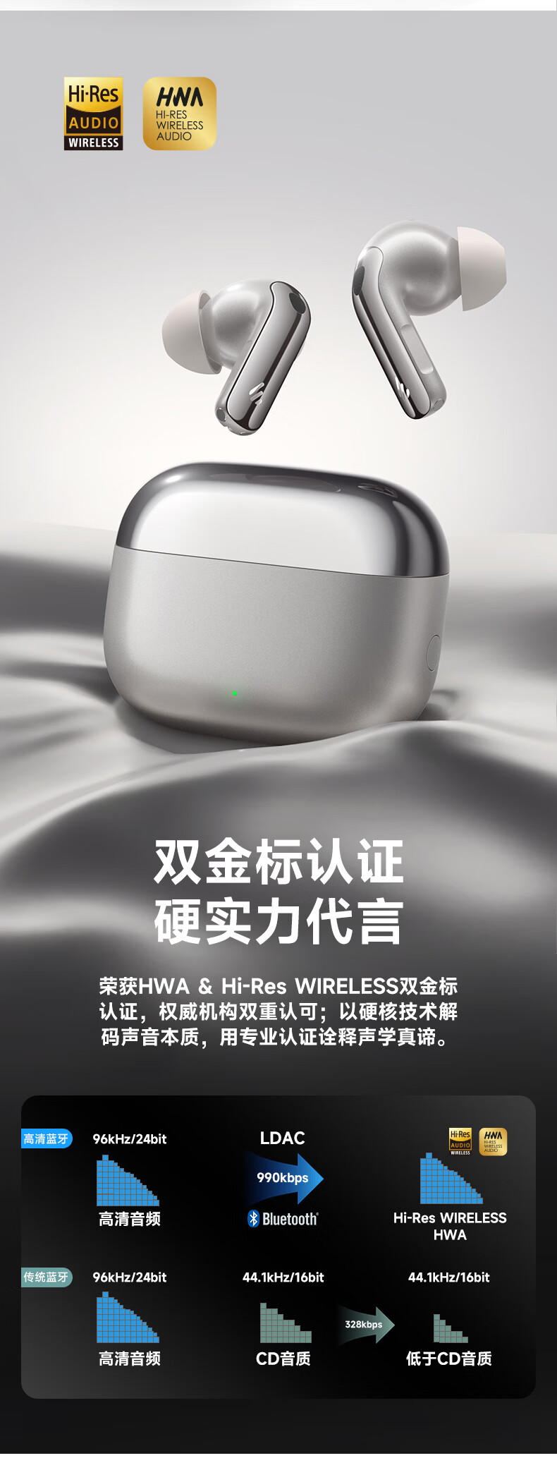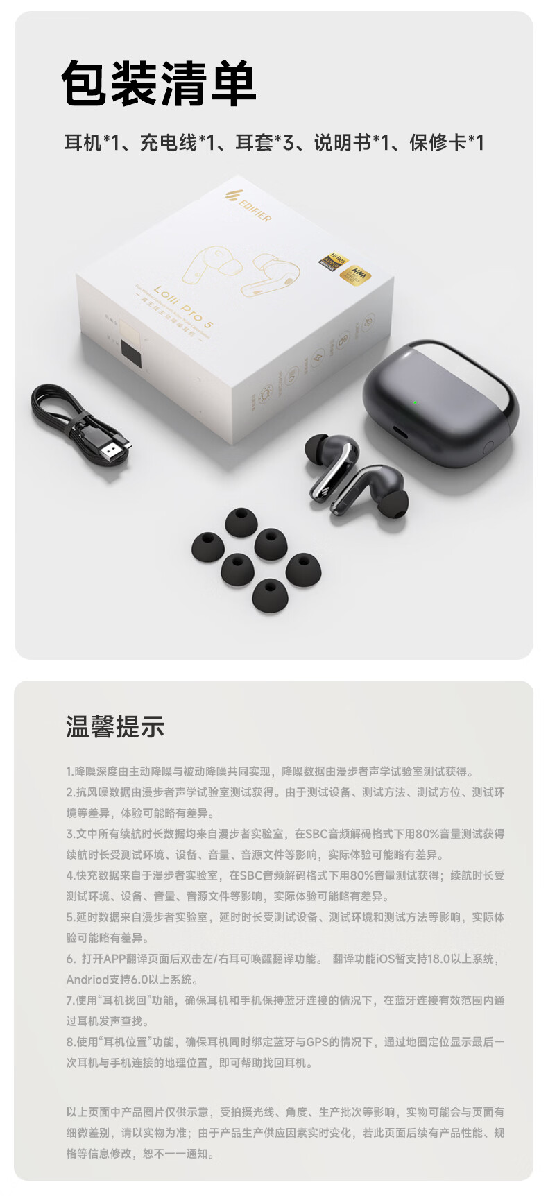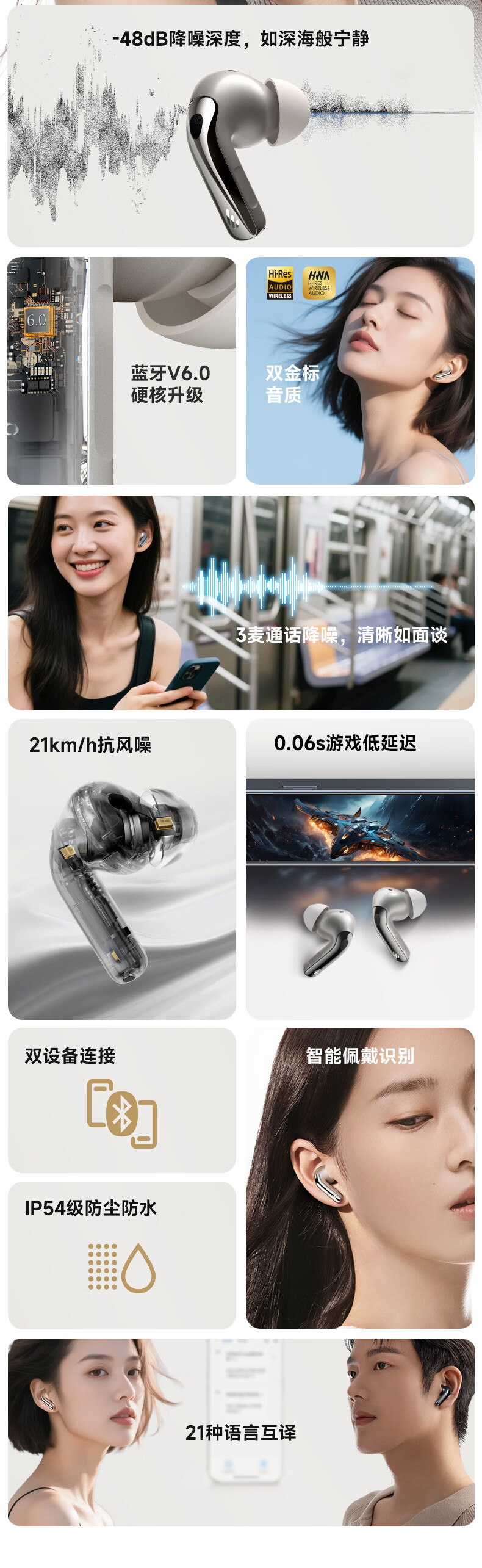 双金标音质,3麦通话降噪; 双设备连接,智能佩戴识别;IP54级防尘防水,21种语言互译