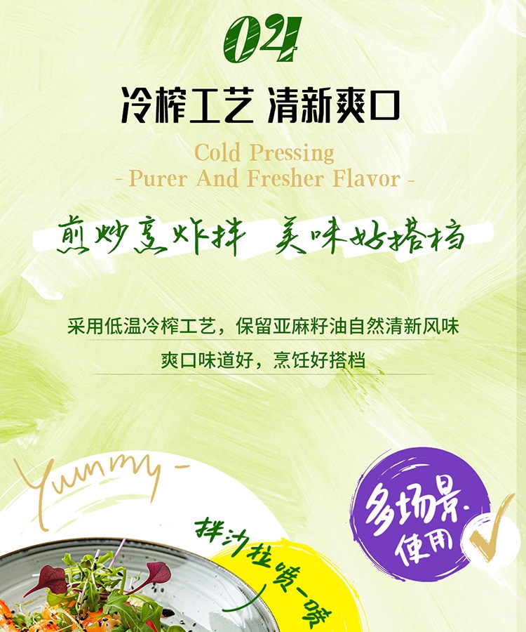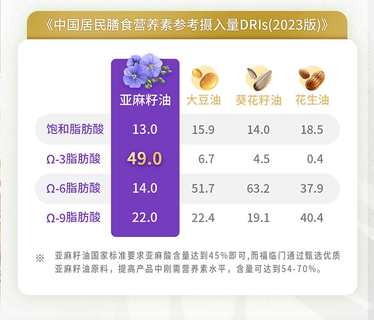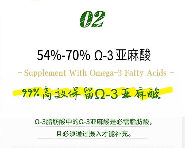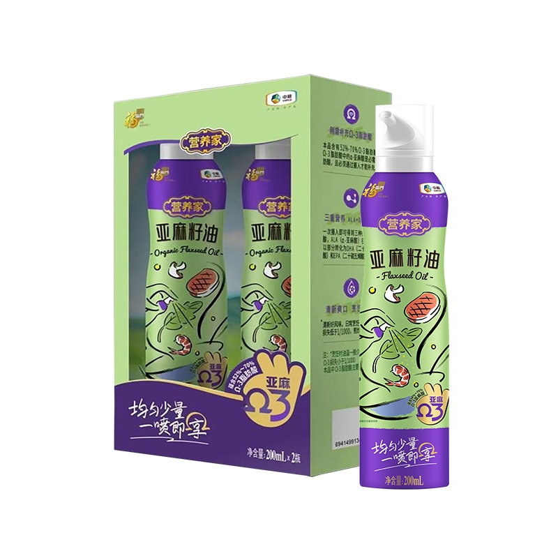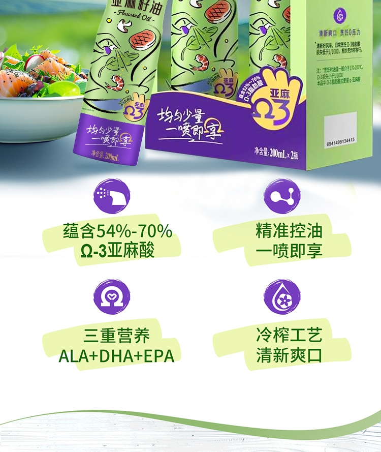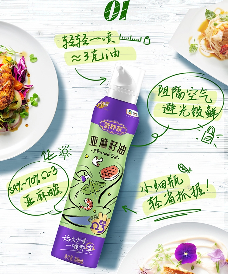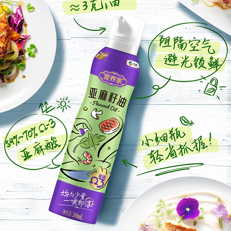 甄选54%-70%更高亚麻酸的亚麻籽油;金属罐体有效隔绝光线、内部密封包装隔绝氧气;独特喷雾设计,创新定量壶嘴