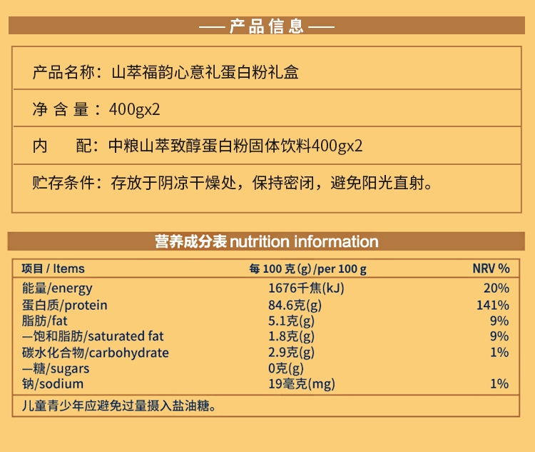 配置清单:净含量:800g 内配: 中粮山萃致醇蛋白粉固体饮料400g*2