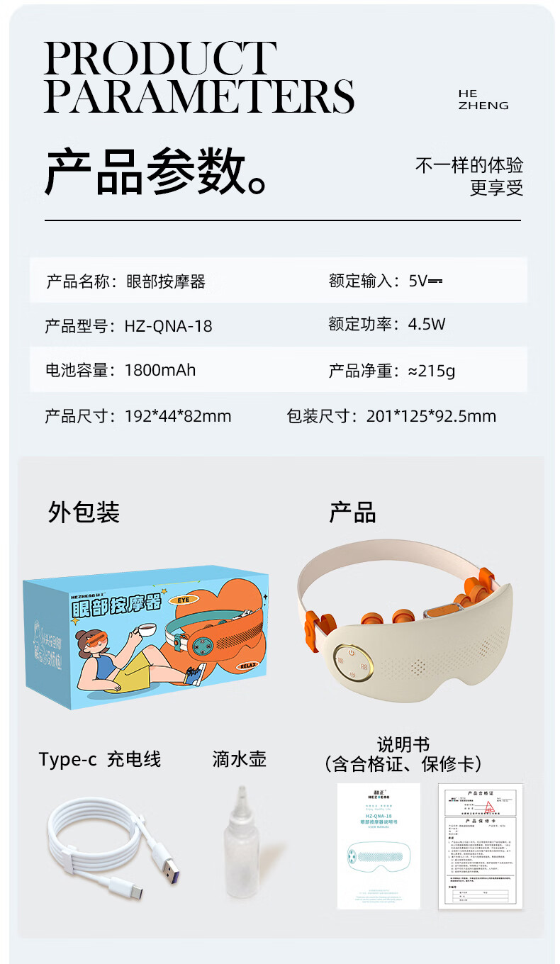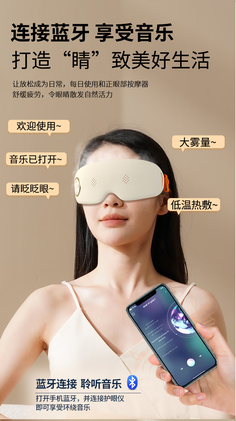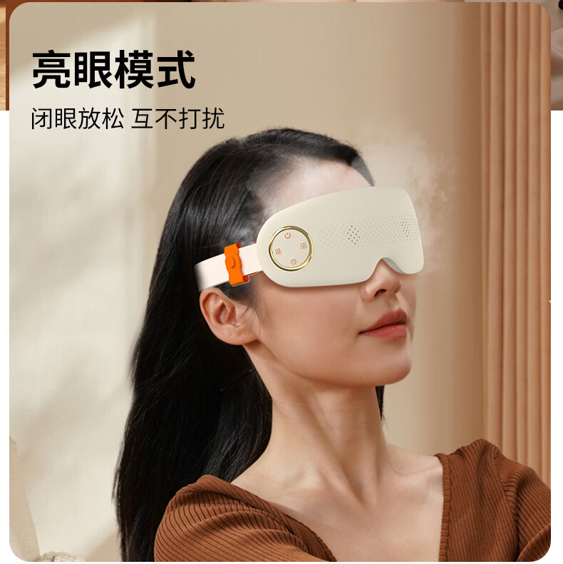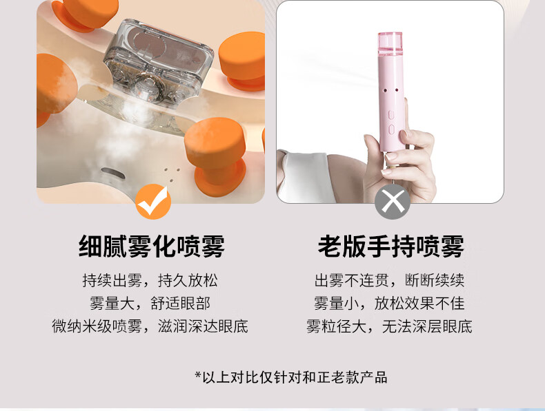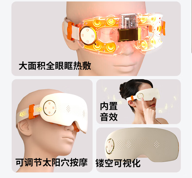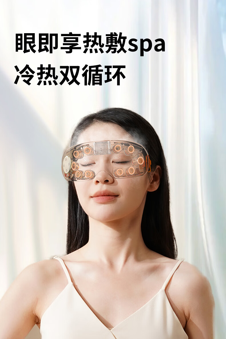 蒸汽雾化(大雾量,小雾量,持续雾化)+按摩舒缓眼部;3D无压贴合技术,无感佩戴,不压眼,硅胶贴合面部;可调节太阳穴按摩,按摩太阳穴,给大脑放个假;中间镂空可视化设计,看得见的安心,学习看书不耽误;新创点穴按摩,点对点匹配眼周,仿生指压振动技术